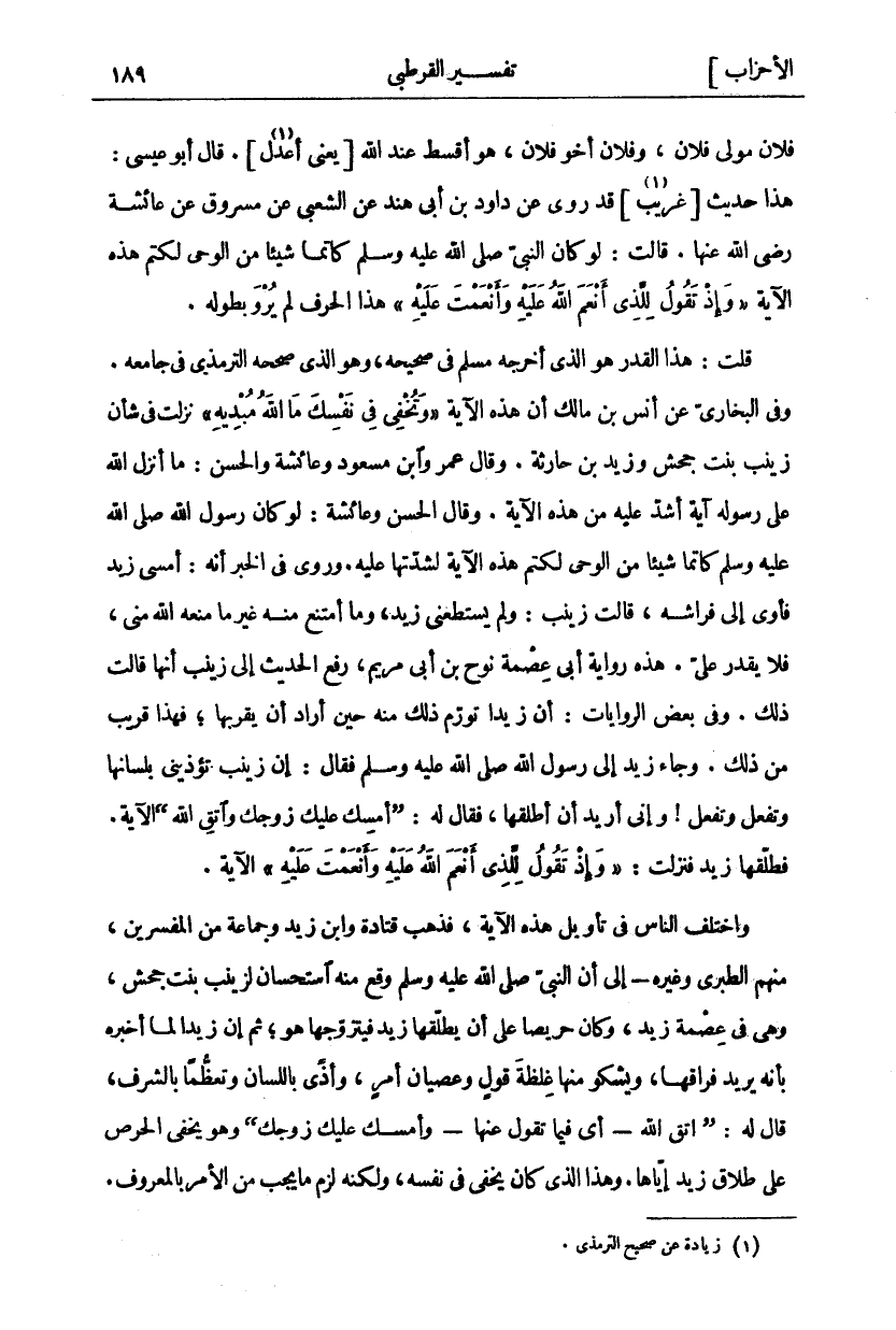 فُلَانٌ مَوْلَى فُلَانٍ، وَفُلَانٌ أَخُو فُلَانٍ، هُوَ أَقْسَطُ عِنْدَ اللَّهِ [يَعْنِي أَعْدَلَ «١»]. قَالَ أَبُو عِيسَى: هَذَا حَدِيثٌ [غَرِيبٌ «٢»] قَدْ رُوِيَ عَنْ دَاوُدَ بْنِ أَبِي هِنْدٍ عَنِ الشَّعْبِيِّ عَنْ مَسْرُوقٍ عَنْ عَائِشَةَ رَضِيَ اللَّهُ عَنْهَا. قَالَتْ: لَوْ كَانَ النَّبِيُّ صَلَّى اللَّهُ عَلَيْهِ وَسَلَّمَ كَاتِمًا شَيْئًا مِنَ الْوَحْيِ لَكَتَمَ هَذِهِ الْآيَةَ" وَإِذْ تَقُولُ لِلَّذِي أَنْعَمَ اللَّهُ عَلَيْهِ وَأَنْعَمْتَ عَلَيْهِ" هَذَا الْحَرْفُ لَمْ يُرْوَ بِطُولِهِ. قُلْتُ: هَذَا الْقَدْرُ هُوَ الَّذِي أَخْرَجَهُ مُسْلِمٌ فِي صَحِيحِهِ، وَهُوَ الَّذِي صَحَّحَهُ التِّرْمِذِيُّ فِي جَامِعِهِ. وَفِي الْبُخَارِيِّ عَنْ أَنَسِ بْنِ مَالِكٍ أَنَّ هَذِهِ الْآيَةَ" وَتُخْفِي فِي نَفْسِكَ مَا اللَّهُ مُبْدِيهِ" نَزَلَتْ فِي شَأْنِ زَيْنَبَ بِنْتِ جَحْشٍ وزيد بن حارثة. وقال عمر وابن مَسْعُودٍ وَعَائِشَةُ وَالْحَسَنُ: مَا أَنْزَلَ اللَّهُ عَلَى رَسُولِهِ آيَةً أَشَدَّ عَلَيْهِ مِنْ هَذِهِ الْآيَةِ. وَقَالَ الْحَسَنُ وَعَائِشَةُ: لَوْ كَانَ رَسُولُ اللَّهِ صَلَّى اللَّهُ عَلَيْهِ وَسَلَّمَ كَاتِمًا شَيْئًا مِنَ الْوَحْيِ لَكَتَمَ هَذِهِ الْآيَةَ لِشِدَّتِهَا عَلَيْهِ. وَرُوِيَ فِي الْخَبَرِ أَنَّهُ: أَمْسَى زَيْدٌ فَأَوَى إِلَى فِرَاشِهِ، قَالَتْ زَيْنَبُ: وَلَمْ يَسْتَطِعْنِي زَيْدٌ، وَمَا أَمْتَنِعُ مِنْهُ غَيْرَ مَا مَنَعَهُ اللَّهُ مِنِّي، فَلَا يَقْدِرُ عَلَيَّ. هَذِهِ رِوَايَةُ أَبِي عِصْمَةَ نُوحِ بْنِ أَبِي مَرْيَمَ، رَفَعَ الْحَدِيثُ إِلَى زَيْنَبَ أَنَّهَا قَالَتْ ذَلِكَ. وَفِي بَعْضِ الرِّوَايَاتِ: أَنَّ زَيْدًا تَوَرَّمَ ذَلِكَ مِنْهُ حِينَ أَرَادَ أَنْ يَقْرَبَهَا، فَهَذَا قَرِيبٌ مِنْ ذَلِكَ. وَجَاءَ زَيْدٌ إِلَى رَسُولِ اللَّهِ صَلَّى اللَّهُ عَلَيْهِ وَسَلَّمَ فَقَالَ: إِنَّ زَيْنَبَ تُؤْذِينِي بِلِسَانِهَا وَتَفْعَلُ وَتَفْعَلُ! وَإِنِّي أُرِيدُ أَنْ أُطَلِّقَهَا، فَقَالَ لَهُ: (أَمْسِكْ عَلَيْكَ زَوْجَكَ وَاتَّقِ اللَّهَ) الْآيَةَ. فَطَلَّقَهَا زَيْدٌ فَنَزَلَتْ:" وَإِذْ تَقُولُ لِلَّذِي أَنْعَمَ اللَّهُ عَلَيْهِ وَأَنْعَمْتَ عَلَيْهِ" الْآيَةَ. وَاخْتَلَفَ النَّاسُ فِي تَأْوِيلِ هَذِهِ الْآيَةِ، فَذَهَبَ قَتَادَةُ وَابْنُ زَيْدٍ وَجَمَاعَةٌ مِنَ الْمُفَسِّرِينَ، مِنْهُمُ الطَّبَرِيُّ وَغَيْرُهُ- إِلَى أَنَّ النَّبِيَّ صَلَّى اللَّهُ عَلَيْهِ وَسَلَّمَ وَقَعَ مِنْهُ اسْتِحْسَانٌ لِزَيْنَبَ بِنْتِ جَحْشٍ، وَهِيَ فِي عِصْمَةِ زَيْدٍ، وَكَانَ حَرِيصًا عَلَى أَنْ يُطَلِّقَهَا زَيْدٌ فَيَتَزَوَّجَهَا هُوَ ثُمَّ إِنَّ زَيْدًا لَمَّا أَخْبَرَهُ بِأَنَّهُ يُرِيدُ فِرَاقَهَا، وَيَشْكُو مِنْهَا غِلْظَةَ قَوْلٍ وَعِصْيَانَ أَمْرٍ، وَأَذًى بِاللِّسَانِ وَتَعَظُّمًا. بِالشَّرَفِ، قَالَ لَهُ: (اتَّقِ اللَّهَ) أَيْ فِيمَا تَقُولُ عنها و (أَمْسِكْ عَلَيْكَ زَوْجَكَ) وَهُوَ يُخْفِي الْحِرْصَ عَلَى طَلَاقِ زَيْدٍ إِيَّاهَا. وَهَذَا الَّذِي كَانَ يُخْفِي فِي نَفْسِهِ، وَلَكِنَّهُ لَزِمَ مَا يَجِبُ مِنَ الْأَمْرِ بالمعروف.