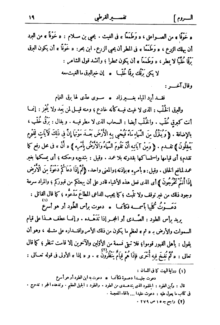 " خَوْفاً" من الصواعق، و"- طَمَعاً" فِي الْغَيْثِ. يَحْيَى بْنُ سَلَّامٍ:" خَوْفاً" مِنَ البرد أن يهلك الزرع، و" طَمَعاً" فِي الْمَطَرِ أَنْ يُحْيِيَ الزَّرْعَ. ابْنُ بَحْرٍ:" خَوْفاً" أَنْ يَكُونَ الْبَرْقُ بَرْقًا خُلَّبًا لَا يمطر، و" طَمَعاً" أَنْ يَكُونَ مُمْطِرًا، وَأَنْشَدَ قَوْلَ الشَّاعِرِ: