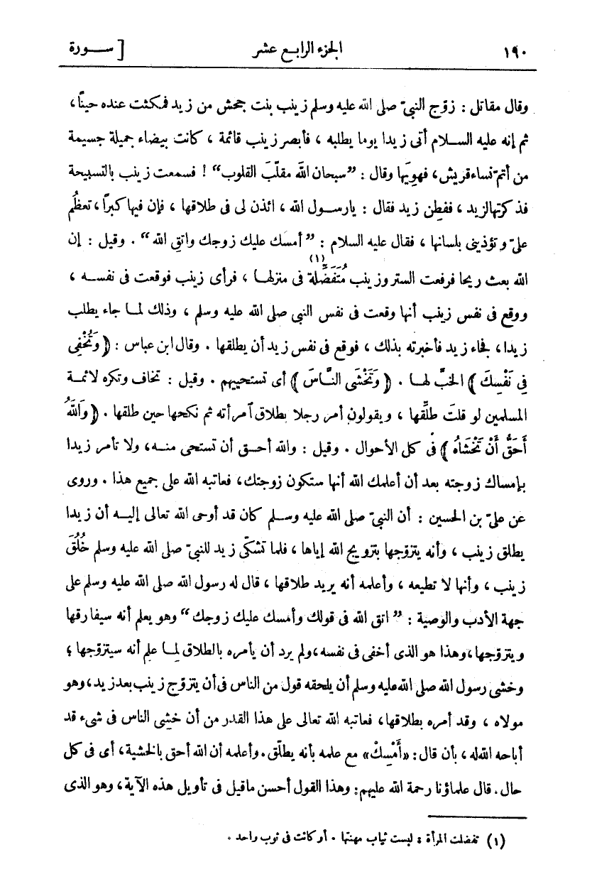 وَقَالَ مُقَاتِلٌ: زَوَّجَ النَّبِيُّ صَلَّى اللَّهُ عَلَيْهِ وَسَلَّمَ زَيْنَبَ بِنْتَ جَحْشٍ مِنْ زَيْدٍ فَمَكَثَتْ عِنْدَهُ حِينًا، ثُمَّ إِنَّهُ عَلَيْهِ السَّلَامُ أَتَى زَيْدًا يَوْمًا يَطْلُبُهُ، فَأَبْصَرَ زَيْنَبَ قَائِمَةً، كَانَتْ بَيْضَاءَ جَمِيلَةً جَسِيمَةً مِنْ أَتَمِّ نِسَاءِ قُرَيْشٍ، فَهَوِيَهَا وَقَالَ: (سُبْحَانَ اللَّهِ مُقَلِّبِ الْقُلُوبِ)! فَسَمِعَتْ زَيْنَبُ بِالتَّسْبِيحَةِ فَذَكَرَتْهَا لِزَيْدٍ، فَفَطِنَ زَيْدٌ فَقَالَ: يَا رَسُولَ اللَّهِ، ائْذَنْ لِي فِي طَلَاقِهَا، فَإِنَّ فِيهَا كِبْرًا، تَعْظُمُ عَلَيَّ وَتُؤْذِينِي بِلِسَانِهَا، فَقَالَ عَلَيْهِ السَّلَامُ: (أَمْسِكْ عَلَيْكَ زَوْجَكَ وَاتَّقِ اللَّهَ). وَقِيلَ: إِنَّ اللَّهَ بَعَثَ رِيحًا فَرَفَعَتِ السِّتْرَ وَزَيْنَبُ مُتَفَضِّلَةً «١» فِي مَنْزِلِهَا، فَرَأَى زَيْنَبَ فَوَقَعَتْ فِي نَفْسِهِ، وَوَقَعَ فِي نَفْسِ زَيْنَبَ أَنَّهَا وَقَعَتْ فِي نَفْسِ النَّبِيِّ صَلَّى اللَّهُ عَلَيْهِ وَسَلَّمَ وَذَلِكَ لَمَّا جَاءَ يَطْلُبُ زَيْدًا، فَأَخْبَرَتْهُ بِذَلِكَ، فَوَقَعَ فِي نَفْسِ زَيْدٍ أَنْ يُطَلِّقَهَا. وَقَالَ ابْنُ عَبَّاسٍ:" وَتُخْفِي فِي نَفْسِكَ" الْحُبَّ لَهَا." وَتَخْشَى النَّاسَ" أَيْ تَسْتَحْيِيهِمْ وَقِيلَ: تَخَافُ وَتَكْرَهُ لَائِمَةَ الْمُسْلِمِينَ لَوْ قُلْتَ طَلِّقْهَا، وَيَقُولُونَ أَمَرَ رَجُلًا بِطَلَاقِ امْرَأَتِهِ ثُمَّ نَكَحَهَا حِينَ طَلَّقَهَا." وَاللَّهُ أَحَقُّ أَنْ تَخْشاهُ" فِي كُلِّ الْأَحْوَالِ. وَقِيلَ: وَاللَّهُ أَحَقُّ أَنْ تَسْتَحِيَ مِنْهُ، وَلَا تَأْمُرَ زَيْدًا بِإِمْسَاكِ زَوْجَتِهِ بَعْدَ أَنْ أَعْلَمَكَ اللَّهُ أَنَّهَا سَتَكُونُ زَوْجَتَكَ، فَعَاتَبَهُ اللَّهُ عَلَى جَمِيعِ هَذَا. وَرُوِيَ عَنْ عَلِيِّ بْنِ الْحُسَيْنِ: أَنَّ النَّبِيَّ صَلَّى اللَّهُ عَلَيْهِ وَسَلَّمَ كَانَ قَدْ أَوْحَى اللَّهُ تَعَالَى إِلَيْهِ أَنَّ زَيْدًا يُطَلِّقُ زَيْنَبَ، وَأَنَّهُ يَتَزَوَّجُهَا بِتَزْوِيجِ اللَّهِ إِيَّاهَا، فَلَمَّا تَشَكَّى زَيْدٌ لِلنَّبِيِّ صَلَّى اللَّهُ عَلَيْهِ وَسَلَّمَ خُلُقَ زَيْنَبَ، وَأَنَّهَا لَا تُطِيعُهُ، وَأَعْلَمَهُ أَنَّهُ يُرِيدُ طَلَاقَهَا، قَالَ لَهُ رَسُولُ اللَّهِ صَلَّى اللَّهُ عَلَيْهِ وَسَلَّمَ على جِهَةِ الْأَدَبِ وَالْوَصِيَّةِ: (اتَّقِ اللَّهَ فِي قَوْلِكَ وأَمْسِكْ عَلَيْكَ زَوْجَكَ) وَهُوَ يَعْلَمُ أَنَّهُ سَيُفَارِقُهَا وَيَتَزَوَّجُهَا، وَهَذَا هُوَ الَّذِي أَخْفَى فِي نَفْسِهِ، وَلَمْ يُرِدْ أَنْ يَأْمُرَهُ بِالطَّلَاقِ لِمَا عَلِمَ أَنَّهُ سَيَتَزَوَّجُهَا، وَخَشِيَ رَسُولُ اللَّهِ صَلَّى اللَّهُ عَلَيْهِ وَسَلَّمَ أَنْ يَلْحَقَهُ قَوْلٌ مِنَ النَّاسِ فِي أَنْ يَتَزَوَّجَ زَيْنَبَ بَعْدَ زَيْدٍ، وَهُوَ مَوْلَاهُ، وَقَدْ أَمَرَهُ بِطَلَاقِهَا، فَعَاتَبَهُ اللَّهُ تَعَالَى عَلَى هَذَا الْقَدْرِ مِنْ أَنْ خَشِيَ النَّاسَ في شي قَدْ أَبَاحَهُ اللَّهُ لَهُ، بِأَنْ قَالَ:" أَمْسِكْ" مَعَ عِلْمِهِ بِأَنَّهُ يُطَلِّقُ. وَأَعْلَمَهُ أَنَّ اللَّهَ أَحَقُّ بِالْخَشْيَةِ، أَيْ فِي كُلِّ حَالٍ. قَالَ عُلَمَاؤُنَا رَحْمَةُ اللَّهِ عَلَيْهِمْ: وَهَذَا الْقَوْلُ أَحْسَنُ مَا قِيلَ فِي تَأْوِيلِ هَذِهِ الْآيَةِ، وَهُوَ الذي