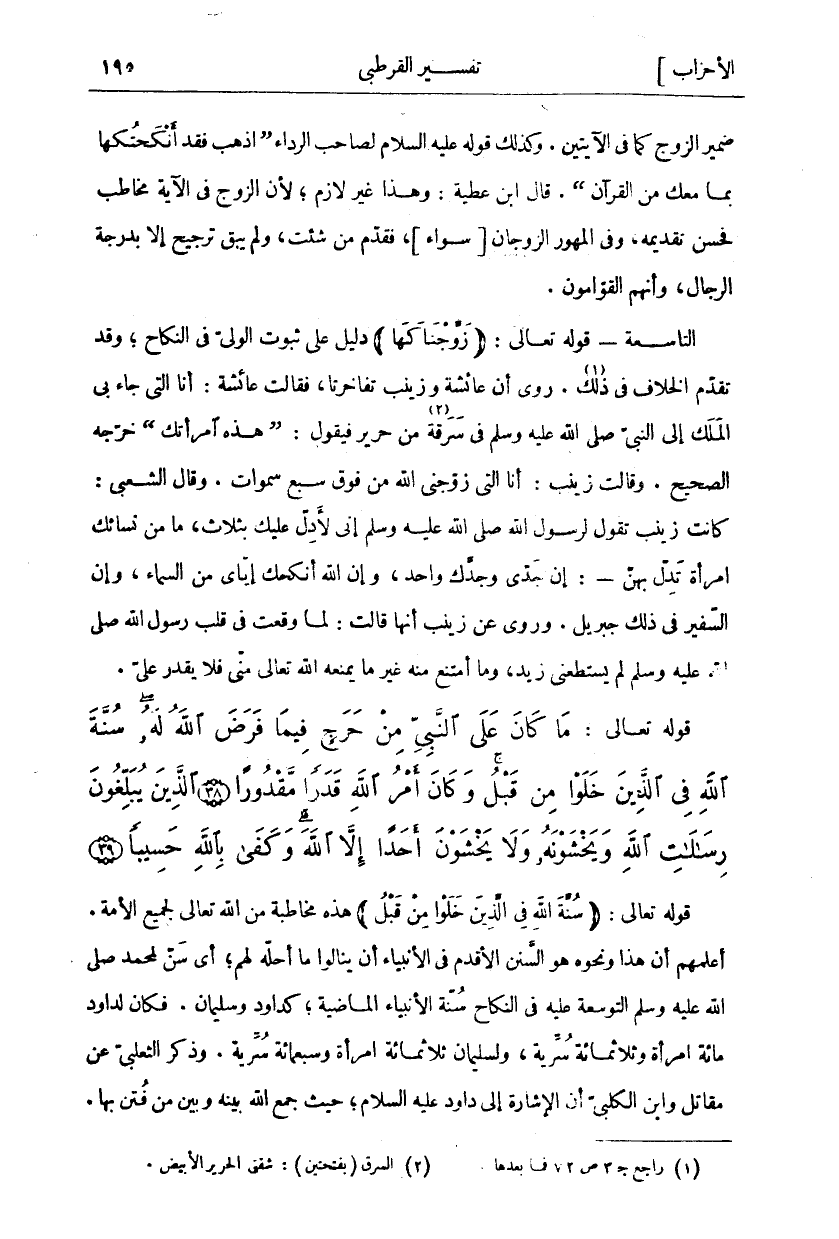 قَوْلُهُ تَعَالَى: (سُنَّةَ اللَّهِ فِي الَّذِينَ خَلَوْا مِنْ قَبْلُ) هَذِهِ مُخَاطَبَةٌ مِنَ اللَّهِ تَعَالَى لِجَمِيعِ الْأُمَّةِ. أَعْلَمَهُمْ أَنَّ هَذَا وَنَحْوَهُ هُوَ السُّنَنُ الْأَقْدَمُ فِي الْأَنْبِيَاءِ أَنْ يَنَالُوا مَا أَحَلَّهُ لَهُمْ، أَيْ سُنَّ لِمُحَمَّدٍ صَلَّى اللَّهُ عَلَيْهِ وَسَلَّمَ التَّوْسِعَةُ عَلَيْهِ فِي النِّكَاحِ سُنَّةَ الْأَنْبِيَاءِ الْمَاضِيَةِ، كَدَاوُدَ وَسُلَيْمَانَ. فَكَانَ لِدَاوُدَ مِائَةُ امْرَأَةٍ وَثَلَاثُمِائَةِ سُرِّيَّةٍ، وَلِسُلَيْمَانَ ثَلَاثُمِائَةِ امْرَأَةٍ وَسَبْعُمِائَةِ سُرِّيَّةٍ. وَذَكَرَ الثَّعْلَبِيُّ عَنْ مُقَاتِلٍ وَابْنِ الْكَلْبِيِّ أَنَّ الْإِشَارَةَ إِلَى دَاوُدَ عَلَيْهِ السَّلَامُ، حَيْثُ جَمَعَ اللَّهُ بَيْنَهُ وَبَيْنَ مَنْ فُتِنَ بِهَا.