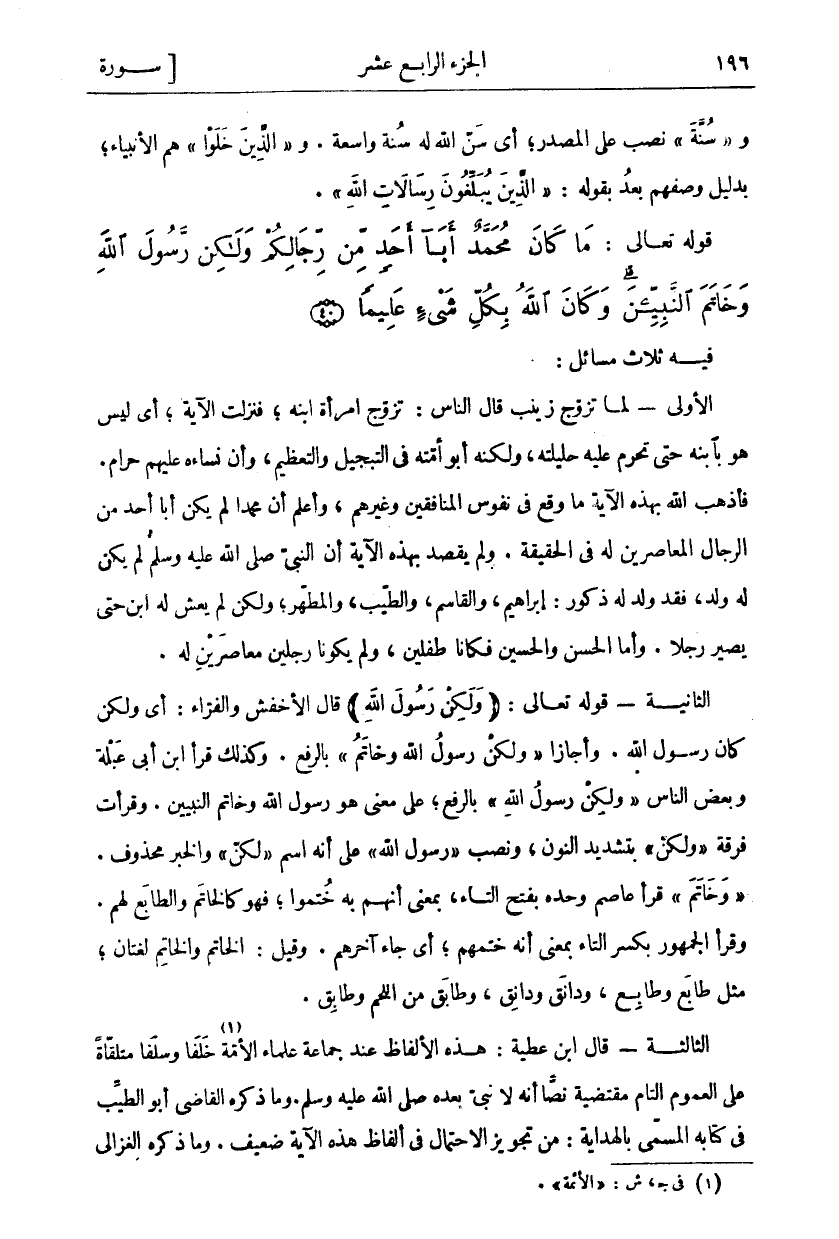 مَا كانَ مُحَمَّدٌ أَبا أَحَدٍ مِنْ رِجالِكُمْ وَلكِنْ رَسُولَ اللَّهِ وَخاتَمَ النَّبِيِّينَ وَكانَ اللَّهُ بِكُلِّ شَيْءٍ عَلِيماً (٤٠)