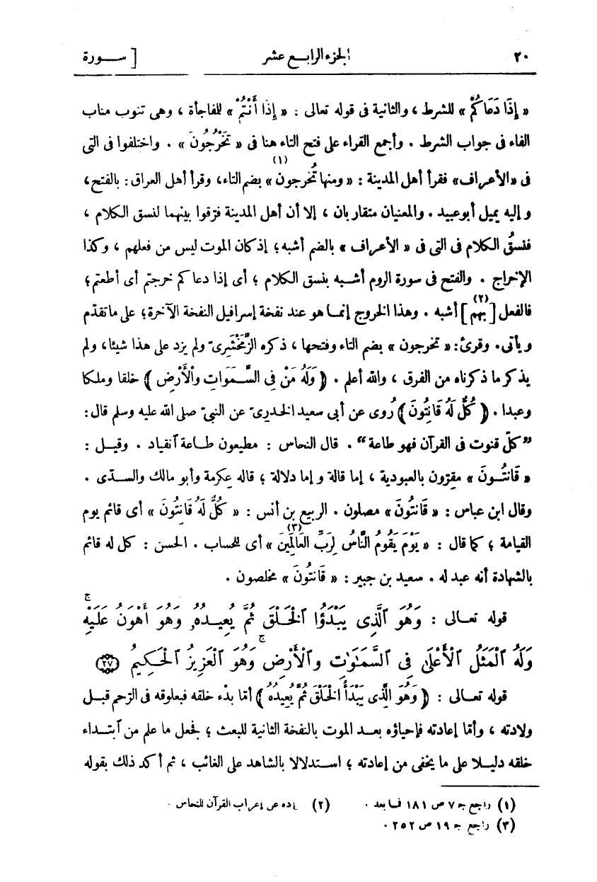 " إِذا دَعاكُمْ" لِلشَّرْطِ، وَالثَّانِيَةُ فِي قَوْلُهُ تَعَالَى:" إِذا أَنْتُمْ" لِلْمُفَاجَأَةِ، وَهِيَ تَنُوبُ مَنَابَ الْفَاءِ فِي جَوَابِ الشَّرْطِ. وَأَجْمَعَ الْقُرَّاءَ عَلَى فَتْحِ التَّاءِ هُنَا فِي" تَخْرُجُونَ". وَاخْتَلَفُوا فِي الَّتِي فِي" الْأَعْرَافِ" فَقَرَأَ أَهْلُ الْمَدِينَةِ:" وَمِنْها تُخْرَجُونَ" «١» [الأعراف: ٢٥] بِضَمِّ التَّاءِ، وَقَرَأَ أَهْلُ الْعِرَاقِ: بِالْفَتْحِ، وَإِلَيْهِ يَمِيلُ أَبُو عُبَيْدٍ. وَالْمَعْنَيَانِ مُتَقَارِبَانِ، إِلَّا أَنَّ أَهْلَ الْمَدِينَةِ فَرَّقُوا بَيْنَهُمَا لِنَسَقِ الْكَلَامِ، فَنَسَقُ الْكَلَامِ فِي الَّتِي فِي" الْأَعْرَافِ" بِالضَّمِّ أَشْبَهُ، إِذْ كَانَ الْمَوْتُ لَيْسَ مِنْ فِعْلِهِمْ، وَكَذَا الْإِخْرَاجُ. وَالْفَتْحُ فِي سُورَةِ الرُّومِ أَشْبَهُ بِنَسَقِ الْكَلَامِ، أَيْ إِذَا دَعَاكُمْ خَرَجْتُمْ أَيْ أَطَعْتُمْ، فَالْفِعْلُ [بِهِمْ «٢»] أَشْبَهُ. وَهَذَا الْخُرُوجُ إِنَّمَا هُوَ عِنْدَ نَفْخَةِ إِسْرَافِيلَ النَّفْخَةَ الْآخِرَةَ، عَلَى مَا تقدم ويأتي. وقرى:" تُخْرَجُونَ" بِضَمِّ التَّاءِ وَفَتْحِهَا، ذَكَرَهُ الزَّمَخْشَرِيُّ وَلَمْ يَزِدْ عَلَى هَذَا شَيْئًا، وَلَمْ يَذْكُرْ مَا ذَكَرْنَاهُ مِنَ الْفَرْقِ، وَاللَّهُ أَعْلَمُ. (وَلَهُ مَنْ فِي السَّماواتِ وَالْأَرْضِ) خَلْقًا وَمِلْكًا وَعَبْدًا. (كُلٌّ لَهُ قانِتُونَ) رُوِيَ عَنْ أَبِي سَعِيدٍ الْخُدْرِيِّ عَنِ النَّبِيِّ صَلَّى اللَّهُ عَلَيْهِ وَسَلَّمَ قَالَ: (كُلُّ قُنُوتٍ فِي الْقُرْآنِ فَهُوَ طَاعَةٌ). قَالَ النَّحَّاسُ: مُطِيعُونَ طَاعَةَ انْقِيَادٍ. وَقِيلَ:" قانِتُونَ" مُقِرُّونَ بِالْعُبُودِيَّةِ، إِمَّا قَالَةً وَإِمَّا دَلَالَةً، قَالَهُ عِكْرِمَةُ وَأَبُو مَالِكٍ وَالسُّدِّيُّ. وَقَالَ ابْنُ عَبَّاسٍ:" قانِتُونَ" مُصَلُّونَ. الرَّبِيعُ بْنُ أَنَسٍ:" كُلٌّ لَهُ قانِتُونَ" أَيْ قَائِمٌ يَوْمَ الْقِيَامَةِ، كَمَا قَالَ:" يَوْمَ يَقُومُ النَّاسُ لِرَبِّ الْعالَمِينَ" «٣» [المطففين: ٦] أَيْ لِلْحِسَابِ. الْحَسَنُ: كُلٌّ لَهُ قَائِمٌ بِالشَّهَادَةِ أَنَّهُ عَبْدٌ لَهُ. سَعِيدُ بْنُ جُبَيْرٍ:" قانِتُونَ" مخلصون.