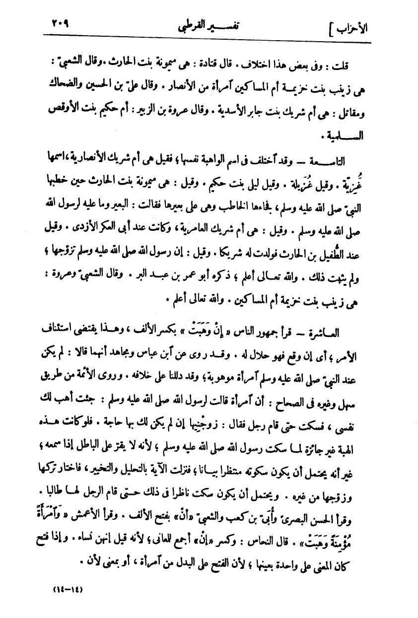 قُلْتُ: وَفِي بَعْضِ هَذَا اخْتِلَافٌ. قَالَ قَتَادَةُ: هِيَ مَيْمُونَةُ بِنْتُ الْحَارِثِ. وَقَالَ الشَّعْبِيُّ: هِيَ زَيْنَبُ بِنْتُ خُزَيْمَةَ أُمُّ الْمَسَاكِينِ امْرَأَةٌ مِنَ الْأَنْصَارِ. وَقَالَ عَلِيُّ بْنُ الْحُسَيْنِ وَالضَّحَّاكُ وَمُقَاتِلٌ: هِيَ أُمُّ شَرِيكٍ بِنْتُ جَابِرٍ الْأَسَدِيَّةُ. وَقَالَ عُرْوَةُ بْنُ الزُّبَيْرِ: أُمُّ حَكِيمٍ بِنْتُ الْأَوْقَصِ السُّلَمِيَّةُ. التَّاسِعَةُ- وَقَدِ اخْتُلِفَ فِي اسْمِ الْوَاهِبَةِ نفسها، فقيل هي أم شريك الْأَنْصَارِيَّةُ، اسْمُهَا غُزَيَّةُ. وَقِيلَ غُزَيْلَةُ. وَقِيلَ لَيْلَى بِنْتُ حَكِيمٍ. وَقِيلَ: هِيَ مَيْمُونَةُ بِنْتُ الْحَارِثِ حِينَ خَطَبَهَا النَّبِيُّ صَلَّى اللَّهُ عَلَيْهِ وَسَلَّمَ، فَجَاءَهَا الْخَاطِبُ وَهِيَ عَلَى بَعِيرِهَا فَقَالَتْ: الْبَعِيرُ وَمَا عَلَيْهِ لِرَسُولِ اللَّهِ صَلَّى اللَّهُ عَلَيْهِ وَسَلَّمَ. وَقِيلَ: هِيَ أُمُّ شَرِيكٍ الْعَامِرِيَّةُ، وَكَانَتْ عِنْدَ أَبِي الْعَكَرِ الْأَزْدِيِّ. وَقِيلَ عِنْدَ. الطُّفَيْلِ بْنِ الْحَارِثِ فَوَلَدَتْ لَهُ شَرِيكًا. وَقِيلَ: إِنَّ رَسُولَ اللَّهِ صَلَّى اللَّهُ عَلَيْهِ وَسَلَّمَ تزوجها، وَلَمْ يَثْبُتْ ذَلِكَ. وَاللَّهُ تَعَالَى أَعْلَمُ، ذَكَرَهُ أَبُو عُمَرَ بْنُ عَبْدِ الْبَرِّ. وَقَالَ الشَّعْبِيُّ وعروة: هي زَيْنَبُ بِنْتُ خُزَيْمَةَ أُمُّ الْمَسَاكِينِ. وَاللَّهُ تَعَالَى أَعْلَمُ. الْعَاشِرَةُ- قَرَأَ جُمْهُورُ النَّاسِ" إِنْ وَهَبَتْ" بِكَسْرِ الْأَلِفِ، وَهَذَا يَقْتَضِي اسْتِئْنَافَ الْأَمْرِ، أَيْ إِنْ وَقَعَ فَهُوَ حَلَالٌ لَهُ. وَقَدْ رُوِيَ عَنِ ابْنِ عَبَّاسٍ وَمُجَاهِدٍ أَنَّهُمَا قَالَا: لَمْ يَكُنْ عِنْدَ النَّبِيِّ صَلَّى اللَّهُ عَلَيْهِ وَسَلَّمَ امْرَأَةٌ مَوْهُوبَةٌ، وَقَدْ دَلَّلْنَا عَلَى خِلَافِهِ. وَرَوَى الْأَئِمَّةُ مِنْ طَرِيقِ سَهْلٍ وَغَيْرِهِ فِي الصِّحَاحِ: أَنَّ امْرَأَةً قَالَتْ لِرَسُولِ اللَّهِ صَلَّى اللَّهُ عَلَيْهِ وَسَلَّمَ: جِئْتُ أَهَبُ لَكَ نَفْسِي، فَسَكَتَ حَتَّى قَامَ رَجُلٌ فَقَالَ: زَوِّجْنِيهَا إِنْ لَمْ يَكُنْ لَكَ بِهَا حَاجَةٌ. فَلَوْ كَانَتْ هَذِهِ الْهِبَةُ غَيْرَ جَائِزَةٍ لَمَا سَكَتَ رَسُولِ اللَّهِ صَلَّى اللَّهُ عَلَيْهِ وَسَلَّمَ لِأَنَّهُ لَا يُقِرُّ عَلَى الْبَاطِلِ إِذَا سَمِعَهُ، غَيْرَ أَنَّهُ يَحْتَمِلُ أَنْ يَكُونَ سُكُوتُهُ مُنْتَظِرًا بَيَانًا، فَنَزَلَتِ الْآيَةُ. بِالتَّحْلِيلِ وَالتَّخْيِيرِ، فَاخْتَارَ تَرْكَهَا وَزَوَّجَهَا مِنْ غَيْرِهِ. وَيَحْتَمِلُ أَنْ يَكُونَ سَكَتَ نَاظِرًا فِي ذَلِكَ حَتَّى قَامَ الرَّجُلُ لَهَا طَالِبًا. وَقَرَأَ الْحَسَنُ الْبَصْرِيُّ وَأُبَيُّ بْنُ كَعْبٍ وَالشَّعْبِيُّ" أَنْ" بِفَتْحِ الْأَلِفِ. وَقَرَأَ الْأَعْمَشُ" وَامْرَأَةً مُؤْمِنَةً وَهَبَتْ". قَالَ النَّحَّاسُ: وَكَسْرُ" إِنْ" أَجْمَعُ لِلْمَعَانِي، لِأَنَّهُ قِيلَ إِنَّهُنَّ نِسَاءٌ. وَإِذَا فُتِحَ كَانَ الْمَعْنَى عَلَى وَاحِدَةٍ بِعَيْنِهَا، لِأَنَّ الْفَتْحَ عَلَى الْبَدَلِ مِنِ امْرَأَةٍ، أَوْ بِمَعْنَى لِأَنَّ.