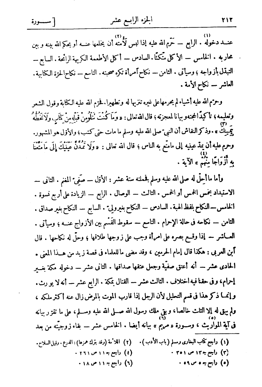عِنْدَ دُخُولِهِ «١». الرَّابِعُ- حَرَّمَ اللَّهُ عَلَيْهِ إِذَا لَبِسَ لَأْمَتَهُ «٢» أَنْ يَخْلَعَهَا عَنْهُ أَوْ يَحْكُمَ اللَّهُ بَيْنَهُ وَبَيْنَ مُحَارِبِهِ. الْخَامِسُ- الْأَكْلُ مُتَّكِئًا. السَّادِسُ- أَكْلُ الْأَطْعِمَةِ الْكَرِيهَةِ الرَّائِحَةِ. السَّابِعُ- التَّبَدُّلُ بِأَزْوَاجِهِ، وَسَيَأْتِي. الثَّامِنُ- نِكَاحُ امْرَأَةٍ تَكْرَهُ صُحْبَتَهُ. التَّاسِعُ- نِكَاحُ الْحُرَّةِ الْكِتَابِيَّةِ. الْعَاشِرُ- نِكَاحُ الْأَمَةِ. وَحَرَّمَ اللَّهُ عَلَيْهِ أَشْيَاءَ لَمْ يُحَرِّمْهَا عَلَى غَيْرِهِ تَنْزِيهًا لَهُ وَتَطْهِيرًا. فَحَرَّمَ اللَّهُ عَلَيْهِ الْكِتَابَةَ وَقَوْلَ الشِّعْرِ وَتَعْلِيمِهِ، تَأْكِيدًا لِحُجَّتِهِ وَبَيَانًا لمعجزته قال الله تعالى:" وَما كُنْتَ تَتْلُوا مِنْ قَبْلِهِ مِنْ كِتابٍ وَلا تَخُطُّهُ بِيَمِينِكَ" «٣» [العنكبوت: ٤٨]. وَذَكَرَ النَّقَّاشُ أَنَّ النَّبِيَّ صَلَّى اللَّهُ عَلَيْهِ وَسَلَّمَ مَا مَاتَ حَتَّى كَتَبَ، وَالْأَوَّلُ هُوَ الْمَشْهُورُ. وَحُرِّمَ عَلَيْهِ أَنْ يَمُدَّ عَيْنَيْهِ إِلَى مَا مُتِّعَ بِهِ النَّاسُ، قَالَ اللَّهُ تَعَالَى:" لَا تَمُدَّنَّ عَيْنَيْكَ إِلى مَا مَتَّعْنا بِهِ أَزْواجاً مِنْهُمْ" «٤» [الحجر: ٨٨] الْآيَةَ. وَأَمَّا مَا أُحِلَّ لَهُ صَلَّى اللَّهُ عَلَيْهِ وَسَلَّمَ فَجُمْلَتُهُ سِتَّةَ عَشَرَ: الْأَوَّلُ- صَفِيُّ الْمَغْنَمِ. الثَّانِي- الِاسْتِبْدَادُ بِخُمُسِ الْخُمُسِ أَوِ الْخُمُسِ. الثَّالِثُ- الْوِصَالُ. الرَّابِعُ- الزِّيَادَةُ عَلَى أَرْبَعِ نِسْوَةٍ. الْخَامِسُ- النِّكَاحُ بِلَفْظِ الْهِبَةِ. السَّادِسُ- النِّكَاحُ بِغَيْرِ وَلِيٍّ. السَّابِعُ- النِّكَاحُ بِغَيْرِ صَدَاقٍ. الثَّامِنُ- نِكَاحُهُ فِي حَالَةِ الْإِحْرَامِ. التَّاسِعُ- سُقُوطُ الْقَسْمِ بَيْنَ الْأَزْوَاجِ عَنْهُ، وَسَيَأْتِي. الْعَاشِرُ- إِذَا وَقَعَ بَصَرُهُ عَلَى امْرَأَةٍ وَجَبَ عَلَى زَوْجِهَا طَلَاقُهَا، وَحَلَّ لَهُ نِكَاحُهَا. قَالَ ابْنُ الْعَرَبِيِّ: هَكَذَا قَالَ إِمَامُ الْحَرَمَيْنِ، وَقَدْ مَضَى مَا لِلْعُلَمَاءِ فِي قِصَّةِ زَيْدٍ مِنْ هَذَا الْمَعْنَى. الْحَادِي عَشَرَ- أَنَّهُ أَعْتَقَ صَفِيَّةَ وَجَعَلَ عِتْقَهَا صَدَاقَهَا. الثَّانِي عشر- دخوله مَكَّةَ بِغَيْرِ إِحْرَامٍ، وَفِي حَقِّنَا فِيهِ اخْتِلَافٌ. الثَّالِثَ عَشَرَ- الْقِتَالُ بِمَكَّةَ. الرَّابِعَ عَشَرَ- أَنَّهُ لَا يُورَثُ. وَإِنَّمَا ذُكِرَ هَذَا فِي قِسْمِ التَّحْلِيلِ لِأَنَّ الرَّجُلَ إِذَا قَارَبَ الْمَوْتَ بِالْمَرَضِ زَالَ عَنْهُ أَكْثَرُ مِلْكِهِ، وَلَمْ يَبْقَ لَهُ إِلَّا الثُّلُثُ خَالِصًا، وَبَقِيَ مِلْكُ رَسُولُ اللَّهِ صَلَّى اللَّهُ عَلَيْهِ وَسَلَّمَ عَلَى مَا تَقَرَّرَ بَيَانُهُ فِي آيَةِ الْمَوَارِيثِ «٥»، وَسُورَةِ" مَرْيَمَ" «٦» بَيَانُهُ أَيْضًا. الْخَامِسَ عَشَرَ- بَقَاءُ زَوْجِيَّتِهِ مِنْ بَعْدِ