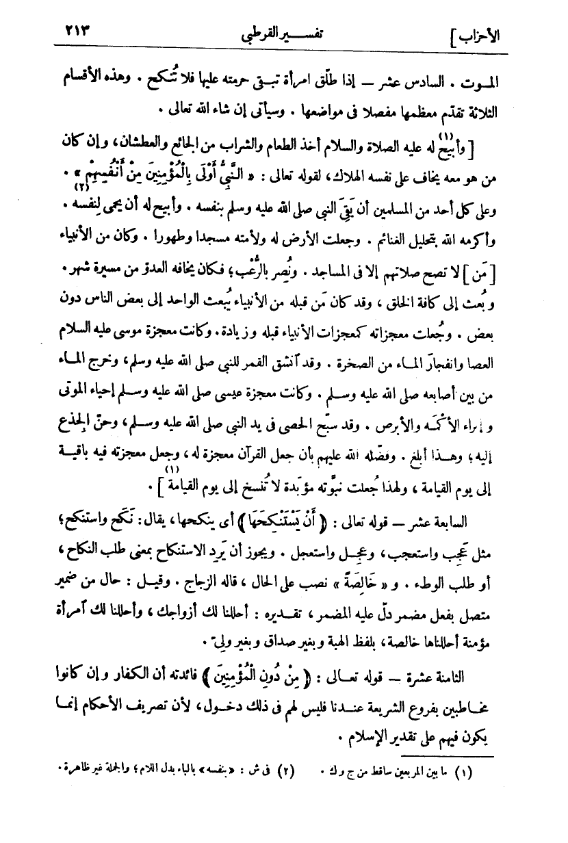 الْمَوْتِ. السَّادِسَ عَشَرَ- إِذَا طَلَّقَ امْرَأَةً تَبْقَى حُرْمَتُهُ عَلَيْهَا فَلَا تُنْكَحُ. وَهَذِهِ الْأَقْسَامُ الثَّلَاثَةُ تَقَدَّمَ مُعْظَمُهَا مُفَصَّلًا فِي مَوَاضِعِهَا. وَسَيَأْتِي إِنْ شَاءَ اللَّهُ تَعَالَى. [وَأُبِيحَ «١» لَهُ عَلَيْهِ الصَّلَاةُ وَالسَّلَامُ أَخْذُ الطَّعَامِ وَالشَّرَابِ مِنَ الْجَائِعِ وَالْعَطْشَانِ، وَإِنْ كَانَ مَنْ هُوَ مَعَهُ يَخَافُ عَلَى نَفْسِهِ الْهَلَاكَ، لِقَوْلِهِ تَعَالَى:" النَّبِيُّ أَوْلى بِالْمُؤْمِنِينَ مِنْ أَنْفُسِهِمْ" [الأحزاب: ٦]. وَعَلَى كُلِّ أَحَدٍ مِنَ الْمُسْلِمِينَ أَنْ يَقِيَ النَّبِيَّ صَلَّى اللَّهُ عَلَيْهِ وَسَلَّمَ بِنَفْسِهِ. وَأُبِيحَ لَهُ أَنْ يَحْمِيَ لِنَفْسِهِ «٢». وَأَكْرَمَهُ اللَّهُ بِتَحْلِيلِ الْغَنَائِمِ. وَجُعِلَتِ الْأَرْضُ لَهُ وَلِأُمَّتِهِ مَسْجِدًا وَطَهُورًا. وَكَانَ مِنَ الْأَنْبِيَاءِ [مَنْ] لَا تَصِحُّ صَلَاتُهُمْ إِلَّا فِي الْمَسَاجِدِ. وَنُصِرَ بِالرُّعْبِ، فَكَانَ يَخَافُهُ الْعَدُوُّ مِنْ مَسِيرَةِ شَهْرٍ. وَبُعِثَ إِلَى كَافَّةِ الْخَلْقِ، وَقَدْ كَانَ مَنْ قَبْلَهُ مِنَ الْأَنْبِيَاءِ يُبْعَثُ الْوَاحِدُ إِلَى بَعْضِ النَّاسِ دُونَ بَعْضٍ. وَجُعِلَتْ مُعْجِزَاتُهُ كَمُعْجِزَاتِ الْأَنْبِيَاءِ قَبْلَهُ وَزِيَادَةً. وَكَانَتْ مُعْجِزَةُ مُوسَى عَلَيْهِ السَّلَامُ الْعَصَا وَانْفِجَارَ الْمَاءِ مِنَ الصَّخْرَةِ. وَقَدْ انْشَقَّ الْقَمَرُ لِلنَّبِيِّ صَلَّى اللَّهُ عَلَيْهِ وَسَلَّمَ وَخَرَجَ الْمَاءُ مِنْ بَيْنِ أَصَابِعِهِ صَلَّى اللَّهُ عَلَيْهِ وَسَلَّمَ. وَكَانَتْ مُعْجِزَةُ عِيسَى صَلَّى اللَّهُ عَلَيْهِ وَسَلَّمَ إِحْيَاءَ الْمَوْتَى وَإِبْرَاءَ الْأَكْمَهِ وَالْأَبْرَصِ. وَقَدْ سَبَّحَ الْحَصَى فِي يَدِ النَّبِيِّ صَلَّى اللَّهُ عَلَيْهِ وَسَلَّمَ، وَحَنَّ الْجِذْعُ إِلَيْهِ، وَهَذَا أَبْلَغُ. وَفَضَّلَهُ اللَّهُ عَلَيْهِمْ بِأَنْ جَعَلَ الْقُرْآنَ مُعْجِزَةً لَهُ، وَجَعَلَ مُعْجِزَتَهُ فِيهِ بَاقِيَةً إِلَى يَوْمِ الْقِيَامَةِ، وَلِهَذَا جُعِلَتْ نُبُوَّتُهُ مُؤَبَّدَةً لَا تُنْسَخُ إِلَى يَوْمِ الْقِيَامَةِ «٣»]. السابعة عشر- قوله تعالى: (أَنْ يَسْتَنْكِحَها) أَيْ يَنْكِحَهَا يُقَالُ: نَكَحَ وَاسْتَنْكَحَ مِثْلُ عَجِبَ وَاسْتَعْجَبَ وَعَجِلَ وَاسْتَعْجَلَ. وَيَجُوزُ أَنْ يَرِدُ الِاسْتِنْكَاحُ بِمَعْنَى طَلَبِ النِّكَاحِ أَوْ طَلَبِ الوطي. و (خالِصَةً) نصب على الحال قاله الزَّجَّاجُ. وَقِيلَ: حَالَ مِنْ ضَمِيرٍ مُتَّصِلٍ بِفِعْلٍ مُضْمَرٍ دَلَّ عَلَيْهِ الْمُضْمَرُ تَقْدِيرُهُ: أَحْلَلْنَا لَكَ أَزْوَاجَكَ وَأَحْلَلْنَا لَكَ امْرَأَةً مُؤْمِنَةً أَحْلَلْنَاهَا خَالِصَةً بلفظ الهبة وبغير صداق وبغير ولى. الثامنة عشرة- قَوْلُهُ تَعَالَى: (مِنْ دُونِ الْمُؤْمِنِينَ) فَائِدَتُهُ أَنَّ الْكُفَّارَ وَإِنْ كَانُوا مُخَاطَبِينَ بِفُرُوعِ الشَّرِيعَةِ عِنْدَنَا فَلَيْسَ لَهُمْ فِي ذَلِكَ دُخُولٌ، لِأَنَّ تَصْرِيفَ الْأَحْكَامِ إِنَّمَا يَكُونُ فِيهِمْ عَلَى تَقْدِيرِ الْإِسْلَامِ.