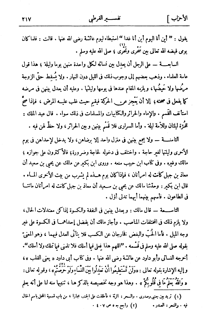 يَقُولُ: (أَيْنَ أَنَا الْيَوْمَ أَيْنَ أَنَا غَدًا) اسْتِبْطَاءً لِيَوْمِ عَائِشَةَ رَضِيَ اللَّهُ عَنْهَا. قَالَتْ: فَلَمَّا كَانَ يَوْمِي قَبَضَهُ اللَّهُ تَعَالَى بَيْنَ سَحْرِي وَنَحْرِي «١»، صَلَّى اللَّهُ عَلَيْهِ وَسَلَّمَ السَّابِعَةُ- عَلَى الرَّجُلِ أَنْ يَعْدِلَ بَيْنَ نِسَائِهِ لِكُلِ وَاحِدَةٍ مِنْهُنَّ يَوْمًا وَلَيْلَةً، هَذَا قَوْلُ عَامَّةِ الْعُلَمَاءِ. وَذَهَبَ بَعْضُهُمْ إِلَى وُجُوبِ ذَلِكَ فِي اللَّيْلِ دُونَ النَّهَارِ. وَلَا يُسْقِطُ حَقَّ الزَّوْجَةِ مَرَضُهَا وَلَا حَيْضُهَا، وَيَلْزَمُهُ الْمُقَامُ عِنْدَهَا فِي يَوْمِهَا وَلَيْلَتِهَا. وَعَلَيْهِ أَنْ يَعْدِلَ بَيْنَهُنَّ فِي مَرَضِهِ كَمَا يَفْعَلُ فِي صِحَّتِهِ، إِلَّا أَنْ يَعْجِزَ عَنِ الْحَرَكَةِ فَيُقِيمَ حَيْثُ غَلَبَ عَلَيْهِ الْمَرَضُ، فَإِذَا صَحَّ اسْتَأْنَفَ الْقَسْمَ. وَالْإِمَاءُ وَالْحَرَائِرُ وَالْكِتَابِيَّاتُ وَالْمُسْلِمَاتُ فِي ذَلِكَ سَوَاءٌ. قَالَ عَبْدُ الْمَلِكِ: لِلْحُرَّةِ لَيْلَتَانِ وَلِلْأَمَةِ لَيْلَةٌ. وَأَمَّا السَّرَارِيُّ فَلَا قَسْمَ بَيْنَهُنَّ وَبَيْنَ الْحَرَائِرِ، وَلَا حَظَّ لَهُنَّ فِيهِ. الثَّامِنَةُ- وَلَا يَجْمَعُ بَيْنَهُنَّ فِي مَنْزِلٍ وَاحِدٍ إِلَّا بِرِضَاهُنَّ، وَلَا يَدْخُلُ لِإِحْدَاهُنَّ فِي يَوْمِ الْأُخْرَى وَلَيْلَتِهَا لِغَيْرِ حَاجَةٍ. وَاخْتُلِفَ فِي دُخُولِهِ لِحَاجَةٍ وَضَرُورَةٍ، فَالْأَكْثَرُونَ عَلَى جَوَازِهِ، مَالِكٌ وَغَيْرُهُ. وَفِي كِتَابِ ابْنِ حَبِيبٍ مَنْعُهُ. وَرَوَى ابْنُ بُكَيْرٍ عَنْ مَالِكٍ عَنْ يَحْيَى بْنِ سَعِيدٍ أَنَّ مُعَاذَ بْنَ جَبَلٍ كَانَتْ لَهُ امْرَأَتَانِ، فَإِذَا كَانَ يَوْمُ هَذِهِ لَمْ يَشْرَبْ مِنْ بَيْتِ الْأُخْرَى الْمَاءَ. قَالَ ابْنُ بُكَيْرٍ: وَحَدَّثَنَا مَالِكٌ عَنْ يَحْيَى بْنِ سَعِيدٍ أَنَّ مُعَاذَ بْنَ جَبَلٍ كَانَتْ لَهُ امْرَأَتَانِ مَاتَتَا فِي الطَّاعُونِ. فَأَسْهَمَ بَيْنَهُمَا أَيُّهُمَا تُدْلَى أول. التَّاسِعَةُ- قَالَ مَالِكٌ: وَيَعْدِلُ بَيْنَهُنَّ فِي النَّفَقَةِ وَالْكِسْوَةِ إِذَا كُنَّ مُعْتَدِلَاتِ الْحَالِ، (وَلَا يَلْزَمُ ذَلِكَ فِي الْمُخْتَلِفَاتِ الْمَنَاصِبَ. وَأَجَازَ مَالِكٌ أَنْ يُفَضِّلَ إِحْدَاهُمَا فِي الْكِسْوَةِ عَلَى غَيْرِ وَجْهِ الْمَيْلِ. فَأَمَّا الْحُبُّ وَالْبُغْضُ فَخَارِجَانِ عَنِ الْكَسْبِ فَلَا يَتَأَتَّى الْعَدْلُ فِيهِمَا، وَهُوَ الْمَعْنِيُّ بِقَوْلِهِ صَلَّى اللَّهُ عَلَيْهِ وَسَلَّمَ فِي قَسْمِهِ (اللَّهُمَّ هَذَا فِعْلِي فِيمَا أَمْلِكُ فَلَا تَلُمْنِي فِيمَا تَمْلِكُ وَلَا أَمْلِكُ). أَخْرَجَهُ النَّسَائِيُّ وَأَبُو دَاوُدَ عَنْ عَائِشَةَ رَضِيَ اللَّهُ عَنْهَا. وَفِي كِتَابِ أَبِي دَاوُدَ" يَعْنِي الْقَلْبَ"، وَإِلَيْهِ الْإِشَارَةُ بِقَوْلِهِ تَعَالَى:" وَلَنْ تَسْتَطِيعُوا أَنْ تَعْدِلُوا بَيْنَ النِّساءِ وَلَوْ حَرَصْتُمْ" «٢» [النساء: ١٢٩] وَقَوْلِهِ تَعَالَى:" وَاللَّهُ يَعْلَمُ مَا فِي قُلُوبِكُمْ". وَهَذَا هُوَ وَجْهُ تَخْصِيصِهِ بِالذِّكْرِ هُنَا، تَنْبِيهًا منه لنا على أنه يعلم