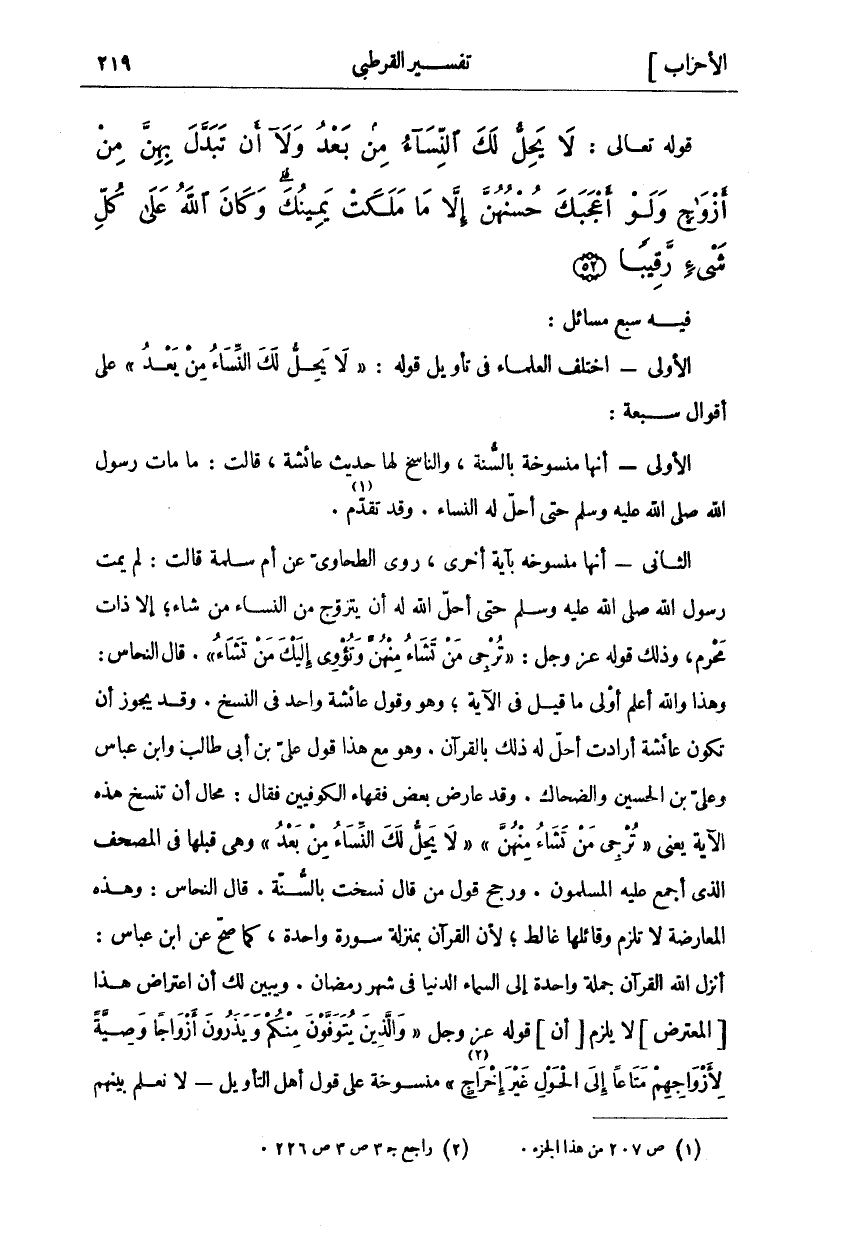 فِيهِ سَبْعُ مَسَائِلَ: الْأُولَى- اخْتَلَفَ الْعُلَمَاءُ فِي تَأْوِيلِ قَوْلِهِ:" لَا يَحِلُّ لَكَ النِّساءُ مِنْ بَعْدُ" عَلَى أَقْوَالٍ سبعة: الاولى- أَنَّهَا مَنْسُوخَةٌ بِالسُّنَّةِ، وَالنَّاسِخُ لَهَا حَدِيثُ عَائِشَةَ، قَالَتْ: مَا مَاتَ رَسُولُ اللَّهِ صَلَّى اللَّهُ عَلَيْهِ وَسَلَّمَ حَتَّى أُحِلَّ لَهُ النِّسَاءُ. وَقَدْ تَقَدَّمَ «١». الثَّانِي- أَنَّهَا مَنْسُوخَةٌ بِآيَةٍ أُخْرَى، رَوَى الطَّحَاوِيُّ عَنْ أُمِّ سَلَمَةَ قَالَتْ: لَمْ يَمُتْ رَسُولُ اللَّهِ صَلَّى اللَّهُ عَلَيْهِ وَسَلَّمَ حَتَّى أَحَلَّ اللَّهُ لَهُ أَنْ يَتَزَوَّجَ مِنَ النِّسَاءِ مَنْ شَاءَ، إِلَّا ذَاتَ مَحْرَمٍ، وَذَلِكَ قَوْلُهُ عز وجل:" تُرْجِي مَنْ تَشاءُ مِنْهُنَّ وَتُؤْوِي إِلَيْكَ مَنْ تَشاءُ". قَالَ النَّحَّاسُ: وَهَذَا وَاللَّهُ أَعْلَمُ أَوْلَى مَا قِيلَ فِي الْآيَةِ، وَهُوَ وَقَوْلُ عَائِشَةَ وَاحِدٌ فِي النَّسْخِ. وَقَدْ يَجُوزُ أَنْ تَكُونَ عَائِشَةُ أَرَادَتْ أُحِلَّ لَهُ ذَلِكَ بِالْقُرْآنِ. وَهُوَ مَعَ هَذَا قَوْلُ عَلِيِّ بْنِ أَبِي طَالِبٍ وَابْنِ عَبَّاسٍ وَعَلِيِّ بْنِ الْحُسَيْنِ وَالضَّحَّاكِ. وَقَدْ عَارَضَ بَعْضُ فُقَهَاءِ الْكُوفِيِّينَ فَقَالَ: مُحَالٌ أَنْ تَنْسِخَ هَذِهِ الْآيَةُ يَعْنِي" تُرْجِي مَنْ تَشاءُ مِنْهُنَّ"" لَا يَحِلُّ لَكَ النِّساءُ مِنْ بَعْدُ" وَهِيَ قَبْلَهَا فِي الْمُصْحَفِ الَّذِي أَجْمَعَ عَلَيْهِ الْمُسْلِمُونَ. وَرَجَّحَ قَوْلَ مَنْ قَالَ نُسِخَتْ بِالسُّنَّةِ. قَالَ النَّحَّاسُ: وَهَذِهِ الْمُعَاوَضَةُ لَا تَلْزَمُ وَقَائِلُهَا غَالِطٌ، لِأَنَّ الْقُرْآنَ بِمَنْزِلَةِ سُورَةٍ وَاحِدَةٍ، كَمَا صَحَّ عَنِ ابْنِ عَبَّاسٍ: أَنْزَلَ اللَّهُ الْقُرْآنَ جُمْلَةً وَاحِدَةً إِلَى السَّمَاءِ الدُّنْيَا في شهر رمضان. ومبين لَكَ أَنَّ اعْتِرَاضَ هَذَا [الْمُعْتَرِضَ] لَا يَلْزَمُ [أَنَّ] قَوْلَهُ عَزَّ وَجَلَّ:" وَالَّذِينَ يُتَوَفَّوْنَ مِنْكُمْ وَيَذَرُونَ أَزْواجاً وَصِيَّةً لِأَزْواجِهِمْ مَتاعاً إِلَى الْحَوْلِ غَيْرَ إِخْراجٍ" «٢» [البقرة: ٢٤٠] مَنْسُوخَةٌ عَلَى قَوْلِ أَهْلِ التَّأْوِيلِ- لَا نَعْلَمُ بينهم