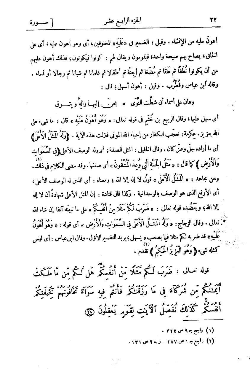 أَيْ سَهُلَ عَلَيْهَا، وَقَالَ الرَّبِيعُ بْنُ خُثَيْمٍ فِي قَوْلِهِ تَعَالَى:" وَهُوَ أَهْوَنُ عَلَيْهِ" قال: ما شي عَلَى اللَّهِ بِعَزِيزٍ. عِكْرِمَةُ: تَعَجَّبَ الْكُفَّارُ مِنْ إِحْيَاءِ اللَّهِ الْمَوْتَى فَنَزَلَتْ هَذِهِ الْآيَةُ." وَلَهُ الْمَثَلُ الْأَعْلى " أي ما أراده عز وجل كَانَ. وَقَالَ الْخَلِيلُ: الْمَثَلُ الصِّفَةُ، أَيْ وَلَهُ الْوَصْفُ الْأَعْلَى" فِي السَّماواتِ وَالْأَرْضِ" كَمَا قَالَ:" مَثَلُ الْجَنَّةِ الَّتِي وُعِدَ الْمُتَّقُونَ" [الرعد: ٣٥] أَيْ صِفَتُهَا. وَقَدْ مَضَى الْكَلَامُ فِي ذَلِكَ «١». وَعَنْ مُجَاهِدٍ:" الْمَثَلُ الْأَعْلى " قَوْلُ لَا إِلَهَ إِلَّا اللَّهَ، وَمَعْنَاهُ: أَيِ الَّذِي لَهُ الْوَصْفُ الأعلى، أي الا رفع الَّذِي هُوَ الْوَصْفُ بِالْوَحْدَانِيَّةِ. وَكَذَا قَالَ قَتَادَةُ: إِنَّ الْمَثَلُ الْأَعْلَى شَهَادَةُ أَنْ لَا إِلَهَ إِلَّا اللَّهَ، وَيُعَضِّدُهُ قَوْلُهُ تَعَالَى:" ضَرَبَ لَكُمْ مَثَلًا مِنْ أَنْفُسِكُمْ" عَلَى مَا نُبَيِّنُهُ آنِفًا إِنْ شَاءَ اللَّهُ تَعَالَى. وَقَالَ الزَّجَّاجُ:" وَلَهُ الْمَثَلُ الْأَعْلى فِي السَّماواتِ وَالْأَرْضِ" أَيْ قَوْلُهُ:" وَهُوَ أَهْوَنُ عَلَيْهِ" قَدْ ضَرَبَهُ لَكُمْ مَثَلًا فِيمَا يَصْعُبُ وَيَسْهُلُ، يُرِيدُ التَّفْسِيرَ الْأَوَّلَ. وَقَالَ ابْنُ عَبَّاسٍ: أَيْ لَيْسَ كَمِثْلِهِ شَيْءٌ (وَهُوَ الْعَزِيزُ الْحَكِيمُ) تقدم «٢».