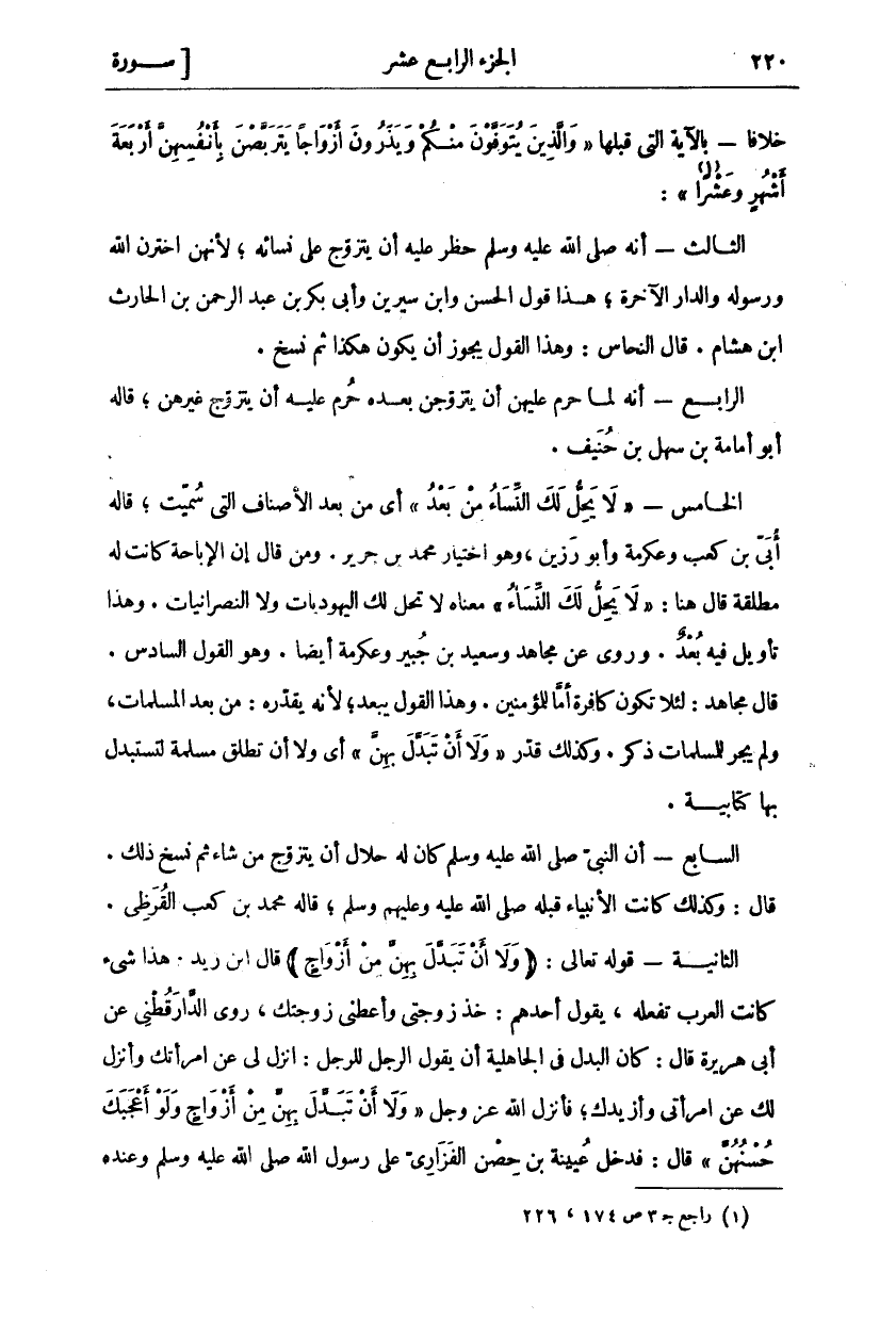 خِلَافًا- بِالْآيَةِ الَّتِي قَبْلَهَا" وَالَّذِينَ يُتَوَفَّوْنَ مِنْكُمْ وَيَذَرُونَ أَزْواجاً يَتَرَبَّصْنَ بِأَنْفُسِهِنَّ أَرْبَعَةَ أَشْهُرٍ وَعَشْراً" «١» [البقرة: ٢٣٤]: الثَّالِثُ- أَنَّهُ صَلَّى اللَّهُ عَلَيْهِ وَسَلَّمَ حُظِرَ عَلَيْهِ أَنْ يَتَزَوَّجَ عَلَى نِسَائِهِ، لِأَنَّهُنَّ اخْتَرْنَ اللَّهَ وَرَسُولَهُ وَالدَّارَ الْآخِرَةَ، هَذَا قَوْلُ الْحَسَنِ وَابْنِ سِيرِينَ وَأَبِي بَكْرِ بْنِ عَبْدِ الرَّحْمَنِ بن الحارث ابن هِشَامٍ. قَالَ النَّحَّاسُ: وَهَذَا الْقَوْلُ يَجُوزُ أَنْ يَكُونَ هَكَذَا ثُمَّ نُسِخَ. الرَّابِعُ- أَنَّهُ لَمَّا حُرِّمَ عَلَيْهِنَّ أَنْ يَتَزَوَّجْنَ بَعْدَهُ حُرِّمَ عَلَيْهِ أَنْ يَتَزَوَّجَ غَيْرَهُنَّ، قَالَهُ أَبُو أُمَامَةَ بْنُ سَهْلِ بْنِ حُنَيْفٍ. الْخَامِسُ-" لَا يَحِلُّ لَكَ النِّساءُ مِنْ بَعْدُ" أَيْ مِنْ بَعْدِ الْأَصْنَافِ الَّتِي سُمِّيَتْ، قَالَهُ أُبَيُّ بْنُ كَعْبٍ وَعِكْرِمَةُ وَأَبُو رَزِينٍ، وَهُوَ اخْتِيَارُ مُحَمَّدِ بْنِ جَرِيرٍ. وَمَنْ قَالَ إِنَّ الْإِبَاحَةَ كَانَتْ لَهُ مُطْلَقَةً قَالَ هُنَا:" لَا يَحِلُّ لَكَ النِّساءُ" مَعْنَاهُ لَا تَحِلُّ لَكَ الْيَهُودِيَّاتُ وَلَا النَّصْرَانِيَّاتُ. وَهَذَا تَأْوِيلٌ فِيهِ بُعْدٌ. وَرُوِيَ عَنْ مُجَاهِدٍ وَسَعِيدِ بْنِ جُبَيْرٍ وَعِكْرِمَةَ أَيْضًا. وَهُوَ الْقَوْلُ السَّادِسُ. قَالَ مُجَاهِدٌ: لِئَلَّا تَكُونَ كَافِرَةٌ أُمًّا لِلْمُؤْمِنِينَ. وَهَذَا الْقَوْلُ يَبْعُدُ، لِأَنَّهُ يُقَدِّرُهُ: مِنْ بَعْدِ الْمُسْلِمَاتِ، وَلَمْ يَجْرِ لِلْمُسْلِمَاتِ ذِكْرٌ. وَكَذَلِكَ قُدِّرَ" وَلا أَنْ تَبَدَّلَ بِهِنَّ" أَيْ وَلَا أَنْ تُطَلِّقَ مُسْلِمَةً لِتَسْتَبْدِلَ بِهَا كِتَابِيَّةً. السَّابِعُ- أَنَّ النَّبِيَّ صَلَّى اللَّهُ عَلَيْهِ وَسَلَّمَ كَانَ لَهُ حَلَالٌ أَنْ يَتَزَوَّجَ مَنْ شَاءَ ثُمَّ نُسِخَ ذَلِكَ. قَالَ: وَكَذَلِكَ كَانَتِ الْأَنْبِيَاءُ قَبْلَهُ صَلَّى اللَّهُ عَلَيْهِ وَسَلَّمَ قَالَهُ مُحَمَّدُ بْنُ كَعْبٍ الْقُرَظِيُّ. الثَّانِيَةُ- قَوْلُهُ تَعَالَى: (وَلا أَنْ تَبَدَّلَ بِهِنَّ مِنْ أَزْواجٍ) قَالَ ابْنُ زَيْدٍ: هَذَا شي كَانَتِ الْعَرَبُ تَفْعَلُهُ، يَقُولُ أَحَدُهُمْ: خُذْ زَوْجَتِي وَأَعْطِنِي زَوْجَتَكَ، رَوَى الدَّارَقُطْنِيُّ عَنْ أَبِي هُرَيْرَةَ قَالَ: كَانَ الْبَدَلُ فِي الْجَاهِلِيَّةِ أَنْ يَقُولَ الرَّجُلُ لِلرَّجُلِ: انْزِلْ لِي عَنِ امْرَأَتِكَ وَأَنْزِلُ لَكَ عَنِ امْرَأَتِي وَأَزِيدُكَ، فَأَنْزَلَ اللَّهُ عَزَّ وَجَلَّ" وَلا أَنْ تَبَدَّلَ بِهِنَّ مِنْ أَزْواجٍ وَلَوْ أَعْجَبَكَ حُسْنُهُنَّ" قَالَ: فَدَخَلَ عُيَيْنَةُ بْنُ حِصْنٍ الْفَزَارِيُّ عَلَى رَسُولِ اللَّهِ صَلَّى اللَّهُ عَلَيْهِ وَسَلَّمَ وعنده