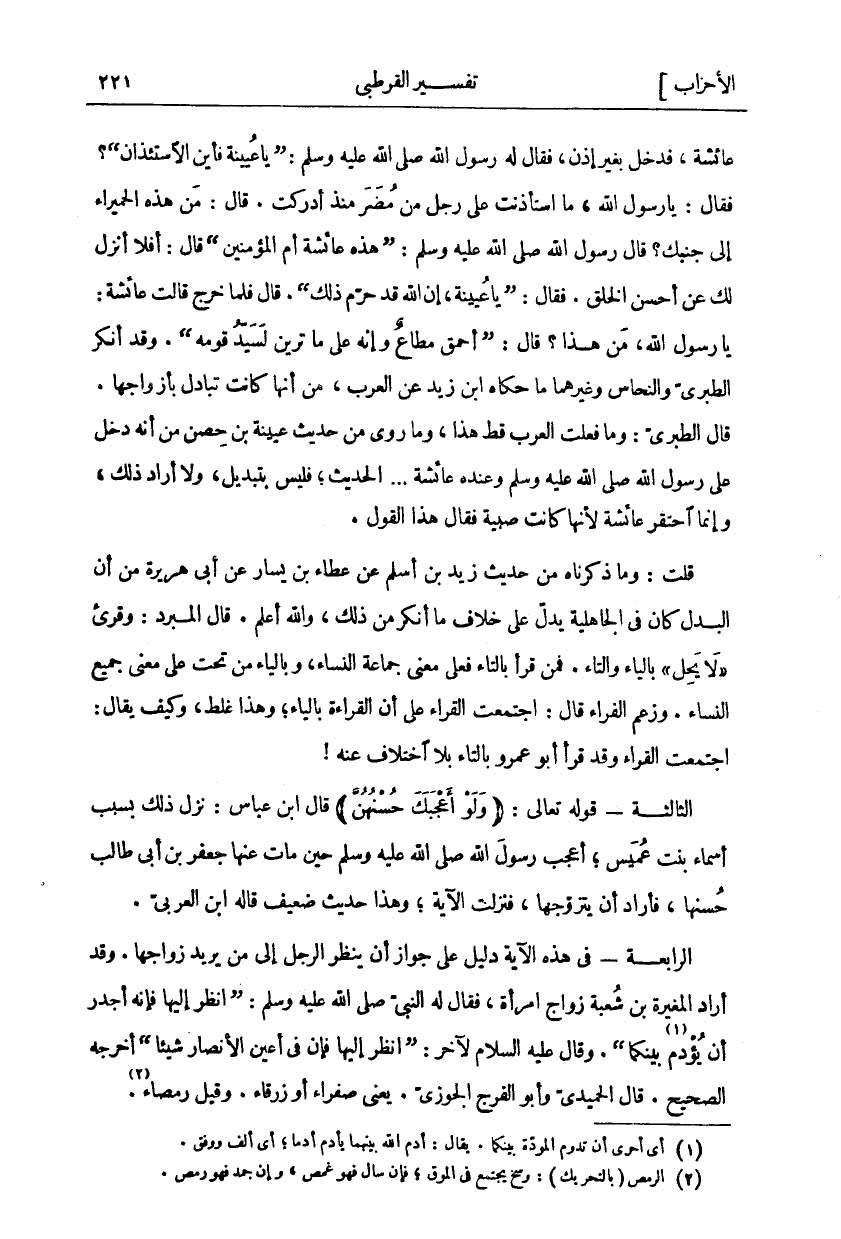 عَائِشَةُ، فَدَخَلَ بِغَيْرِ إِذْنٍ، فَقَالَ لَهُ رَسُولُ اللَّهِ صَلَّى اللَّهُ عَلَيْهِ وَسَلَّمَ: (يَا عُيَيْنَةُ فَأَيْنَ الِاسْتِئْذَانُ)؟ فَقَالَ: يَا رَسُولَ اللَّهِ، مَا اسْتَأْذَنْتُ عَلَى رَجُلٍ مِنْ مُضَرٍ مُنْذُ أَدْرَكْتُ. قَالَ: مَنْ هَذِهِ الْحُمَيْرَاءُ إِلَى جَنْبِكَ؟ قَالَ رَسُولُ اللَّهِ صَلَّى اللَّهُ عَلَيْهِ وَسَلَّمَ: (هَذِهِ عَائِشَةُ أُمُّ الْمُؤْمِنِينَ) قَالَ: أَفَلَا أَنْزِلُ لَكَ عَنْ أَحْسَنِ الْخَلْقِ. فَقَالَ: (يَا عُيَيْنَةُ، إِنَّ اللَّهَ قَدْ حَرَّمَ ذَلِكَ). قَالَ فَلَمَّا خَرَجَ قَالَتْ عَائِشَةُ: يَا رَسُولَ اللَّهِ، مَنْ هَذَا؟ قَالَ: (أَحْمَقُ مُطَاعٌ وَإِنَّهُ عَلَى مَا تَرَيْنَ لَسَيِّدُ قَوْمِهِ). وَقَدْ أَنْكَرَ الطَّبَرِيُّ وَالنَّحَّاسُ وَغَيْرُهُمَا مَا حَكَاهُ ابْنُ زَيْدٍ عَنِ الْعَرَبِ، مِنْ أَنَّهَا كَانَتْ تُبَادِلُ بِأَزْوَاجِهَا. قَالَ الطَّبَرِيُّ: وَمَا فَعَلَتِ الْعَرَبُ قَطُّ هَذَا. وَمَا رُوِيَ مِنْ حَدِيثِ عُيَيْنَةَ بْنِ حِصْنٍ مِنْ أَنَّهُ دُخِلَ عَلَى رَسُولِ اللَّهِ صَلَّى اللَّهُ عَلَيْهِ وَسَلَّمَ وَعِنْدَهُ عَائِشَةُ ... الْحَدِيثَ، فَلَيْسَ بِتَبْدِيلٍ، وَلَا أَرَادَ ذَلِكَ، وَإِنَّمَا احْتَقَرَ عَائِشَةَ لِأَنَّهَا كَانَتْ صَبِيَّةً فَقَالَ هَذَا الْقَوْلَ. قُلْتُ: وَمَا ذَكَرْنَاهُ مِنْ حَدِيثِ زَيْدُ بْنُ أَسْلَمَ عَنْ عَطَاءِ بْنِ يَسَارٍ عَنْ أَبِي هُرَيْرَةَ مِنْ أَنَّ الْبَدَلَ كَانَ فِي الْجَاهِلِيَّةِ يَدُلُّ عَلَى خِلَافِ مَا أُنْكِرَ مِنْ ذَلِكَ، وَاللَّهُ أَعْلَمُ. قَالَ الْمُبَرِّدُ: وقرى" لَا يَحِلُّ" بِالْيَاءِ وَالتَّاءِ. فَمَنْ قَرَأَ بِالتَّاءِ فَعَلَى مَعْنَى جَمَاعَةِ النِّسَاءِ، وَبِالْيَاءِ مِنْ تَحْتٍ عَلَى مَعْنَى جَمِيعِ النِّسَاءِ. وَزَعَمَ الْفَرَّاءُ قَالَ: اجْتَمَعَتِ الْقُرَّاءُ عَلَى أَنَّ الْقِرَاءَةَ بِالْيَاءِ، وَهَذَا غَلَطٌ، وَكَيْفَ يُقَالُ: اجْتَمَعَتِ الْقُرَّاءُ وَقَدْ قَرَأَ أَبُو عَمْرٍو بِالتَّاءِ بِلَا اخْتِلَافٍ عَنْهُ! الثَّالِثَةُ- قَوْلُهُ تَعَالَى: (وَلَوْ أَعْجَبَكَ حُسْنُهُنَّ) قَالَ ابْنُ عَبَّاسٍ: نَزَلَ ذَلِكَ بِسَبَبِ أَسْمَاءَ بِنْتِ عُمَيْسٍ، أَعْجَبَ رَسُولُ اللَّهِ صَلَّى اللَّهُ عَلَيْهِ وَسَلَّمَ حِينَ مَاتَ عَنْهَا جَعْفَرُ بْنُ أَبِي طَالِبٍ، حُسْنُهَا، فَأَرَادَ أَنْ يَتَزَوَّجَهَا، فَنَزَلَتِ الْآيَةُ، وَهَذَا حَدِيثٌ ضَعِيفٌ قَالَهُ ابْنُ الْعَرَبِيِّ. الرَّابِعَةُ- فِي هَذِهِ الْآيَةِ دَلِيلٌ عَلَى جَوَازِ أَنْ يَنْظُرَ الرَّجُلُ إِلَى مَنْ يُرِيدُ زَوَاجَهَا. وَقَدْ أَرَادَ الْمُغِيرَةُ بْنُ شُعْبَةَ زَوَاجَ امْرَأَةٍ، فَقَالَ لَهُ النَّبِيُّ صَلَّى اللَّهُ عَلَيْهِ وَسَلَّمَ: (انْظُرْ إِلَيْهَا فإنه أجدر أن يودم «١» بَيْنَكُمَا). وَقَالَ عَلَيْهِ السَّلَامُ لِآخَرَ: (انْظُرْ إِلَيْهَا فَإِنَّ فِي أَعْيُنِ الْأَنْصَارِ شَيْئًا) أَخْرَجَهُ الصَّحِيحُ. قَالَ الْحُمَيْدِيُّ وَأَبُو الْفَرَجِ الْجَوْزِيُّ. يَعْنِي صَفْرَاءَ أو زرقاء. وقيل رمصاء «٢».