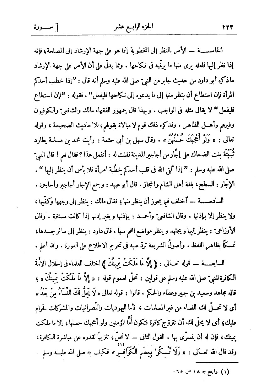 الْخَامِسَةُ- الْأَمْرُ بِالنَّظَرِ إِلَى الْمَخْطُوبَةِ إِنَّمَا هُوَ عَلَى جِهَةِ الْإِرْشَادِ إِلَى الْمَصْلَحَةِ، فَإِنَّهُ إِذَا نَظَرَ إِلَيْهَا فَلَعَلَّهُ يَرَى مِنْهَا مَا يُرَغِّبُهُ فِي نِكَاحِهَا. وَمِمَّا يَدُلُّ عَلَى أَنَّ الْأَمْرَ عَلَى جِهَةِ الْإِرْشَادِ مَا ذَكَرَهُ أَبُو دَاوُدَ مِنْ حَدِيثِ جَابِرٍ عَنِ النَّبِيِّ صَلَّى اللَّهُ عَلَيْهِ وَسَلَّمَ أَنَّهُ قَالَ: (إِذَا خَطَبَ أَحَدُكُمُ الْمَرْأَةَ فَإِنِ اسْتَطَاعَ أَنْ يَنْظُرَ مِنْهَا إِلَى مَا يَدْعُوهُ إِلَى نِكَاحِهَا فَلْيَفْعَلْ). فَقَوْلُهُ: (فَإِنِ اسْتَطَاعَ فَلْيَفْعَلْ) لَا يُقَالُ مِثْلُهُ فِي الْوَاجِبِ. وَبِهَذَا قَالَ جُمْهُورُ الْفُقَهَاءِ مَالِكٌ وَالشَّافِعِيُّ وَالْكُوفِيُّونَ وَغَيْرُهُمْ وَأَهْلُ الظَّاهِرِ. وَقَدْ كَرِهَ ذَلِكَ قَوْمٌ لَا مُبَالَاةَ بِقَوْلِهِمْ، لِلْأَحَادِيثِ الصَّحِيحَةِ، وَقَوْلِهِ تَعَالَى:" وَلَوْ أَعْجَبَكَ حُسْنُهُنَّ". وَقَالَ سَهْلُ بْنُ أَبِي حَثْمَةَ: رَأَيْتُ مُحَمَّدَ بْنَ مَسْلَمَةَ يُطَارِدُ ثُبَيْتَةَ بِنْتَ الضَّحَّاكِ عَلَى إِجَّارٍ مِنْ أَجَاجِيرِ الْمَدِينَةِ فَقُلْتُ لَهُ: أَتَفْعَلُ هَذَا؟ فَقَالَ نَعَمْ! قَالَ النَّبِيُّ صَلَّى اللَّهُ عَلَيْهِ وَسَلَّمَ: (إِذَا أَلْقَى اللَّهُ فِي قَلْبِ أَحَدِكُمْ خِطْبَةَ امْرَأَةٍ فَلَا بَأْسَ أَنْ يَنْظُرَ إِلَيْهَا). الْإِجَّارُ: السَّطْحُ، بِلُغَةِ أَهْلِ الشَّامِ وَالْحِجَازِ. قَالَ أَبُو عُبَيْدٍ: وَجَمْعُ الْإِجَّارِ أَجَاجِيرُ وَأَجَاجِرَةٌ. السَّادِسَةُ- اخْتُلِفَ فِيمَا يَجُوزُ أَنْ يَنْظُرَ مِنْهَا، فَقَالَ مَالِكٌ: يَنْظُرُ إِلَى وَجْهِهَا وَكَفَّيْهَا، وَلَا يَنْظُرُ إِلَّا بِإِذْنِهَا. وَقَالَ الشَّافِعِيُّ وَأَحْمَدُ: بِإِذْنِهَا وَبِغَيْرِ إِذْنِهَا إِذَا كَانَتْ مُسْتَتِرَةً. وَقَالَ الْأَوْزَاعِيُّ: يَنْظُرُ إِلَيْهَا وَيَجْتَهِدُ وَيَنْظُرُ مَوَاضِعَ اللَّحْمِ مِنْهَا. قَالَ دَاوُدُ: يَنْظُرُ إِلَى سَائِرِ جَسَدِهَا، تَمَسُّكًا بِظَاهِرِ اللَّفْظِ. وَأُصُولُ الشَّرِيعَةِ تَرُدُّ عَلَيْهِ فِي تَحْرِيمِ الِاطِّلَاعِ عَلَى الْعَوْرَةِ. وَاللَّهُ أَعْلَمُ. السَّابِعَةُ- قَوْلُهُ تَعَالَى: (إِلَّا مَا مَلَكَتْ يَمِينُكَ) اخْتَلَفَ الْعُلَمَاءُ فِي إِحْلَالِ الْأَمَةِ الْكَافِرَةِ لِلنَّبِيِّ صَلَّى اللَّهُ عَلَيْهِ وَسَلَّمَ عَلَى قو لين: تحل لعموم قوله:" إِلَّا مَا مَلَكَتْ يَمِينُكَ"، قَالَهُ مُجَاهِدٌ وَسَعِيدُ بْنُ جُبَيْرٍ وَعَطَاءٌ وَالْحَكَمُ. قَالُوا: قَوْلُهُ تَعَالَى" لَا يَحِلُّ لَكَ النِّساءُ مِنْ بَعْدُ" أَيْ لَا تَحِلُّ لَكَ النِّسَاءُ مِنْ غَيْرِ الْمُسْلِمَاتِ، فَأَمَّا الْيَهُودِيَّاتُ وَالنَّصْرَانِيَّاتُ وَالْمُشْرِكَاتُ فَحَرَامٌ عَلَيْكَ، أَيْ لَا يَحِلُّ لَكَ أَنْ تَتَزَوَّجَ كَافِرَةً فَتَكُونُ أُمًّا لِلْمُؤْمِنِينَ وَلَوْ أَعْجَبَكَ حُسْنُهَا، إِلَّا مَا مَلَكَتْ يَمِينُكَ، فَإِنَّ لَهُ أَنْ يَتَسَرَّى بِهَا. الْقَوْلُ الثَّانِي- لَا تَحِلُّ، تَنْزِيهًا لِقَدْرِهِ عَنْ مُبَاشَرَةِ الْكَافِرَةِ، وَقَدْ قَالَ اللَّهُ تَعَالَى:" وَلا تُمْسِكُوا بِعِصَمِ الْكَوافِرِ" «١» [الممتحنة: ١٠] فكيف به صَلَّى اللَّهُ عَلَيْهِ وَسَلَّمَ.