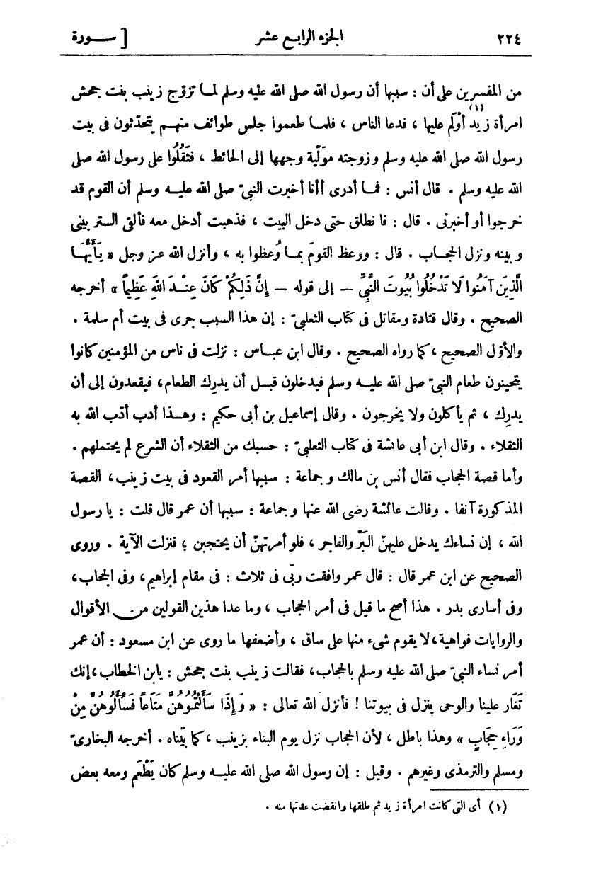 مِنَ الْمُفَسِّرِينَ عَلَى أَنَّ: سَبَبَهَا أَنَّ رَسُولَ اللَّهِ صَلَّى اللَّهُ عَلَيْهِ وَسَلَّمَ لَمَّا تَزَوَّجَ زَيْنَبَ بِنْتَ جَحْشٍ امْرَأَةَ زَيْدٍ «١» أَوْلَمَ عَلَيْهَا، فَدَعَا النَّاسَ، فَلَمَّا طَعِمُوا جَلَسَ طَوَائِفُ مِنْهُمْ يَتَحَدَّثُونَ فِي بَيْتُ رَسُولِ اللَّهِ صَلَّى اللَّهُ عَلَيْهِ وَسَلَّمَ وَزَوْجَتُهُ مُوَلِّيَةً وَجْهَهَا إِلَى الْحَائِطِ، فَثَقُلُوا عَلَى رَسُولِ اللَّهِ صَلَّى اللَّهُ عَلَيْهِ وَسَلَّمَ. قَالَ أَنَسٌ: فَمَا أَدْرِي أَأَنَا أَخْبَرْتُ النَّبِيَّ صَلَّى اللَّهُ عَلَيْهِ وَسَلَّمَ أَنَّ الْقَوْمَ قَدْ خَرَجُوا أَوْ أَخْبَرَنِي. قَالَ: فَانْطَلَقَ حَتَّى دَخَلَ الْبَيْتَ، فَذَهَبْتُ أَدْخُلُ مَعَهُ فَأَلْقَى السِّتْرَ بَيْنِي وَبَيْنَهُ وَنَزَلَ الْحِجَابُ. قَالَ: وَوُعِظَ الْقَوْمُ بِمَا وُعِظُوا بِهِ، وَأَنْزَلَ اللَّهُ عَزَّ وَجَلَّ" يَا أَيُّهَا الَّذِينَ آمَنُوا لَا تَدْخُلُوا بُيُوتَ النَّبِيِّ"- إِلَى قَوْلِهِ-" إِنَّ ذلِكُمْ كانَ عِنْدَ اللَّهِ عَظِيماً" أَخْرَجَهُ الصَّحِيحُ. وَقَالَ قَتَادَةُ وَمُقَاتِلٌ فِي كِتَابِ الثَّعْلَبِيِّ: إِنَّ هَذَا السَّبَبَ جَرَى فِي بَيْتِ أُمِّ سَلَمَةَ. وَالْأَوَّلُ الصَّحِيحُ، كَمَا رَوَاهُ الصَّحِيحُ. وَقَالَ ابْنُ عَبَّاسٍ: نَزَلَتْ فِي نَاسٍ مِنَ الْمُؤْمِنِينَ كَانُوا يَتَحَيَّنُونَ طَعَامَ النَّبِيِّ صَلَّى اللَّهُ عَلَيْهِ وَسَلَّمَ فَيَدْخُلُونَ قَبْلَ أَنْ يُدْرِكَ الطَّعَامَ، فَيَقْعُدُونَ إِلَى أَنْ يُدْرِكَ، ثُمَّ يَأْكُلُونَ وَلَا يَخْرُجُونَ. وَقَالَ إِسْمَاعِيلُ بْنُ أَبِي حَكِيمٍ: وَهَذَا أَدَبٌ أَدَّبَ اللَّهُ بِهِ الثُّقَلَاءَ. وَقَالَ ابْنُ أَبِي عَائِشَةَ فِي كِتَابِ الثَّعْلَبِيِّ: حَسْبُكَ مِنَ الثُّقَلَاءِ أَنَّ الشَّرْعَ لَمْ يَحْتَمِلْهُمْ. وَأَمَّا قِصَّةُ الْحِجَابِ فَقَالَ أَنَسُ بْنُ مَالِكٍ وَجَمَاعَةٌ: سَبَبُهَا أَمْرُ الْقُعُودِ فِي بَيْتِ زَيْنَبَ، الْقِصَّةُ الْمَذْكُورَةُ آنِفًا. وَقَالَتْ عَائِشَةُ رَضِيَ اللَّهُ عَنْهَا وَجَمَاعَةٌ: سَبَبُهَا أَنَّ عُمَرَ قَالَ قُلْتُ: يَا رَسُولَ اللَّهِ، إِنَّ نِسَاءَكَ يَدْخُلُ عَلَيْهِنَّ الْبَرُّ وَالْفَاجِرُ، فَلَوْ أَمَرْتَهُنَّ أَنْ يَحْتَجِبْنَ، فَنَزَلَتِ الْآيَةُ. وَرَوَى الصَّحِيحُ عَنِ ابْنُ عُمَرَ قَالَ: قَالَ عُمَرُ وَافَقْتُ رَبِّي فِي ثَلَاثٍ: فِي مَقَامِ إِبْرَاهِيمَ، وَفِي الْحِجَابِ، وَفِي أُسَارَى بَدْرٍ. هَذَا أَصَحُّ مَا قِيلَ فِي أَمْرِ الْحِجَابِ، وَمَا عَدَا هَذَيْنِ الْقَوْلَيْنِ مِنَ الْأَقْوَالِ وَالرِّوَايَاتِ فواهية، لا يقوم شي مِنْهَا عَلَى سَاقٍ، وَأَضْعَفُهَا مَا رُوِيَ عَنِ ابْنِ مَسْعُودٍ: أَنَّ عُمَرَ أَمَرَ نِسَاءَ النَّبِيِّ صَلَّى اللَّهُ عَلَيْهِ وَسَلَّمَ بِالْحِجَابِ، فَقَالَتْ زَيْنَبُ بنت جحش: يا ابن الْخَطَّابِ، إِنَّكَ تَغَارُ عَلَيْنَا وَالْوَحْيُ يَنْزِلُ فِي بُيُوتِنَا! فَأَنْزَلَ اللَّهُ تَعَالَى:" وَإِذا سَأَلْتُمُوهُنَّ مَتاعاً فَسْئَلُوهُنَّ مِنْ وَراءِ حِجابٍ" وَهَذَا بَاطِلٌ، لِأَنَّ الْحِجَابَ نَزَلَ يَوْمَ الْبِنَاءِ بِزَيْنَبَ، كَمَا بَيَّنَّاهُ. أَخْرَجَهُ الْبُخَارِيُّ وَمُسْلِمٌ وَالتِّرْمِذِيُّ وَغَيْرُهُمْ. وَقِيلَ: إِنَّ رَسُولَ اللَّهِ صَلَّى اللَّهُ عَلَيْهِ وَسَلَّمَ كَانَ يَطْعَمُ ومعه بعض
