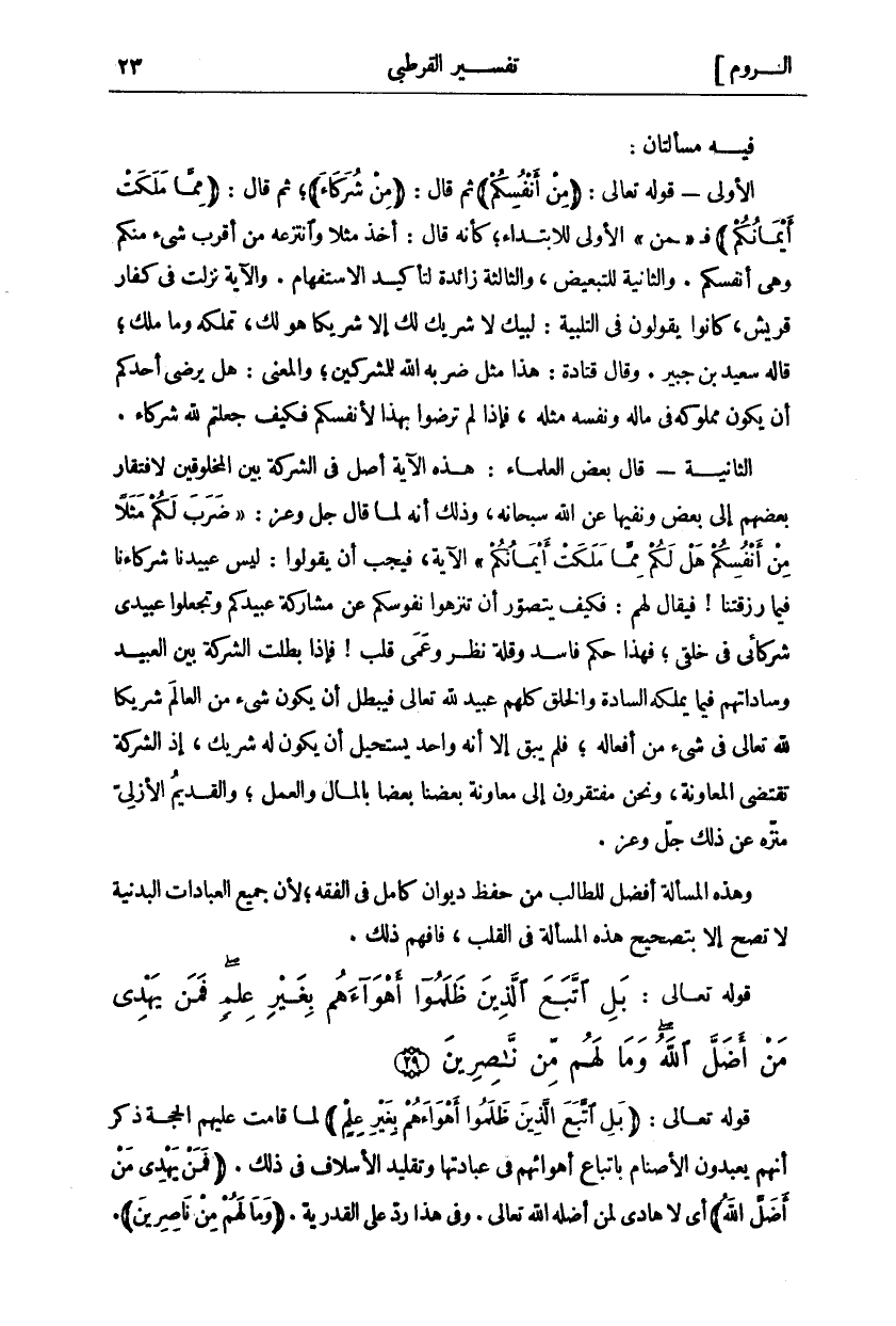 فِيهِ مَسْأَلَتَانِ: الْأُولَى- قَوْلُهُ تَعَالَى:" مِنْ أَنْفُسِكُمْ" ثُمَّ قَالَ:" مِنْ شُرَكاءَ"، ثُمَّ قَالَ:" مِمَّا مَلَكَتْ أَيْمانُكُمْ" فَ" مِنْ" الْأُولَى لِلِابْتِدَاءِ، كَأَنَّهُ قال: أخذ مثلا وانتزعه من أقرب شي مِنْكُمْ وَهِيَ أَنْفُسُكُمْ. وَالثَّانِيَةُ لِلتَّبْعِيضِ، وَالثَّالِثَةُ زَائِدَةٌ لِتَأْكِيدِ الِاسْتِفْهَامِ. وَالْآيَةُ نَزَلَتْ فِي كُفَّارِ قُرَيْشٍ، كَانُوا يَقُولُونَ فِي التَّلْبِيَةِ: لَبَّيْكَ لَا شَرِيكَ لَكَ إِلَّا شَرِيكًا هُوَ لَكَ، تَمْلِكُهُ وَمَا مَلَكَ، قَالَهُ سَعِيدُ بْنُ جُبَيْرٍ. وَقَالَ قَتَادَةُ: هَذَا مَثَلٌ ضَرَبَهُ اللَّهُ لِلْمُشْرِكِينَ، وَالْمَعْنَى: هَلْ يَرْضَى أَحَدُكُمْ أَنْ يَكُونَ مَمْلُوكُهُ فِي مَالِهِ وَنَفْسِهِ مِثْلَهُ، فَإِذَا لَمْ تَرْضَوْا بِهَذَا لِأَنْفُسِكُمْ فَكَيْفَ جَعَلْتُمْ لِلَّهِ شُرَكَاءَ. الثَّانِيَةُ- قَالَ بَعْضُ الْعُلَمَاءِ: هَذِهِ الْآيَةُ أَصْلٌ فِي الشَّرِكَةِ بَيْنَ الْمَخْلُوقِينَ لِافْتِقَارِ بَعْضِهِمْ إِلَى بَعْضٍ وَنَفْيِهَا عَنِ الله سبحانه، وذلك أنه لما قال عز وجل:" ضَرَبَ لَكُمْ مَثَلًا مِنْ أَنْفُسِكُمْ هَلْ لَكُمْ مِنْ ما مَلَكَتْ أَيْمانُكُمْ" الْآيَةَ، فَيَجِبُ أَنْ يَقُولُوا: لَيْسَ عَبِيدُنَا شُرَكَاءَنَا فِيمَا رَزَقْتَنَا! فَيُقَالُ لَهُمْ: فَكَيْفَ يُتَصَوَّرُ أَنْ تُنَزِّهُوا نُفُوسَكُمْ عَنْ مُشَارَكَةِ عَبِيدِكُمْ وَتَجْعَلُوا عَبِيدِي شُرَكَائِي فِي خَلْقِي، فَهَذَا حُكْمٌ فَاسِدٌ وَقِلَّةُ نَظَرٍ وَعَمَى قَلْبٍ! فَإِذَا بَطَلَتِ الشركة بين العبيد وساداتهم فِيمَا يَمْلِكُهُ السَّادَةُ وَالْخَلْقُ كُلُّهُمْ عَبِيدٌ لِلَّهِ تعالى فيبطل أن يكون شي من العالم شريكا لله تعالى في شي مِنْ أَفْعَالِهِ، فَلَمْ يَبْقَ إِلَّا أَنَّهُ وَاحِدٌ يَسْتَحِيلُ أَنْ يَكُونَ لَهُ شَرِيكٌ، إِذِ الشَّرِكَةُ تَقْتَضِي الْمُعَاوَنَةَ، وَنَحْنُ مُفْتَقِرُونَ إِلَى مُعَاوَنَةِ بَعْضِنَا بَعْضًا بِالْمَالِ وَالْعَمَلِ، وَالْقَدِيمُ الْأَزَلِيُّ مُنَزَّهٌ عَنْ ذلك عز وجل. وَهَذِهِ الْمَسْأَلَةُ أَفْضَلُ لِلطَّالِبِ مِنْ حِفْظِ دِيوَانٍ كَامِلٍ فِي الْفِقْهِ، لِأَنَّ جَمِيعَ الْعِبَادَاتِ الْبَدَنِيَّةِ لَا تَصِحُّ إِلَّا بِتَصْحِيحِ هَذِهِ الْمَسْأَلَةِ فِي القلب، فافهم ذلك.