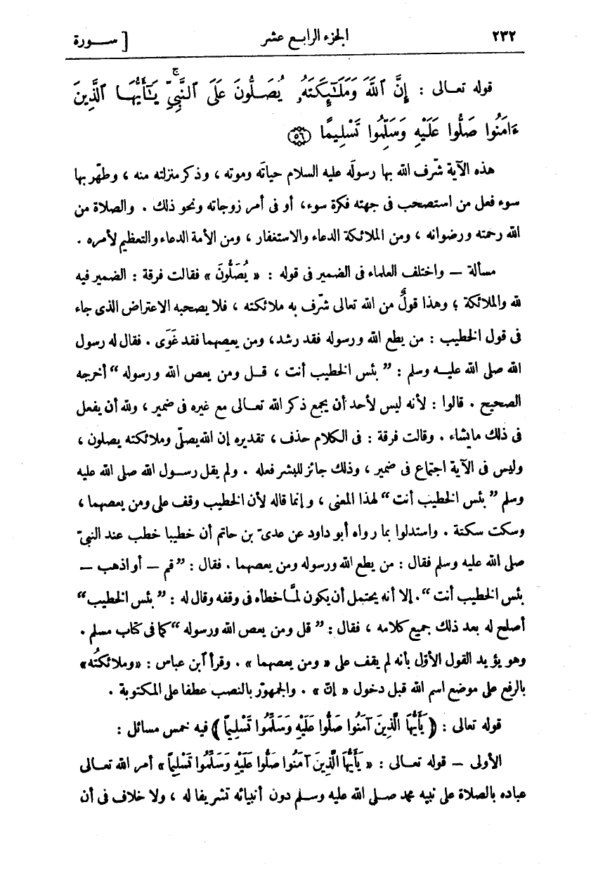 هَذِهِ الْآيَةُ شَرَّفَ اللَّهُ بِهَا رَسُولَهُ عَلَيْهِ السَّلَامُ حَيَاتَهُ وَمَوْتَهُ، وَذَكَرَ مَنْزِلَتَهُ مِنْهُ، وَطَهَّرَ بِهَا سُوءَ فِعْلِ مَنِ اسْتَصْحَبَ فِي جِهَتِهِ فِكْرَةَ سُوءٍ، أَوْ فِي أَمْرِ زَوْجَاتِهِ وَنَحْوَ ذَلِكَ. وَالصَّلَاةُ مِنَ اللَّهِ رَحْمَتُهُ وَرِضْوَانُهُ، وَمِنَ الْمَلَائِكَةِ الدُّعَاءُ وَالِاسْتِغْفَارُ، وَمِنَ الْأُمَّةِ الدُّعَاءُ وَالتَّعْظِيمُ لِأَمْرِهِ. مَسْأَلَةٌ- وَاخْتَلَفَ الْعُلَمَاءُ فِي الضَّمِيرِ فِي قَوْلِهِ:" يُصَلُّونَ" فَقَالَتْ فِرْقَةٌ: الضَّمِيرُ فِيهِ لِلَّهِ وَالْمَلَائِكَةِ، وَهَذَا قَوْلٌ مِنَ اللَّهِ تَعَالَى شَرَّفَ بِهِ مَلَائِكَتَهُ، فَلَا يَصْحَبُهُ الِاعْتِرَاضُ الَّذِي جَاءَ فِي قَوْلِ الْخَطِيبِ: مَنْ يُطِعِ اللَّهَ وَرَسُولَهُ فَقَدْ رَشَدَ، وَمَنْ يَعْصِهِمَا فَقَدْ غَوَى. فَقَالَ لَهُ رَسُولُ اللَّهِ صَلَّى اللَّهُ عَلَيْهِ وَسَلَّمَ: (بئس الخطيب أنت، قل ومن يعصى اللَّهَ وَرَسُولَهُ) أَخْرَجَهُ الصَّحِيحُ. قَالُوا: لِأَنَّهُ لَيْسَ لِأَحَدٍ أَنْ يَجْمَعَ ذِكْرَ اللَّهِ تَعَالَى مَعَ غَيْرِهِ فِي ضَمِيرٍ، وَلِلَّهِ أَنْ يَفْعَلَ فِي ذَلِكَ مَا يَشَاءُ. وَقَالَتْ فِرْقَةٌ: فِي الْكَلَامِ حَذْفٌ، تَقْدِيرُهُ إِنَّ اللَّهَ يُصَلِّي وَمَلَائِكَتَهُ يُصَلُّونَ، وَلَيْسَ فِي الْآيَةِ اجْتِمَاعٌ فِي ضَمِيرٍ، وَذَلِكَ جَائِزٌ لِلْبَشَرِ فِعْلُهُ. وَلَمْ يَقُلْ رَسُولِ اللَّهِ صَلَّى اللَّهُ عَلَيْهِ وَسَلَّمَ (بِئْسَ الْخَطِيبُ أَنْتَ) لِهَذَا الْمَعْنَى، وَإِنَّمَا قَالَهُ لِأَنَّ الْخَطِيبَ وَقَفَ عَلَى وَمَنْ يَعْصِهِمَا، وَسَكَتَ سَكْتَةً. وَاسْتَدَلُّوا بِمَا رَوَاهُ أَبُو دَاوُدَ عَنْ عَدِيِّ بْنِ حَاتِمٍ أَنَّ خَطِيبًا خَطَبَ عِنْدَ النَّبِيِّ صَلَّى اللَّهُ عَلَيْهِ وَسَلَّمَ فَقَالَ: مَنْ يُطِعِ اللَّهَ وَرَسُولَهُ وَمَنْ يَعْصِهِمَا. فَقَالَ: (قُمْ- أَوِ اذْهَبْ- بِئْسَ الْخَطِيبُ أَنْتَ). إِلَّا أَنَّهُ يَحْتَمِلُ أَنْ يَكُونَ لَمَّا خَطَّأَهُ فِي وَقْفِهِ وَقَالَ لَهُ: (بِئْسَ الْخَطِيبُ) أَصْلَحَ لَهُ بَعْدَ ذَلِكَ جَمِيعَ كَلَامِهِ، فَقَالَ: قُلْ (وَمَنْ يَعْصِ اللَّهَ وَرَسُولَهُ) كَمَا فِي كِتَابِ مُسْلِمٍ. وَهُوَ يُؤَيِّدُ الْقَوْلَ الْأَوَّلَ بِأَنَّهُ لَمْ يَقِفْ عَلَى" وَمَنْ يَعْصِهِمَا". وَقَرَأَ أبن عباس:" وملائكه" بِالرَّفْعِ عَلَى مَوْضِعِ اسْمِ اللَّهِ قَبْلَ دُخُولِ" إِنَّ". وَالْجُمْهُورُ بِالنَّصْبِ عَطْفًا عَلَى الْمَكْتُوبَةِ. قَوْلُهُ تَعَالَى: (يَا أَيُّهَا الَّذِينَ آمَنُوا صَلُّوا عَلَيْهِ وَسَلِّمُوا تَسْلِيماً) فِيهِ خَمْسُ مَسَائِلَ: الْأُولَى- قَوْلُهُ تَعَالَى: (يَا أَيُّهَا الَّذِينَ آمَنُوا صَلُّوا عَلَيْهِ وَسَلِّمُوا تَسْلِيماً) أَمَرَ اللَّهُ تَعَالَى عِبَادَهُ بِالصَّلَاةِ عَلَى نَبِيِّهِ مُحَمَّدٍ صَلَّى اللَّهُ عَلَيْهِ وَسَلَّمَ دُونَ أَنْبِيَائِهِ تَشْرِيفًا لَهُ، وَلَا خِلَافَ فِي أَنَّ
