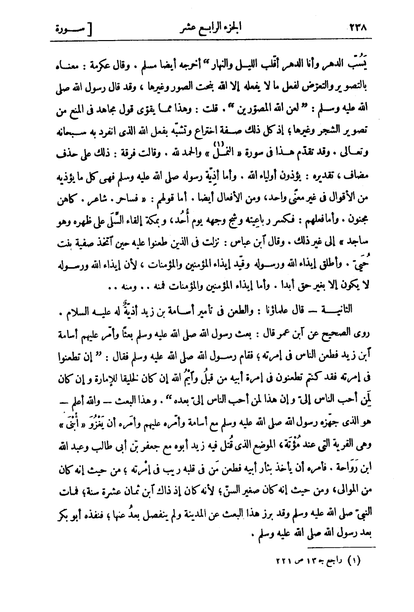 يَسُبُّ الدَّهْرَ وَأَنَا الدَّهْرُ أُقَلِّبُ اللَّيْلَ وَالنَّهَارَ) أَخْرَجَهُ أَيْضًا مُسْلِمٌ. وَقَالَ عِكْرِمَةُ: مَعْنَاهُ بِالتَّصْوِيرِ وَالتَّعَرُّضِ لِفِعْلٍ مَا لَا يَفْعَلُهُ إِلَّا اللَّهُ بِنَحْتِ الصُّوَرِ وَغَيْرِهَا، وَقَدْ قَالَ رَسُولُ اللَّهِ صَلَّى اللَّهُ عَلَيْهِ وَسَلَّمَ: (لَعَنَ اللَّهُ الْمُصَوِّرِينَ). قُلْت: وَهَذَا مِمَّا يُقَوِّي قَوْلَ مُجَاهِدٍ فِي الْمَنْعِ مِنْ تَصْوِيرِ الشَّجَرِ وَغَيْرِهَا، إِذْ كُلُّ ذَلِكَ صِفَةُ اخْتِرَاعٍ وَتَشَبُّهٍ بِفِعْلِ اللَّهِ الَّذِي انْفَرَدَ بِهِ سُبْحَانَهُ وَتَعَالَى. وَقَدْ تَقَدَّمَ هَذَا فِي سُورَةِ" النَّمْلِ" «١» وَالْحَمْدُ لِلَّهِ. وَقَالَتْ فِرْقَةٌ: ذَلِكَ عَلَى حَذْفِ مُضَافٍ، تَقْدِيرُهُ: يُؤْذُونَ أَوْلِيَاءَ اللَّهِ. وَأَمَّا أَذِيَّةُ رَسُولِهِ صَلَّى اللَّهُ عَلَيْهِ وَسَلَّمَ فَهِيَ كُلُّ مَا يُؤْذِيهِ مِنَ الْأَقْوَالِ فِي غَيْرِ مَعْنًى وَاحِدٍ، وَمِنَ الْأَفْعَالِ أَيْضًا. أَمَّا قَوْلُهُمْ:" فَسَاحِرٌ. شَاعِرٌ. كَاهِنٌ مَجْنُونٌ. وَأَمَّا فِعْلُهُمْ: فَكَسْرُ رَبَاعِيَتِهِ وَشَجُّ وَجْهِهِ يَوْمَ أُحُدٍ، وَبِمَكَّةَ إِلْقَاءُ السَّلَى عَلَى ظَهْرِهِ وَهُوَ سَاجِدٌ" إِلَى غَيْرِ ذَلِكَ. وَقَالَ ابْنُ عَبَّاسٍ: نَزَلَتْ فِي الَّذِينَ طَعَنُوا عَلَيْهِ حِينَ اتَّخَذَ صَفِيَّةَ بنت حُيَيٍّ. وَأُطْلِقَ إِيذَاءُ اللَّهِ وَرَسُولِهِ وَقُيِّدَ إِيذَاءُ الْمُؤْمِنِينَ وَالْمُؤْمِنَاتِ، لِأَنَّ إِيذَاءَ اللَّهِ وَرَسُولِهِ لَا يَكُونُ إِلَّا بِغَيْرِ حَقٍّ أَبَدًا. وَأَمَّا إِيذَاءُ الْمُؤْمِنِينَ وَالْمُؤْمِنَاتِ فَمِنْهُ .. وَمِنْهُ .. الثَّانِيَةُ- قَالَ عُلَمَاؤُنَا: وَالطَّعْنُ فِي تَأْمِيرِ أُسَامَةَ بْنِ زَيْدٍ أَذِيَّةٌ لَهُ عَلَيْهِ السَّلَامُ. رَوَى الصَّحِيحُ عَنِ ابْنِ عُمَرَ قَالَ: بَعَثَ رَسُولُ اللَّهِ صَلَّى اللَّهُ عَلَيْهِ وَسَلَّمَ بَعْثًا وأمر عليهم أسامة ابن زَيْدٍ فَطَعَنَ النَّاسُ فِي إِمْرَتِهِ، فَقَامَ رَسُولُ الله صلى فَقَالَ: (إِنْ تَطْعَنُوا فِي إِمْرَتِهِ فَقَدْ كُنْتُمْ تَطْعَنُونَ فِي إِمْرَةِ أَبِيهِ مِنْ قَبْلُ وَايْمِ اللَّهِ إِنْ كَانَ لَخَلِيقًا لِلْإِمَارَةِ وَإِنْ كَانَ لَمِنْ أَحَبِّ النَّاسِ إِلَيَّ وَإِنَّ هَذَا لَمِنْ أَحَبِّ النَّاسِ إِلَيَّ بَعْدَهُ (. وَهَذَا الْبَعْثُ- وَاللَّهُ أَعْلَمُ- هُوَ الَّذِي جَهَّزَهُ رَسُولُ اللَّهِ صَلَّى اللَّهُ عَلَيْهِ وَسَلَّمَ مَعَ أُسَامَةَ وَأَمَّرَهُ عَلَيْهِمْ وأمره أن يغزوا" أبنى" وهي القرية التي عند م مُؤْتَةَ، الْمَوْضِعُ الَّذِي قُتِلَ فِيهِ زَيْدٌ أَبُوهُ مَعَ جَعْفَرِ بْنِ أَبِي طَالِبٍ وَعَبْدِ اللَّهِ ابن رَوَاحَةَ. فَأَمَرَهُ أَنْ يَأْخُذَ بِثَأْرِ أَبِيهِ فَطَعَنَ مَنْ فِي قَلْبِهِ رَيْبٌ فِي إِمْرَتِهِ، مِنْ حَيْثُ إِنَّهُ كَانَ مِنَ الْمَوَالِي، وَمِنْ حَيْثُ إِنَّهُ كَانَ صَغِيرَ السِّنِّ، لِأَنَّهُ كَانَ إِذْ ذاك ابن ثمان عَشْرَةَ سَنَةً، فَمَاتَ النَّبِيُّ صَلَّى اللَّهُ عَلَيْهِ وَسَلَّمَ وَقَدْ بَرَزَ هَذَا الْبَعْثُ عَنِ الْمَدِينَةِ وَلَمْ يَنْفَصِلْ بَعْدُ عَنْهَا، فَنَفَذَهُ أَبُو بَكْرٍ بَعْدَ رَسُولِ اللَّهِ صَلَّى اللَّهُ عَلَيْهِ وَسَلَّمَ الله عليه وسلم.