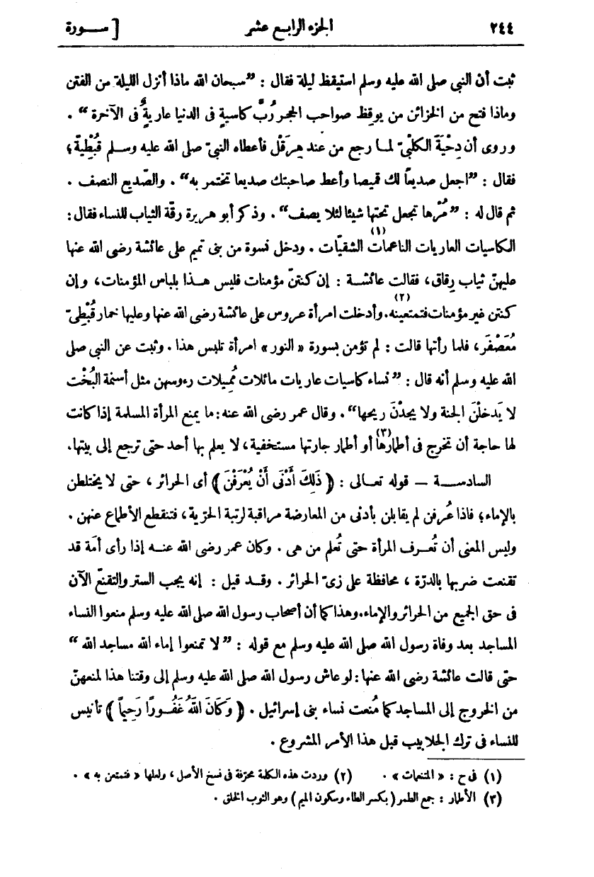 ثَبَتَ أَنَّ النَّبِيَّ صَلَّى اللَّهُ عَلَيْهِ وَسَلَّمَ اسْتَيْقَظَ لَيْلَةً فَقَالَ: (سُبْحَانَ اللَّهِ مَاذَا أُنْزِلَ اللَّيْلَةَ مِنَ الْفِتَنِ وَمَاذَا فُتِحَ مِنَ الْخَزَائِنِ مَنْ يُوقِظُ صَوَاحِبَ الْحُجَرِ رُبَّ كَاسِيَةٍ فِي الدُّنْيَا عَارِيَةٌ فِي الْآخِرَةِ (. وَرُوِيَ أَنَّ دِحْيَةَ الْكَلْبِيَّ لَمَّا رَجَعَ مِنْ عِنْدِ هِرَقْلَ فَأَعْطَاهُ النَّبِيُّ صَلَّى اللَّهُ عَلَيْهِ وَسَلَّمَ قُبْطِيَّةً، فَقَالَ: (اجْعَلْ صَدِيعًا لَكَ قَمِيصًا وَأَعْطِ صَاحِبَتكَ صَدِيعًا تَخْتَمِرُ بِهِ). وَالصَّدِيعُ النِّصْفُ. ثُمَّ قَالَ لَهُ: (مُرْهَا تَجْعَلُ تَحْتَهَا شَيْئًا لِئَلَّا يَصِفَ). وَذَكَرَ أَبُو هُرَيْرَةَ رِقَّةَ الثِّيَابِ لِلنِّسَاءِ فَقَالَ: الْكَاسِيَاتُ الْعَارِيَاتُ النَّاعِمَاتُ «١» الشَّقِيَّاتُ. وَدَخَلَ نِسْوَةٌ مِنْ بَنِي تَمِيمٍ عَلَى عَائِشَةَ رَضِيَ اللَّهُ عَنْهَا عَلَيْهِنَّ ثِيَابٌ رِقَاقٌ، فَقَالَتْ عَائِشَةُ: إِنْ كُنْتُنَّ مُؤْمِنَاتٍ فَلَيْسَ هَذَا بِلِبَاسِ الْمُؤْمِنَاتِ، وَإِنْ كُنْتُنَّ غَيْرَ مؤمنات فتمتعينه «٢». وَأُدْخِلَتِ امْرَأَةٌ عَرُوسٌ عَلَى عَائِشَةَ رَضِيَ اللَّهُ عَنْهَا وَعَلَيْهَا خِمَارٌ قُبْطِيٌّ مُعَصْفَرٌ، فَلَمَّا رَأَتْهَا قَالَتْ: لَمْ تُؤْمِنْ بِسُورَةِ" النُّورِ" امْرَأَةٌ تَلْبَسُ هَذَا. وَثَبَتَ عَنِ النَّبِيِّ صَلَّى اللَّهُ عَلَيْهِ وَسَلَّمَ أَنَّهُ قَالَ: (نِسَاءٌ كَاسِيَاتٌ عَارِيَاتٌ مَائِلَاتٌ مُمِيلَاتٌ رُءُوسُهُنَّ مِثْلُ أَسْنِمَةِ الْبُخْتِ لَا يَدْخُلْنَ الْجَنَّةَ وَلَا يَجِدْنَ رِيحَهَا (. وَقَالَ عُمَرُ رَضِيَ الله عنه: ما يمنع المرأة المسلمة إذا كَانَتْ لَهَا حَاجَةٌ أَنْ تَخْرُجَ فِي أَطْمَارهَا «٣» أَوْ أَطْمَارِ جَارَتِهَا مُسْتَخْفِيَةً، لَا يَعْلَمُ بِهَا أَحَدٌ حَتَّى تَرْجِعَ إِلَى بَيْتِهَا. السَّادِسَةُ- قَوْلُهُ تَعَالَى: (ذلِكَ أَدْنى أَنْ يُعْرَفْنَ) أَيِ الْحَرَائِرُ، حَتَّى لَا يَخْتَلِطْنَ بِالْإِمَاءِ، فَإِذَا عُرِفْنَ لَمْ يُقَابَلْنَ بِأَدْنَى مِنَ الْمُعَارَضَةِ مُرَاقَبَةً لِرُتْبَةِ الْحُرِّيَّةِ، فَتَنْقَطِعُ الْأَطْمَاعُ عَنْهُنَّ. وَلَيْسَ الْمَعْنَى أَنْ تُعْرَفَ الْمَرْأَةُ حَتَّى تُعْلَمَ مَنْ هِيَ. وَكَانَ عُمَرُ رَضِيَ اللَّهُ عَنْهُ إِذَا رَأَى أَمَةً قَدْ تَقَنَّعَتْ ضَرَبَهَا بِالدِّرَّةِ، مُحَافَظَةً عَلَى زِيِّ الْحَرَائِرِ. وَقَدْ قِيلَ: إِنَّهُ يَجِبُ السَّتْرُ وَالتَّقَنُّعُ الْآنَ فِي حَقِّ الْجَمِيعِ مِنَ الْحَرَائِرِ وَالْإِمَاءِ. وَهَذَا كَمَا أَنَّ أَصْحَابَ رَسُولِ اللَّهِ صَلَّى اللَّهُ عَلَيْهِ وَسَلَّمَ مَنَعُوا النِّسَاءَ الْمَسَاجِدَ بَعْدَ وَفَاةِ رَسُولِ اللَّهِ صَلَّى اللَّهُ عَلَيْهِ وَسَلَّمَ مَعَ قَوْلِهِ: (لَا تَمْنَعُوا إِمَاءَ اللَّهِ مَسَاجِدَ اللَّهِ) حَتَّى قَالَتْ عَائِشَةُ رَضِيَ اللَّهُ عَنْهَا: لَوْ عَاشَ رَسُولُ اللَّهِ صَلَّى اللَّهُ عَلَيْهِ وَسَلَّمَ إِلَى وَقْتِنَا هَذَا لَمَنَعَهُنَّ مِنَ الْخُرُوجِ إِلَى الْمَسَاجِدِ كَمَا مُنِعَتْ نِسَاءُ بَنِي إِسْرَائِيلَ. (وَكانَ اللَّهُ غَفُوراً رَحِيماً) تَأْنِيسٌ لِلنِّسَاءِ فِي تَرْكِ الجلابيب قبل هذا الامر المشروع.