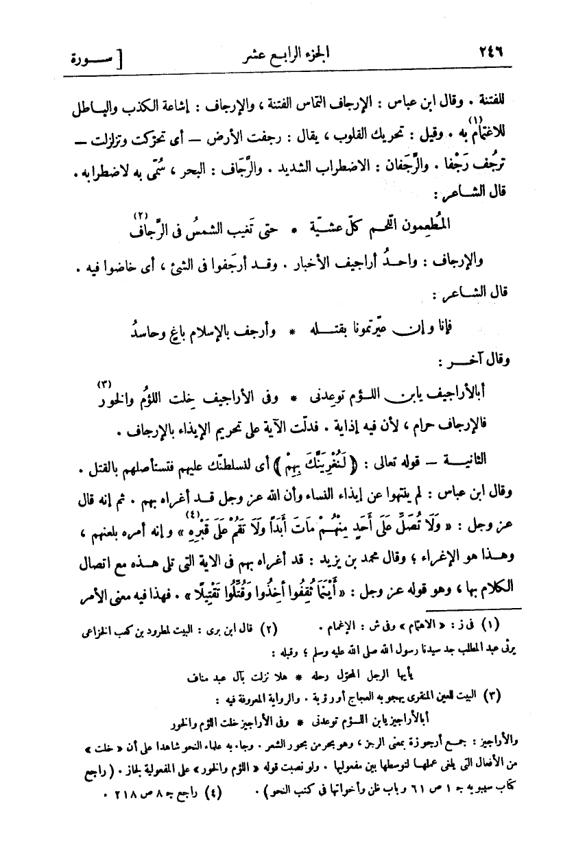 لِلْفِتْنَةِ. وَقَالَ ابْنُ عَبَّاسٍ: الْإِرْجَافُ الْتِمَاسُ الْفِتْنَةِ، وَالْإِرْجَافُ: إِشَاعَةُ الْكَذِبِ وَالْبَاطِل لِلِاغْتِمَامِ «١» بِهِ. وَقِيلَ: تَحْرِيكُ الْقُلُوبِ، يُقَالُ: رَجَفَتِ الْأَرْضُ- أَيْ تَحَرَّكَتْ وَتَزَلْزَلَتْ- تَرْجُفُ رَجْفًا. وَالرَّجَفَانُ: الِاضْطِرَابُ الشَّدِيدُ. وَالرَّجَّافُ: الْبَحْرُ، سُمِّيَ بِهِ لِاضْطِرَابِهِ. قَالَ الشَّاعِرُ: