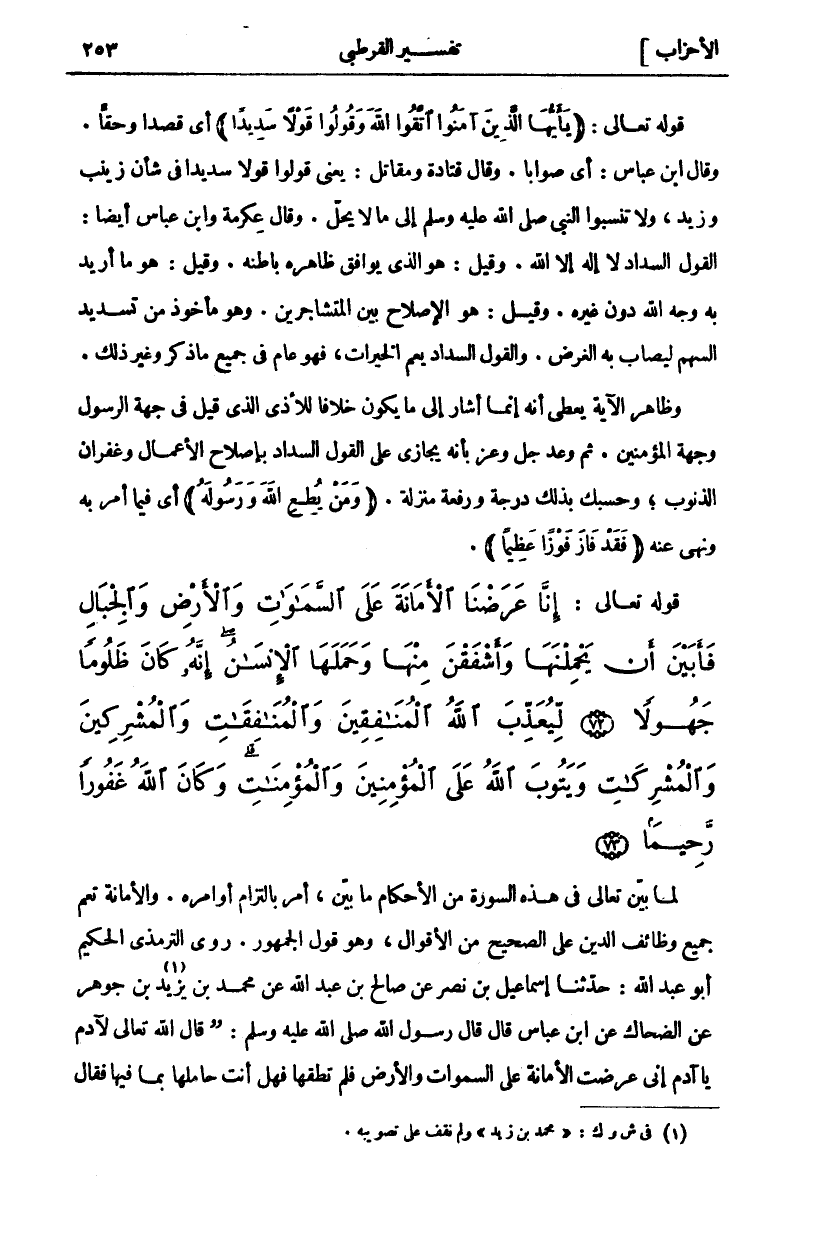 إِنَّا عَرَضْنَا الْأَمانَةَ عَلَى السَّماواتِ وَالْأَرْضِ وَالْجِبالِ فَأَبَيْنَ أَنْ يَحْمِلْنَها وَأَشْفَقْنَ مِنْها وَحَمَلَهَا الْإِنْسانُ إِنَّهُ كانَ ظَلُوماً جَهُولاً (٧٢) لِيُعَذِّبَ اللَّهُ الْمُنافِقِينَ وَالْمُنافِقاتِ وَالْمُشْرِكِينَ وَالْمُشْرِكاتِ وَيَتُوبَ اللَّهُ عَلَى الْمُؤْمِنِينَ وَالْمُؤْمِناتِ وَكانَ اللَّهُ غَفُوراً رَحِيماً (٧٣)