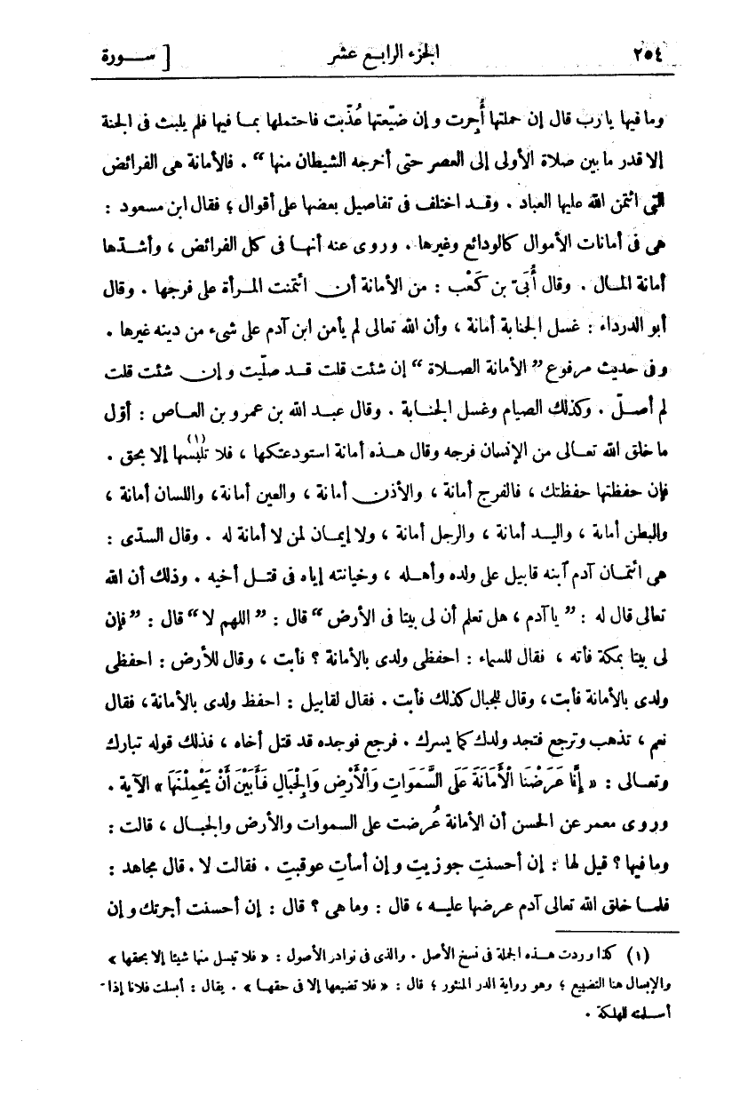 وَمَا فِيهَا يَا رَبِّ قَالَ إِنْ حَمَلْتَهَا أُجِرْتَ وَإِنْ ضَيَّعْتَهَا عُذِّبْتَ فَاحْتَمَلَهَا بِمَا فِيهَا فَلَمْ يَلْبَثْ فِي الْجَنَّةِ إِلَّا قَدْرَ مَا بَيْنَ صَلَاةِ الْأُولَى إِلَى الْعَصْرِ حَتَّى أَخْرَجَهُ الشَّيْطَانُ مِنْهَا (. فَالْأَمَانَةُ هِيَ الْفَرَائِضُ الَّتِي ائْتَمَنَ اللَّهُ عَلَيْهَا الْعِبَادَ. وَقَدِ اخْتُلِفَ فِي تَفَاصِيلِ بَعْضِهَا عَلَى أَقْوَالٍ، فَقَالَ ابْنُ مَسْعُودٍ: هِيَ فِي أَمَانَاتِ الْأَمْوَالِ كَالْوَدَائِعِ وَغَيْرِهَا. وَرُوِيَ عَنْهُ أَنَّهَا فِي كُلِّ الْفَرَائِضِ، وَأَشَدُّهَا أَمَانَةً الْمَالُ. وَقَالَ أُبَيُّ بْنُ كَعْبٍ: مِنَ الْأَمَانَةِ أَنِ ائْتُمِنَتِ الْمَرْأَةُ عَلَى فَرْجِهَا. وَقَالَ أَبُو الدَّرْدَاءِ: غُسْلُ الْجَنَابَةِ أَمَانَةٌ، وَأَنَّ اللَّهَ تَعَالَى لَمْ يأمن ابن آدم على شي مِنْ دِينِهِ غَيْرَهَا. وَفِي حَدِيثٍ مَرْفُوعٍ (الْأَمَانَةُ الصَّلَاةُ) إِنْ شِئْتَ قُلْتَ قَدْ صَلَّيْتُ وَإِنْ شِئْتَ قُلْتَ لَمْ أُصَلِّ. وَكَذَلِكَ الصِّيَامُ وَغُسْلُ الْجَنَابَةِ. وَقَالَ عَبْدُ اللَّهِ بْنُ عَمْرِو بْنِ الْعَاصِ: أَوَّلُ مَا خَلَقَ اللَّهُ تَعَالَى مِنَ الْإِنْسَانِ فَرْجَهُ وَقَالَ هَذِهِ أَمَانَةٌ اسْتَوْدَعْتُكَهَا، فَلَا تَلْبَسُهَا «١» إِلَّا بِحَقٍّ. فَإِنْ حَفِظْتَهَا حَفِظْتُكَ فَالْفَرْجُ أَمَانَةٌ، وَالْأُذُنُ أَمَانَةٌ، وَالْعَيْنُ أَمَانَةٌ، وَاللِّسَانُ أَمَانَةٌ، وَالْبَطْنُ أَمَانَةٌ، وَالْيَدُ أَمَانَةٌ، وَالرِّجْلُ أَمَانَةٌ، وَلَا إِيمَانَ لِمَنْ لَا أَمَانَةَ لَهُ. وَقَالَ السُّدِّيُّ: هِيَ ائْتِمَانُ آدَمَ ابْنَهُ قَابِيلَ عَلَى وَلَدِهِ وَأَهْلِهِ، وَخِيَانَتُهُ إِيَّاهُ فِي قَتْلِ أَخِيهِ. وَذَلِكَ أَنَّ اللَّهَ تَعَالَى قَالَ لَهُ: (يَا آدَمُ، هَلْ تَعْلَمُ أَنَّ لِي بَيْتًا فِي الْأَرْضِ) قَالَ: (اللَّهُمَّ لَا) قَالَ: (فَإِنَّ لِي بَيْتًا بِمَكَّةَ فَأْتِهِ، فَقَالَ لِلسَّمَاءِ: احْفَظِي وَلَدِي بِالْأَمَانَةِ؟ فَأَبَتْ، وَقَالَ لِلْأَرْضِ: احْفَظِي وَلَدِي بِالْأَمَانَةِ فَأَبَتْ، وَقَالَ لِلْجِبَالِ كَذَلِكَ فَأَبَتْ. فَقَالَ لِقَابِيلَ: احْفَظْ وَلَدِي بِالْأَمَانَةِ، فَقَالَ نَعَمْ، تَذْهَبُ وَتَرْجِعُ فَتَجِدُ وَلَدَكَ كَمَا يَسُرُّكَ. فَرَجَعَ فَوَجَدَهُ قَدْ قَتَلَ أَخَاهُ، فَذَلِكَ قَوْلُهُ تَبَارَكَ وَتَعَالَى:" إِنَّا عَرَضْنَا الْأَمانَةَ عَلَى السَّماواتِ وَالْأَرْضِ وَالْجِبالِ فَأَبَيْنَ أَنْ يَحْمِلْنَها". الْآيَةَ. وَرَوَى مَعْمَرٌ عَنِ الْحَسَنِ أَنَّ الْأَمَانَةَ عُرِضَتْ عَلَى السَّمَاوَاتِ وَالْأَرْضِ وَالْجِبَالِ، قَالَتْ: وَمَا فِيهَا؟ قِيلَ لَهَا: إِنْ أَحْسَنْتِ جُوزِيتِ وَإِنْ أَسَأْتِ عُوقِبْتِ. فَقَالَتْ لَا. قَالَ مُجَاهِدٌ: فَلَمَّا خَلَقَ اللَّهُ تَعَالَى آدَمُ عَرَضَهَا عَلَيْهِ، قال: وما هي؟ قال: إن حسنت أجرتك وإن