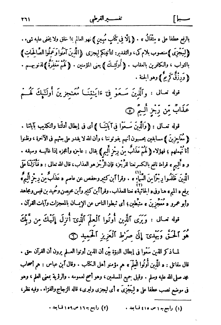قَوْلُهُ تَعَالَى: (وَالَّذِينَ سَعَوْا فِي آياتِنا) أَيْ فِي إِبْطَالِ أَدِلَّتِنَا والتكذيب بآياتنا. (مُعاجِزِينَ) مسابقين يحسبون أنهم يفتوننا، وَأَنَّ اللَّهَ لَا يَقْدِرُ عَلَى بَعْثِهِمْ فِي الْآخِرَةِ، وَظَنُّوا أَنَّا نُهْمِلُهُمْ، فَهَؤُلَاءِ" لَهُمْ عَذابٌ مِنْ رِجْزٍ أَلِيمٌ" يقال: عَاجَزَهُ وَأَعْجَزَهُ إِذَا غَالَبَهُ وَسَبَقَهُ. وَ" أَلِيمٌ" قِرَاءَةُ نَافِعٍ بِالْكَسْرِ نَعْتًا لِلرِّجْزِ، فَإِنَّ الرِّجْزَ هُوَ الْعَذَابُ، قَالَ اللَّهُ تَعَالَى:" فَأَنْزَلْنا عَلَى الَّذِينَ ظَلَمُوا رِجْزاً مِنَ السَّماءِ" «١» [البقرة: ٥٩]. وَقَرَأَ ابْنُ كَثِيرٍ وَحَفْصٌ عَنْ عَاصِمٍ" عَذابٌ مِنْ رِجْزٍ أَلِيمٌ" بِرَفْعِ" الْمِيمِ" هُنَا وَفِي" الْجَاثِيَةِ" «٢» نَعْتًا لِلْعَذَابِ. وَقَرَأَ ابْنُ كَثِيرٍ وَابْنُ مُحَيْصِنٍ وَحُمَيْدُ بْنُ قَيْسٍ وَمُجَاهِدٌ وَأَبُو عَمْرٍو" مُعَجِّزِينَ" مُثَبِّطِينَ، أَيْ ثَبَّطُوا النَّاسَ عَنِ الْإِيمَانِ بالمعجزات وآيات القرآن.