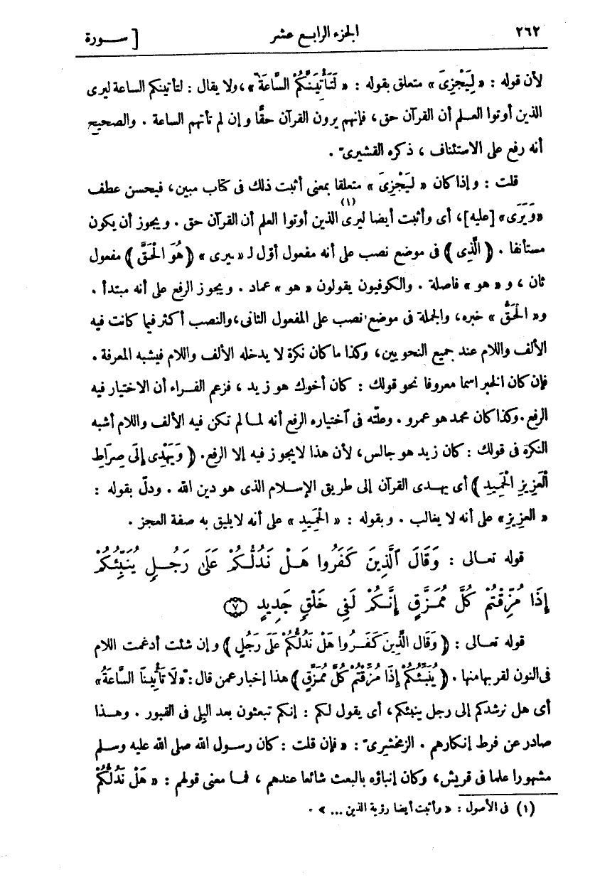 لِأَنَّ قَوْلَهُ:" لِيَجْزِيَ" مُتَعَلِّقٌ بِقَوْلِهِ:" لَتَأْتِيَنَّكُمْ" السَّاعَةُ، وَلَا يُقَالُ: لَتَأْتِيَنَّكُمُ السَّاعَةُ لِيَرَى الَّذِينَ أُوتُوا الْعِلْمَ أَنَّ الْقُرْآنَ حَقٌّ، فَإِنَّهُمْ يَرَوْنَ الْقُرْآنَ حَقًّا وَإِنْ لَمْ تَأْتِهِمُ السَّاعَةُ. وَالصَّحِيحُ أَنَّهُ رُفِعَ عَلَى الِاسْتِئْنَافِ، ذَكَرَهُ الْقُشَيْرِيُّ. قُلْتُ: وَإِذَا كَانَ" لِيَجْزِيَ" مُتَعَلِّقًا بِمَعْنَى أَثْبَتَ ذَلِكَ فِي كِتَابٍ مُبِينٍ، فَيَحْسُنُ عَطْفُ" وَيَرَى" [عَلَيْهِ [، أَيْ وأَثْبَتَ أَيْضًا لِيَرَى «١» الَّذِينَ أُوتُوا الْعِلْمَ أَنَّ الْقُرْآنَ حَقٌّ. وَيَجُوزُ أَنْ يَكُونَ مُسْتَأْنَفًا." الَّذِي" فِي مَوْضِعِ نَصْبٍ عَلَى أَنَّهُ مَفْعُولٌ أَوَّلُ لِ"- يَرَى"" هُوَ الْحَقَّ" مَفْعُولٌ ثَانٍ، وَ" هُوَ" فَاصِلَةٌ. وَالْكُوفِيُّونَ يَقُولُونَ" هُوَ" عِمَادٌ. وَيَجُوزُ الرفع على أنه مبتدأ. و" الْحَقَّ" خَبَرُهُ، وَالْجُمْلَةُ فِي مَوْضِعِ نَصْبٍ عَلَى الْمَفْعُولِ الثَّانِي، وَالنَّصْبُ أَكْثَرُ فِيمَا كَانَتْ فِيهِ الْأَلِفُ وَاللَّامُ عِنْدَ جَمِيعِ النَّحْوِيِّينَ، وَكَذَا مَا كَانَ نَكِرَةً لَا يَدْخُلُهُ الْأَلِفُ وَاللَّامُ فَيُشْبِهُ الْمَعْرِفَةَ. فَإِنْ كَانَ الْخَبَرُ اسْمًا مَعْرُوفًا نَحْوَ قَوْلِكَ: كَانَ أَخُوكَ هُوَ زَيْدٌ، فَزَعَمَ الْفَرَّاءُ أَنَّ الِاخْتِيَارَ فِيهِ الرَّفْعُ. وَكَذَا كَانَ مُحَمَّدٌ هُوَ عمرو. وعلته في اختياره الرفع أنه لَمْ تَكُنْ فِيهِ الْأَلِفُ وَاللَّامُ أَشْبَهَ النَّكِرَةَ فِي قَوْلِكَ: كَانَ زَيْدٌ هُوَ جَالِسٌ، لِأَنَّ هَذَا لَا يَجُوزُ فِيهِ إِلَّا الرَّفْعُ. (وَيَهْدِي إِلى صِراطِ الْعَزِيزِ الْحَمِيدِ) أَيْ يَهْدِي الْقُرْآنُ إِلَى طَرِيقِ الْإِسْلَامِ الَّذِي هُوَ دِينُ اللَّهِ. وَدَلَّ بِقَوْلِهِ:" الْعَزِيزِ" عَلَى أَنَّهُ لَا يُغَالَبُ. وَبِقَوْلِهِ:" الْحَمِيدِ" عَلَى أَنَّهُ لَا يَلِيقُ بِهِ صفة العجز.