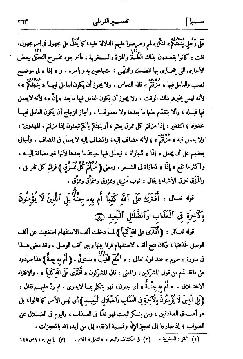 قَوْلُهُ تَعَالَى: (أَفْتَرى عَلَى اللَّهِ كَذِباً) لَمَّا دَخَلَتْ أَلِفُ الِاسْتِفْهَامِ اسْتَغْنَيْتُ عَنْ أَلِفِ الْوَصْلِ فَحَذَفْتُهَا، وَكَانَ فَتْحُ أَلِفِ الِاسْتِفْهَامِ فَرْقًا بَيْنَهَا وَبَيْنَ أَلِفِ الْوَصْلِ. وَقَدْ مَضَى هَذَا فِي سُورَةِ" مَرْيَمَ" عِنْدَ قَوْلِهِ تَعَالَى:" أَطَّلَعَ الْغَيْبَ" «٣» [مريم: ٧٨] مُسْتَوْفًى. (أَمْ بِهِ جِنَّةٌ) هَذَا مَرْدُودٌ عَلَى مَا تَقَدَّمَ مِنْ قَوْلِ الْمُشْرِكِينَ، وَالْمَعْنَى: قَالَ الْمُشْرِكُونَ" أَفْتَرى عَلَى اللَّهِ كَذِباً". وَالِافْتِرَاءُ الِاخْتِلَاقُ." أَمْ بِهِ جِنَّةٌ" أَيْ جُنُونٌ، فَهُوَ يَتَكَلَّمُ بِمَا لَا يَدْرِي. ثُمَّ رَدَّ عَلَيْهِمْ فَقَالَ: (بَلِ الَّذِينَ لَا يُؤْمِنُونَ بِالْآخِرَةِ فِي الْعَذابِ وَالضَّلالِ الْبَعِيدِ) أَيْ لَيْسَ الْأَمْرُ كَمَا قَالُوا، بَلْ هُوَ أَصْدَقُ الصَّادِقِينَ، وَمَنْ يُنْكِرُ الْبَعْثَ فَهُوَ غَدًا فِي الْعَذَابِ، وَالْيَوْمَ فِي الضَّلَالِ عَنِ الصَّوَابِ، إِذْ صَارُوا إِلَى تَعْجِيزِ الْإِلَهِ وَنِسْبَةِ الِافْتِرَاءِ إِلَى مَنْ أَيَّدَهُ اللَّهُ بِالْمُعْجِزَاتِ.