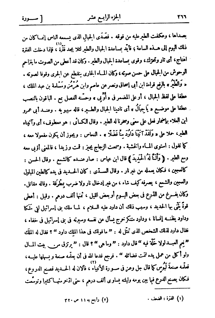 بِصَدَاهَا، وَعَكَفَتِ الطَّيْرُ عَلَيْهِ مِنْ فَوْقِهِ. فَصَدَى الْجِبَالُ الَّذِي يَسْمَعُهُ النَّاسُ إِنَّمَا كَانَ مِنْ ذَلِكَ الْيَوْمِ إِلَى هَذِهِ السَّاعَةِ، فَأُيِّدَ بِمُسَاعَدَةِ الْجِبَالِ وَالطَّيْرِ لِئَلَّا يَجِدَ فَتْرَةً «١»، فَإِذَا دَخَلَتِ الْفَتْرَةُ اهْتَاجَ، أَيْ ثَارَ وَتَحَرَّكَ، وَقَوِيَ بِمُسَاعَدَةِ الْجِبَالِ وَالطَّيْرِ. وَكَانَ قَدْ أُعْطِيَ مِنَ الصَّوْتِ مَا يَتَزَاحَمُ الْوُحُوشُ مِنَ الْجِبَالِ عَلَى حُسْنِ صَوْتِهِ، وَكَانَ الْمَاءُ الْجَارِي يَنْقَطِعُ عَنِ الْجَرْيِ وُقُوفًا لِصَوْتِهِ." وَالطَّيْرُ" بِالرَّفْعِ قِرَاءَةُ ابْنِ أَبِي إِسْحَاقَ وَنَصْرٍ عَنْ عَاصِمٍ وَابْنِ هُرْمُزَ وَمَسْلَمَةَ بْنِ عَبْدِ الْمَلِكِ، عَطْفًا عَلَى لَفْظِ الْجِبَالِ، أَوْ عَلَى الْمُضْمَرِ فِي" أَوِّبِي" وَحَسَّنَهُ الْفَصْلُ بِمَعَ. الْبَاقُونَ بِالنَّصْبِ عَطْفًا عَلَى مَوْضِعِ" يَا جِبَالُ" أَيْ نَادَيْنَا الْجِبَالَ وَالطَّيْرَ، قَالَهُ سِيبَوَيْهِ. وعند أبي عمرو ابن الْعَلَاءِ بِإِضْمَارِ فِعْلٍ عَلَى مَعْنَى وَسَخَّرْنَا لَهُ الطَّيْرَ. وَقَالَ الْكِسَائِيُّ: هُوَ مَعْطُوفٌ، أَيْ وَآتَيْنَاهُ الطير، حملا على" ولقد آتينا داود ما فَضْلًا". النَّحَّاسُ: وَيَجُوزُ أَنْ يَكُونَ مَفْعُولًا مَعَهُ، كَمَا تَقُولُ: اسْتَوَى الْمَاءُ وَالْخَشَبَةَ. وَسَمِعْتُ الزَّجَّاجَ يُجِيزُ: قُمْتُ وَزَيْدًا، فَالْمَعْنَى أَوِّبِي مَعَهُ وَمَعَ الطَّيْرِ. (وَأَلَنَّا لَهُ الْحَدِيدَ) قَالَ ابْنُ عَبَّاسٍ: صَارَ عِنْدَهُ كَالشَّمْعِ. وَقَالَ الْحَسَنُ: كَالْعَجِينِ، فَكَانَ يَعْمَلُهُ مِنْ غَيْرِ نَارٍ. وَقَالَ السُّدِّيُّ: كَانَ الْحَدِيدُ فِي يَدِهِ كَالطِّينِ الْمَبْلُولِ وَالْعَجِينِ وَالشَّمْعِ، يَصْرِفُهُ كَيْفَ شَاءَ، مِنْ غَيْرِ إِدْخَالِ نَارٍ وَلَا ضَرْبٍ بِمِطْرَقَةٍ. وَقَالَهُ مُقَاتِلٌ. وَكَانَ يَفْرُغُ مِنَ الدِّرْعِ فِي بَعْضِ الْيَوْمِ أَوْ بَعْضِ اللَّيْلِ، ثَمَنُهَا أَلْفُ دِرْهَمٍ. وَقِيلَ: أُعْطِيَ قُوَّةً يَثْنِي بِهَا الْحَدِيدَ، وَسَبَبُ ذَلِكَ أَنَّ دَاوُدَ عَلَيْهِ السَّلَامُ، لَمَّا مَلَكَ بَنِي إِسْرَائِيلَ لَقِيَ مَلَكًا وَدَاوُدُ يَظُنُّهُ إِنْسَانًا، وَدَاوُدُ مُتَنَكِّرٌ خَرَجَ يَسْأَلُ عَنْ نَفْسِهِ وَسِيرَتِهِ فِي بَنِي إِسْرَائِيلَ فِي خَفَاءٍ، فَقَالَ دَاوُدُ لِذَلِكَ الشَّخْصِ الَّذِي تَمَثَّلَ لَهُ: (مَا قَوْلُكَ فِي هَذَا الْمَلِكِ دَاوُدَ)؟ فَقَالَ لَهُ الْمَلَكُ (نِعْمَ الْعَبْدُ لَوْلَا خَلَّةٌ فِيهِ) قَالَ دَاوُدُ: (وَمَا هِيَ)؟ قَالَ: (يَرْتَزِقُ مِنْ بَيْتِ الْمَالِ وَلَوْ أَكَلَ مِنْ عَمَلِ يَدِهِ لَتَمَّتْ فَضَائِلُهُ). فَرَجَعَ فَدَعَا اللَّهَ فِي أَنْ يُعَلِّمَهُ صَنْعَةً وَيُسَهِّلَهَا عَلَيْهِ، فَعَلَّمَهُ صنعة لبوس كما قال عز وجل فِي سُورَةِ الْأَنْبِيَاءٍ «٢»، فَأَلَانَ لَهُ الْحَدِيدَ فَصَنَعَ الدُّرُوعَ، فَكَانَ يَصْنَعُ الدِّرْعَ فِيمَا بَيْنَ يَوْمِهِ وَلَيْلَتِهِ يُسَاوِي أَلْفَ دِرْهَمٍ، حَتَّى ادَّخَرَ مِنْهَا كثيرا وتوسعت