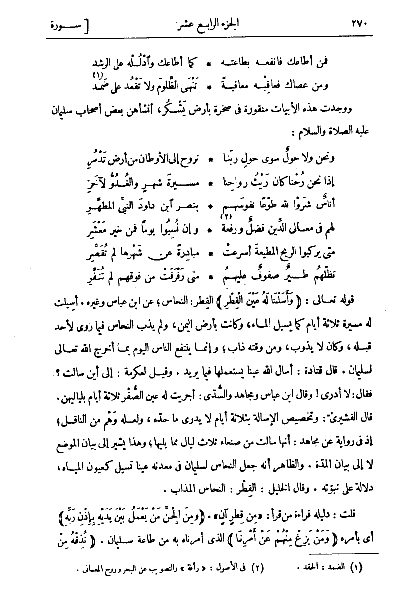 قَوْلُهُ تَعَالَى: (وَأَسَلْنا لَهُ عَيْنَ الْقِطْرِ) الْقِطْرُ: النُّحَاسُ، عَنِ ابْنِ عَبَّاسٍ وَغَيْرِهِ. أُسِيلَتْ لَهُ مَسِيرَةَ ثَلَاثَةِ أَيَّامٍ كَمَا يَسِيلُ الْمَاءُ، وَكَانَتْ بِأَرْضِ الْيَمَنِ، وَلَمْ يَذُبِ النُّحَاسُ فِيمَا رُوِيَ لِأَحَدٍ قَبْلَهُ، وَكَانَ لَا يَذُوبُ، وَمِنْ وَقْتِهِ ذَابَ، وَإِنَّمَا يَنْتَفِعُ النَّاسُ الْيَوْمَ بِمَا أَخْرَجَ اللَّهُ تَعَالَى لِسُلَيْمَانَ. قَالَ قَتَادَةُ: أَسَالَ اللَّهُ عَيْنًا يَسْتَعْمِلُهَا فِيمَا يُرِيدُ. وَقِيلَ لِعِكْرِمَةَ: إِلَى أَيْنَ سَالَتْ؟ فَقَالَ: لَا أَدْرِي! وَقَالَ ابْنُ عَبَّاسٍ وَمُجَاهِدٌ وَالسُّدِّيُّ: أُجْرِيَتْ لَهُ عَيْنُ الصُّفْرِ ثَلَاثَةَ أَيَّامٍ بِلَيَالِيهِنَّ. قَالَ الْقُشَيْرِيُّ: وَتَخْصِيصُ الْإِسَالَةِ بِثَلَاثَةِ أَيَّامٍ لَا يُدْرَى مَا حَدُّهُ، وَلَعَلَّهُ وَهْمٌ مِنَ النَّاقِلِ، إِذْ فِي رِوَايَةٍ عَنْ مُجَاهِدٍ: أَنَّهَا سَالَتْ مِنْ صَنْعَاءَ ثَلَاثَ لَيَالٍ مِمَّا يَلِيهَا، وَهَذَا يُشِيرُ إِلَى بَيَانِ الْمَوْضِعِ لَا إِلَى بَيَانِ الْمُدَّةِ. وَالظَّاهِرُ أَنَّهُ جُعِلَ النُّحَاسُ لِسُلَيْمَانَ فِي مَعْدِنِهِ عَيْنًا تَسِيلُ كَعُيُونِ الْمِيَاهِ، دَلَالَةً عَلَى نُبُوَّتِهِ. وَقَالَ الْخَلِيلُ: الْقِطْرُ: النُّحَاسُ الْمُذَابُ. قُلْتُ: دَلِيلُهُ قِرَاءَةُ مَنْ قَرَأَ:" من قطران". (وَمِنَ الْجِنِّ مَنْ يَعْمَلُ بَيْنَ يَدَيْهِ بِإِذْنِ رَبِّهِ) أَيْ بِأَمْرِهِ (وَمَنْ يَزِغْ مِنْهُمْ عَنْ أَمْرِنا) الَّذِي أَمَرْنَاهُ بِهِ مِنْ طَاعَةِ سُلَيْمَانَ.