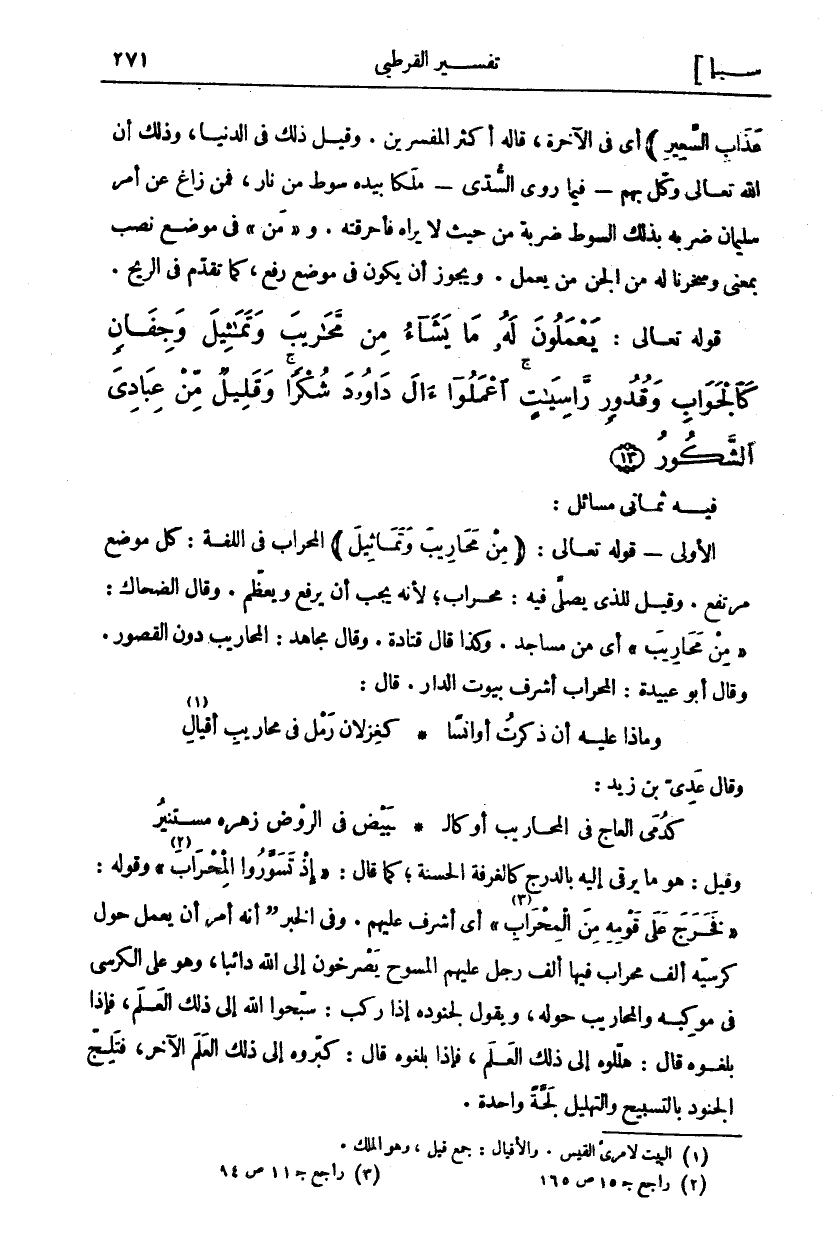 فِيهِ ثَمَانِي مسائل: الاولى- قوله تعالى:" مِنْ مَحارِيبَ وَتَماثِيلَ" الْمِحْرَابُ فِي اللُّغَةِ: كُلُّ مَوْضِعٍ مُرْتَفِعٍ. وَقِيلَ لِلَّذِي يُصَلَّى فِيهِ: مِحْرَابٌ، لِأَنَّهُ يَجِبُ أَنْ يرفع ومعظم. وَقَالَ الضَّحَّاكُ:" مِنْ مَحارِيبَ" أَيْ مِنْ مَسَاجِدَ. وَكَذَا قَالَ قَتَادَةُ. وَقَالَ مُجَاهِدٌ: الْمَحَارِيبُ دُونَ الْقُصُورِ. وَقَالَ أَبُو عُبَيْدَةَ: الْمِحْرَابُ أَشْرَفُ بُيُوتِ الدار. قال: