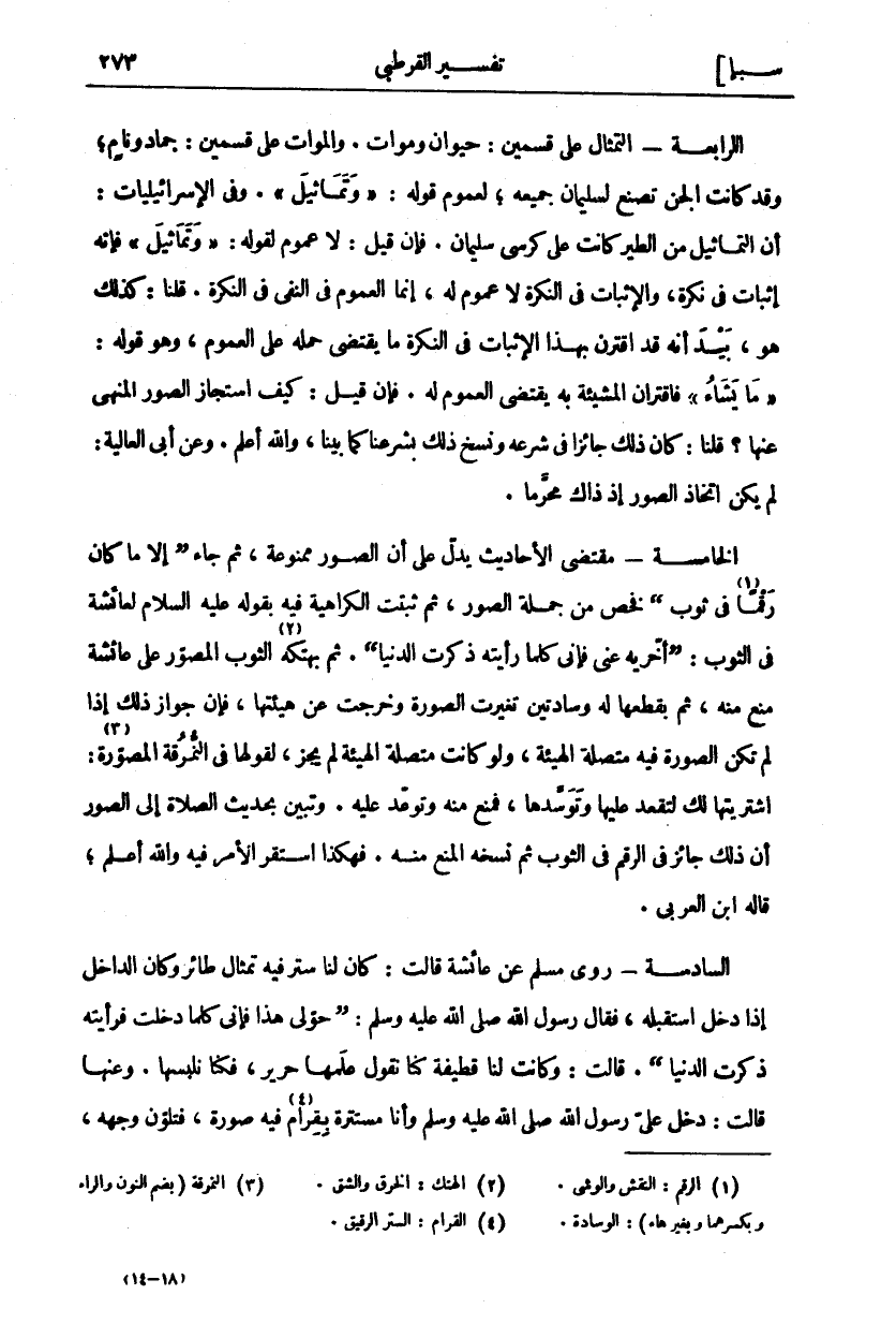 الرَّابْعَةُ- التِّمْثَالُ عَلَى قِسْمَيْنِ: حَيَوَانٌ وَمَوَاتٌ. وَالْمَوَاتُ عَلَى قِسْمَيْنِ: جَمَادٌ وَنَامٍ، وَقَدْ كَانَتِ الْجِنُّ تَصْنَعُ لِسُلَيْمَانَ جَمِيعَهُ، لِعُمُومِ قَوْلِهِ:" وَتَماثِيلَ". وَفِي الْإِسْرَائِيلِيَّاتِ: أَنَّ التَّمَاثِيلَ مِنَ الطَّيْرِ كَانَتْ عَلَى كُرْسِيِّ سُلَيْمَانَ. فَإِنْ قِيلَ: لَا عُمُومَ لِقَوْلِهِ:" وَتَماثِيلَ" فَإِنَّهُ إِثْبَاتٌ فِي نَكِرَةٍ، وَالْإِثْبَاتُ فِي النَّكِرَةِ لَا عُمُومَ لَهُ، إِنَّمَا الْعُمُومُ فِي النَّفْيِ فِي النَّكِرَةِ. قُلْنَا: كَذَلِكَ هُوَ، بَيْدَ أَنَّهُ قَدِ اقْتَرَنَ بِهَذَا الْإِثْبَاتِ فِي النَّكِرَةِ مَا يَقْتَضِي حَمْلَهُ عَلَى الْعُمُومِ، وَهُوَ قَوْلُهُ:" مَا يَشاءُ" فَاقْتِرَانُ الْمِشْيَئةِ بِهِ يَقْتَضِي الْعُمُومَ لَهُ. فَإِنْ قِيلَ: كَيْفَ اسْتَجَازَ الصُّوَرَ الْمَنْهِيَّ عَنْهَا؟ قُلْنَا: كَانَ ذَلِكَ جَائِزًا فِي شَرْعِهِ وَنُسِخَ ذَلِكَ بِشَرْعِنَا كَمَا بَيَّنَّا، وَاللَّهُ أَعْلَمُ. وَعَنْ أَبِي الْعَالِيَةِ: لَمْ يَكُنِ اتِّخَاذُ الصُّوَرِ إذ ذاك محرما. الخامسة- ومقتضى الأحاديث يدل على أَنَّ الصُّوَرَ مَمْنُوعَةٌ، ثُمَّ جَاءَ (إِلَّا مَا كَانَ رَقْمًا «١» فِي ثَوْبٍ) فَخُصَّ مِنْ جُمْلَةِ الصُّوَرِ، ثُمَّ ثَبَتَتِ الْكَرَاهِيَةُ فِيهِ بِقَوْلِهِ عَلَيْهِ السَّلَامُ لِعَائِشَةَ فِي الثَّوْبِ: (أَخِّرِيهِ عَنِّي فَإِنِّي كُلَّمَا رَأَيْتُهُ ذَكَرْتُ الدُّنْيَا). ثُمَّ بِهَتْكِهِ «٢» الثَّوْبَ الْمُصَوَّرَ عَلَى عَائِشَةَ مَنَعَ مِنْهُ، ثُمَّ بِقَطْعِهَا لَهُ وِسَادَتَيْنِ تَغَيَّرَتِ الصُّورَةُ وَخَرَجَتْ عَنْ هَيْئَتِهَا، فَإِنَّ جَوَازَ ذَلِكَ إِذَا لَمْ تَكُنِ الصُّورَةُ فِيهِ مُتَّصِلَةَ الْهَيْئَةِ، وَلَوْ كَانَتْ مُتَّصِلَةَ الْهَيْئَةِ لَمْ يَجُزْ، لِقَوْلِهَا فِي النُّمْرُقَةِ الْمُصَوَّرَةِ: «٣» اشْتَرَيْتُهَا لَكَ لِتَقْعُدَ عَلَيْهَا وَتَوَسَّدَهَا، فَمَنَعَ مِنْهُ وَتَوَعَّدَ عَلَيْهِ. وَتَبَيَّنَ بِحَدِيثِ الصَّلَاةِ إِلَى الصُّوَرِ أَنَّ ذَلِكَ جَائِزٌ فِي الرَّقْمِ فِي الثَّوْبِ ثُمَّ نَسَخَهُ الْمَنْعُ مِنْهُ. فَهَكَذَا اسْتَقَرَّ الْأَمْرُ فِيهِ وَاللَّهُ أَعْلَمُ، قَالَهُ ابْنُ الْعَرَبِيِّ. السَّادِسَةُ- رَوَى مُسْلِمٌ عَنْ عَائِشَةَ قَالَتْ: كَانَ لَنَا سِتْرٌ فِيهِ تِمْثَالٌ طَائِرٌ وَكَانَ الدَّاخِلُ إِذَا دَخَلَ اسْتَقْبَلَهُ، فَقَالَ رَسُولُ اللَّهِ صَلَّى اللَّهُ عَلَيْهِ وَسَلَّمَ: (حَوِّلِي هَذَا فَإِنِّي كُلَّمَا دَخَلْتُ فَرَأَيْتُهُ ذَكَرْتُ الدُّنْيَا). قَالَتْ: وَكَانَتْ لَنَا قَطِيفَةٌ كُنَّا نَقُولُ عَلَمُهَا حَرِيرٌ، فَكُنَّا نَلْبَسُهَا. وَعَنْهَا قَالَتْ: دُخِلَ عَلَى رَسُولِ اللَّهِ صَلَّى اللَّهُ عَلَيْهِ وَسَلَّمَ وَأَنَا مُسْتَتِرَةٌ بِقِرَامٍ «٤» فِيهِ صُورَةٌ، فَتَلَوَّنَ وجهه،