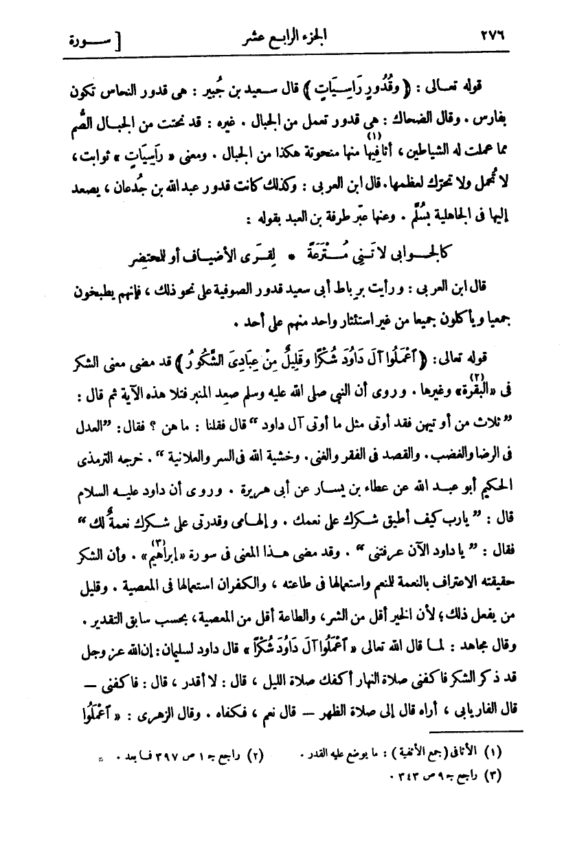 قَالَ ابْنُ الْعَرَبِيِّ: وَرَأَيْتُ بِرِبَاطِ أَبِي سَعِيدٍ قُدُورَ الصُّوفِيَّةِ عَلَى نَحْوِ ذَلِكَ، فَإِنَّهُمْ يَطْبُخُونَ جَمِيعًا وَيَأْكُلُونَ جَمِيعًا مِنْ غَيْرِ اسْتِئْثَارِ وَاحِدٍ مِنْهُمْ عَلَى أَحَدٍ. قَوْلُهُ تَعَالَى: (اعْمَلُوا آلَ داوُدَ شُكْراً وَقَلِيلٌ مِنْ عِبادِيَ الشَّكُورُ) قَدْ مَضَى مَعْنَى الشُّكْرِ فِي" الْبَقَرَةِ" «٢» وَغَيْرِهَا. وَرُوِيَ أَنَّ النَّبِيَّ صَلَّى اللَّهُ عَلَيْهِ وَسَلَّمَ صَعِدَ الْمِنْبَرَ فَتَلَا هَذِهِ الْآيَةَ ثُمَّ قَالَ: (ثَلَاثٌ مَنْ أُوتِيَهُنَّ فَقَدْ أُوتِيَ مِثْلَ مَا أُوتِيَ آلُ دَاوُدَ) قَالَ فَقُلْنَا: مَا هُنَّ. فَقَالَ: (الْعَدْلُ فِي الرِّضَا وَالْغَضَبِ. وَالْقَصْدُ فِي الْفَقْرِ وَالْغِنَى. وَخَشْيَةُ اللَّهِ فِي السِّرِّ وَالْعَلَانِيَةِ). خَرَّجَهُ التِّرْمِذِيُّ الْحَكِيمُ أَبُو عَبْدِ اللَّهِ عَنْ عَطَاءِ بْنِ يَسَارٍ عَنْ أَبِي هُرَيْرَةَ. وَرُوِيَ أَنَّ دَاوُدَ عَلَيْهِ السَّلَامُ قَالَ: (يَا رَبِّ كَيْفَ أُطِيقُ شُكْرَكَ عَلَى نِعَمِكَ. وَإِلْهَامِي وَقُدْرَتِي عَلَى شُكْرِكَ نِعْمَةٌ لَكَ) فَقَالَ: (يَا دَاوُدُ الْآنَ عَرَفْتَنِي). وَقَدْ مَضَى هَذَا الْمَعْنَى فِي سُورَةِ" إِبْرَاهِيمَ" «٣». وَأَنَّ الشُّكْرَ حَقِيقَتُهُ الِاعْتِرَافُ بِالنِّعْمَةِ لِلْمُنْعِمِ وَاسْتِعْمَالُهَا فِي طَاعَتِهِ، وَالْكُفْرَانُ اسْتِعْمَالُهَا فِي الْمَعْصِيَةِ. وَقَلِيلٌ مَنْ يَفْعَلُ ذَلِكَ، لِأَنَّ الْخَيْرَ أَقَلُّ مِنَ الشَّرِّ، وَالطَّاعَةُ أَقَلُّ مِنَ الْمَعْصِيَةِ، بِحَسَبِ سَابِقِ التَّقْدِيرِ. وَقَالَ مُجَاهِدٌ: لَمَّا قَالَ اللَّهُ تَعَالَى" اعْمَلُوا آلَ داوُدَ شُكْراً" قَالَ دَاوُدُ لِسُلَيْمَانَ: إِنَّ اللَّهَ عَزَّ وَجَلَّ قَدْ ذَكَرَ الشُّكْرَ فَاكْفِنِي صَلَاةَ النَّهَارِ أَكْفِكَ صَلَاةَ اللَّيْلِ، قَالَ: لَا أَقْدِرُ، قَالَ: فَاكْفِنِي- قَالَ الْفَارَيَابِيُّ، أُرَاهُ قَالَ إِلَى صَلَاةِ الظهر- قال نعم، فكفاه. وقال الزهري:
