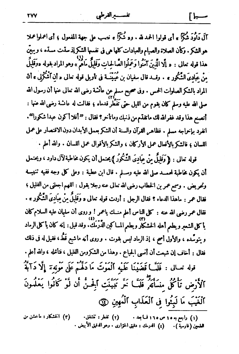 " اعْمَلُوا آلَ داوُدَ شُكْراً" أَيْ قُولُوا الْحَمْدُ لِلَّهِ. وَ" شُكْراً" نُصِبَ عَلَى جِهَةِ الْمَفْعُولِ، أَيِ اعْمَلُوا عَمَلًا هُوَ الشُّكْرُ. وَكَأَنَّ الصَّلَاةَ وَالصِّيَامَ وَالْعِبَادَاتِ كُلَّهَا هِيَ فِي نَفْسِهَا الشُّكْرُ إِذْ سَدَّتْ مَسَدَّهُ، وَيُبَيِّنُ هَذَا قَوْلِهِ تَعَالَى:" إِلَّا الَّذِينَ آمَنُوا وَعَمِلُوا الصَّالِحاتِ وَقَلِيلٌ مَا هُمْ" «١» [ص: ٢٤] وَهُوَ الْمُرَادُ بِقَوْلِهِ" وَقَلِيلٌ مِنْ عِبادِيَ الشَّكُورُ". وَقَدْ قَالَ سُفْيَانُ بْنُ عُيَيْنَةَ فِي تَأْوِيلِ قوله تعالى" أَنِ اشْكُرْ لِي" [لقمان: ١٤] أَنَّ الْمُرَادَ بِالشُّكْرِ الصَّلَوَاتُ الْخَمْسُ. وَفِي صَحِيحِ مُسْلِمٍ عَنْ عَائِشَةَ رَضِيَ اللَّهُ تَعَالَى عَنْهَا أَنَّ رَسُولَ اللَّهِ صَلَّى اللَّهُ عَلَيْهِ وَسَلَّمَ كَانَ يَقُومُ مِنَ اللَّيْلِ حَتَّى تَفَطَّرَ «٢» قَدَمَاهُ، فَقَالَتْ لَهُ عَائِشَةُ رَضِيَ اللَّهُ عَنْهَا: أَتَصْنَعُ هَذَا وَقَدْ غَفَرَ اللَّهُ لَكَ مَا تَقَدَّمَ مِنْ ذَنْبِكَ وَمَا تَأَخَّرَ؟ فَقَالَ: (أَفَلَا أَكُونُ عَبْدًا شَكُورًا). انْفَرَدَ بِإِخْرَاجِهِ مُسْلِمٌ. فَظَاهِرُ الْقُرْآنِ وَالسُّنَّةِ أَنَّ الشُّكْرَ بِعَمَلِ الْأَبْدَانِ دُونَ الِاقْتِصَارِ عَلَى عَمَلِ اللِّسَانِ، فَالشُّكْرُ بِالْأَفْعَالِ عَمَلٌ الْأَرْكَانِ، وَالشُّكْرُ بِالْأَقْوَالِ عَمَلُ اللِّسَانِ. وَاللَّهُ أَعْلَمُ. قَوْلُهُ تَعَالَى: (وَقَلِيلٌ مِنْ عِبادِيَ الشَّكُورُ) يَحْتَمِلُ أَنْ يَكُونَ مُخَاطَبَةً لِآلِ دَاوُدَ، وَيَحْتَمِلُ أَنْ يَكُونَ مخاطبة لمحمد صلى الله اللَّهُ عَلَيْهِ وَسَلَّمَ. قَالَ ابْنُ عَطِيَّةَ: وَعَلَى كُلِّ وَجْهٍ فَفِيهِ تَنْبِيهٌ وَتَحْرِيضٌ. وَسَمِعَ عُمَرَ بْنِ الْخَطَّابِ رَضِيَ اللَّهُ تَعَالَى عَنْهُ رَجُلًا يَقُولُ: اللَّهُمَّ اجْعَلْنِي مِنَ الْقَلِيلِ، فَقَالَ عُمَرُ: مَا هَذَا الدُّعَاءُ؟ فَقَالَ الرَّجُل: أَرَدْتُ قَوْلَهُ تَعَالَى" وَقَلِيلٌ مِنْ عِبادِيَ الشَّكُورُ". فَقَالَ عُمَرُ رَضِيَ اللَّهُ عَنْهُ: كُلُّ النَّاسِ أَعْلَمُ مِنْكَ يَا عُمَرُ! وَرُوِيَ أَنَّ سُلَيْمَانَ عَلَيْهِ السَّلَامُ كَانَ يَأْكُلُ الشَّعِيرَ وَيُطْعِمُ أَهْلَهُ الْخُشْكَارَ «٣» وَيُطْعِمُ الْمَسَاكِينَ الدَّرْمَكَ «٤». وَقَدْ قِيلَ: إِنَّهُ كَانَ يَأْكُلُ الرَّمَادَ وَيَتَوَسَّدُهُ، وَالْأَوَّلُ أَصَحُّ، إِذِ الرَّمَادُ لَيْسَ بِقُوتٍ. وَرُوِيَ أَنَّهُ مَا شَبِعَ قَطُّ، فَقِيلَ لَهُ فِي ذَلِكَ فَقَالَ: أَخَافُ إِنْ شَبِعْتُ أَنْ أَنْسَى الْجِيَاعَ. وَهَذَا مِنَ الشُّكْرِ وَمِنَ القليل، فتأمله، والله أعلم.