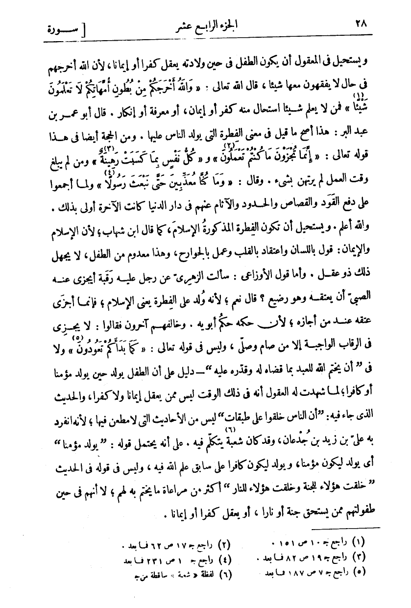وَيَسْتَحِيلُ فِي الْمَعْقُولِ أَنْ يَكُونَ الطِّفْلُ فِي حِينِ وِلَادَتِهِ يَعْقِلُ كُفْرًا أَوْ إِيمَانًا، لِأَنَّ اللَّهَ أَخْرَجَهُمْ فِي حَالٍ لَا يَفْقَهُونَ مَعَهَا شَيْئًا، قَالَ اللَّهُ تَعَالَى:" وَاللَّهُ أَخْرَجَكُمْ مِنْ بُطُونِ أُمَّهاتِكُمْ لَا تَعْلَمُونَ شَيْئاً" «١» [النحل: [فَمَنْ لَا يَعْلَمُ شَيْئًا اسْتَحَالَ مِنْهُ كُفْرٌ أَوْ إِيمَانٌ، أَوْ مَعْرِفَةٌ أَوْ إِنْكَارٌ. قَالَ أَبُو عُمَرَ بْنُ عَبْدِ الْبَرِّ: هَذَا أَصَحُّ مَا قِيلَ فِي مَعْنَى الْفِطْرَةِ الَّتِي يُولَدُ النَّاسُ عَلَيْهَا. وَمِنَ الْحُجَّةِ أَيْضًا فِي هَذَا قَوْلُهُ تَعَالَى:" إِنَّما تُجْزَوْنَ مَا كُنْتُمْ تَعْمَلُونَ" «٢» [الطور: [و" كُلُّ نَفْسٍ بِما كَسَبَتْ رَهِينَةٌ" «٣» [المدثر: [وَمَنْ لَمْ يَبْلُغْ وَقْتَ الْعَمَلِ لَمْ يَرْتَهِنْ بِشَيْءٍ. وَقَالَ:" وَما كُنَّا مُعَذِّبِينَ حَتَّى نَبْعَثَ رَسُولًا" «٤» وَلَمَّا أَجْمَعُوا عَلَى دَفْعِ الْقَوَدِ وَالْقِصَاصِ وَالْحُدُودِ وَالْآثَامِ عَنْهُمْ فِي دَارِ الدُّنْيَا كَانَتِ الْآخِرَةُ أَوْلَى بِذَلِكَ. وَاللَّهُ أَعْلَمُ. وَيَسْتَحِيلُ أَنْ تَكُونَ الْفِطْرَةُ الْمَذْكُورَةُ الْإِسْلَامَ، كَمَا قَالَ ابْنُ شِهَابٍ، لِأَنَّ الْإِسْلَامَ وَالْإِيمَانَ: قَوْلٌ بِاللِّسَانِ وَاعْتِقَادٌ بِالْقَلْبِ وَعَمَلٌ بِالْجَوَارِحِ، وَهَذَا مَعْدُومٌ مِنَ الطِّفْلِ، لَا يَجْهَلُ ذَلِكَ ذُو عَقْلٍ. وَأَمَّا قَوْلُ الْأَوْزَاعِيِّ: سَأَلْتُ الزُّهْرِيَّ عَنْ رَجُلٍ عَلَيْهِ رَقَبَةٌ أَيَجْزِي عَنْهُ الصَّبِيُّ أَنْ يُعْتِقَهُ وَهُوَ رَضِيعٌ؟ قَالَ نَعَمْ، لِأَنَّهُ وُلِدَ عَلَى الْفِطْرَةِ يَعْنِي الْإِسْلَامَ، فَإِنَّمَا أَجْزَى عِتْقُهُ عِنْدَ مَنْ أَجَازَهُ، لِأَنَّ حُكْمَهُ حُكْمُ أَبَوَيْهِ. وَخَالَفَهُمْ آخَرُونَ فَقَالُوا: لَا يَجْزِي فِي الرِّقَابِ الْوَاجِبَةِ إِلَّا مَنْ صَامَ وَصَلَّى، وَلَيْسَ فِي قَوْلِهِ تَعَالَى:" كَما بَدَأَكُمْ تَعُودُونَ" «٥» [الأعراف: [وَلَا فِي (أَنْ يَخْتِمُ اللَّهُ لِلْعَبْدِ بِمَا قَضَاهُ لَهُ وَقَدَّرَهُ عَلَيْهِ): دَلِيلٌ عَلَى أَنَّ الطِّفْلَ يُولَدُ حِينَ يُولَدُ مُؤْمِنًا أَوْ كَافِرًا، لِمَا شَهِدَتْ لَهُ الْعُقُولُ أَنَّهُ فِي ذَلِكَ الْوَقْتِ لَيْسَ مِمَّنْ يَعْقِلُ إِيمَانًا وَلَا كُفْرًا، وَالْحَدِيثُ الَّذِي جَاءَ فِيهِ: (إِنَّ النَّاسَ خُلِقُوا عَلَى طَبَقَاتٍ) لَيْسَ مِنَ الْأَحَادِيثِ الَّتِي لَا مَطْعَنَ فِيهَا، لِأَنَّهُ انْفَرَدَ بِهِ عَلِيُّ بْنُ زَيْدِ بْنِ جُدْعَانَ، وَقَدْ كَانَ شُعْبَةُ «٦» يَتَكَلَّمُ فِيهِ. عَلَى أَنَّهُ يَحْتَمِلُ قَوْلُهُ: (يُولَدُ مُؤْمِنًا) أَيْ يُولَدُ لِيَكُونَ مُؤْمِنًا، وَيُولَدُ لِيَكُونَ كَافِرًا عَلَى سَابِقِ عِلْمِ اللَّهِ فِيهِ، وَلَيْسَ فِي قَوْلِهِ فِي الْحَدِيثِ (خَلَقْتُ هَؤُلَاءِ لِلْجَنَّةِ وَخَلَقْتُ هَؤُلَاءِ لِلنَّارِ) أَكْثَرُ مِنْ مُرَاعَاةِ مَا يُخْتَمُ بِهِ لَهُمْ، لَا أَنَّهُمْ فِي حِينِ طُفُولَتِهِمْ مِمَّنْ يَسْتَحِقُّ جَنَّةً أَوْ نَارًا، أَوْ يَعْقِلُ كفرا أو إيمانا.