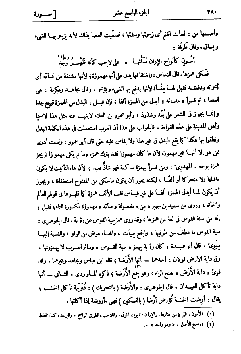 : هِيَ الْعَصَا، ثُمَّ قَرَأَ" مِنْسَاتَهُ" أَبْدَلَ مِنَ الْهَمْزَةِ أَلِفًا، فَإِنْ قِيلَ: الْبَدَلُ مِنَ الْهَمْزَةِ قَبِيحٌ جِدًّا وَإِنَّمَا يَجُوزُ فِي الشِّعْرِ عَلَى بُعْدٍ وَشُذُوذٍ، وَأَبُو عَمْرِو بْنُ الْعَلَاءِ لَا يَغِيبُ عَنْهُ مِثْلُ هَذَا لَا سِيَّمَا وَأَهْلُ الْمَدِينَةِ عَلَى هَذِهِ الْقِرَاءَةِ. فَالْجَوَابُ عَلَى هَذَا أَنَّ الْعَرَبَ اسْتَعْمَلَتْ فِي هَذِهِ الْكَلِمَةِ الْبَدَلَ وَنَطَقُوا بِهَا هَكَذَا كَمَا يَقَعُ الْبَدَلُ فِي غَيْرِ هَذَا وَلَا يقاس عليه حتى قال أبو عمور: وَلَسْتُ أَدْرِي مِمَّنْ هُوَ إِلَّا أَنَّهَا غَيْرُ مَهْمُوزَةٍ لِأَنَّ مَا كَانَ مَهْمُوزًا فَقَدْ يُتْرَكُ هَمْزُهُ وَمَا لَمْ يَكُنْ مَهْمُوزًا لَمْ يَجُزْ هَمْزُهُ بِوَجْهٍ. الْمَهْدَوِيُّ: وَمَنْ قَرَأَ بِهَمْزَةٍ سَاكِنَةٍ فَهُوَ شَاذٌّ بَعِيدٌ، لِأَنَّ هَاءَ التَّأْنِيثِ لَا يَكُونُ مَا قَبْلَهَا إِلَّا مُتَحَرِّكًا أَوْ أَلِفًا، لَكِنَّهُ يَجُوزُ أَنْ يَكُونَ مَا سُكِّنَ مِنَ الْمَفْتُوحِ اسْتِخْفَافًا، وَيَجُوزُ أَنْ يَكُونَ لَمَّا أَبْدَلَ الْهَمْزَةَ أَلِفًا عَلَى غَيْرِ قِيَاسٍ قَلَبَ الْأَلِفَ هَمْزَةً كَمَا قَلَبُوهَا فِي قَوْلِهِمُ الْعَأْلِمُ وَالْخَأْتِمُ، وروي عن صعيد بْنِ جُبَيْرٍ" مِنْ" مَفْصُولَةً" سَأَتِهِ" مَهْمُوزَةً مَكْسُورَةَ التَّاءِ، فَقِيلَ: إِنَّهُ مِنْ سِئَةِ الْقَوْسِ فِي لغة من همزها، وقد روي همزسية الْقَوْسِ عَنْ رُؤْبَةَ. قَالَ الْجَوْهَرِيُّ: سِيَةُ الْقَوْسِ مَا عُطِفَ مِنْ طَرَفَيْهَا، وَالْجَمْعُ سِيَاتٌ، وَالْهَاءُ عوض من الْوَاوِ، وَالنِّسْبَةُ إِلَيْهَا سِيَوِيٌّ. قَالَ أَبُو عُبَيْدَةَ: كَانَ رُؤْبَةُ يَهْمِزُ" سِيَةَ الْقَوْسِ" وَسَائِرُ الْعَرَبِ لَا يَهْمِزُونَهَا. وَفِي دَابَّةِ الْأَرْضِ قَوْلَانِ: أَحَدُهُمَا- أنها أرضة، قَالَهُ ابْنُ عَبَّاسٍ وَمُجَاهِدٌ وَغَيْرُهُمَا. وَقَدْ قُرِئَ" دَابَّةُ الْأَرَضِ" بِفَتْحِ الرَّاءِ، وَهُوَ «٢» جَمْعُ الْأَرَضَةِ، ذَكَرَهُ الْمَاوَرْدِيُّ. الثَّانِي- أَنَّهَا دَابَّةٌ تَأْكُلُ الْعِيدَانَ. قَالَ الْجَوْهَرِيُّ: وَالْأَرَضَةُ (بِالتَّحْرِيكِ): دُوَيِّبَةٌ تَأْكُلُ الْخَشَبَ، يُقَالُ: أُرِضَتِ الْخَشَبَةُ تُؤْرَضُ أَرْضًا (بِالتَّسْكِينِ) فَهِيَ مأروضة إذا أكلتها.
