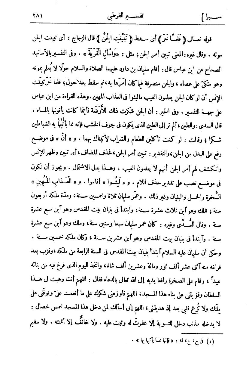 قَوْلُهُ تَعَالَى (فَلَمَّا خَرَّ) أَيْ سَقَطَ (تَبَيَّنَتِ الْجِنُّ) قَالَ الزَّجَّاجُ: أَيْ تَبَيَّنَتِ الْجِنُّ مَوْتَهُ. وَقَالَ غَيْرُهُ: الْمَعْنَى تَبَيَّنَ أَمْرُ الْجِنِّ، مِثْلُ:" وَسْئَلِ الْقَرْيَةَ" [يوسف: ٨٢]. وَفِي التَّفْسِيرِ- بِالْأَسَانِيدِ الصِّحَاحِ عَنِ ابْنِ عَبَّاسٍ قَالَ: أَقَامَ سُلَيْمَانُ بْنُ دَاوُدَ عَلَيْهِمَا الصَّلَاةُ وَالسَّلَامُ حَوْلًا لَا يُعْلَمُ بِمَوْتِهِ وَهُوَ مُتَّكِئٌ عَلَى عَصَاهُ، وَالْجِنُّ مُنْصَرِفَةٌ فِيمَا كَانَ أَمَرَهَا بِهِ، ثُمَّ سَقَطَ بَعْدَ حَوْلٍ، فَلَمَّا خَرَّ تَبَيَّنَتِ، الْإِنْسُ أَنْ لَوْ كَانَ الْجِنُّ يَعْلَمُونَ الْغَيْبَ مَا لَبِثُوا فِي الْعَذَابِ الْمُهِينِ. وَهَذِهِ الْقِرَاءَةُ مِنِ ابْن عَبَّاسٍ عَلَى جِهَةِ التَّفْسِيرِ. وَفِي الْخَبَرِ: أَنَّ الْجِنَّ شَكَرَتْ ذَلِكَ لِلْأَرَضَةِ فَأَيْنَمَا كَانَتْ، يَأْتُونَهَا بِالْمَاءِ. قَالَ السُّدِّيُّ: وَالطِّينُ، أَلَمْ تَرَ إِلَى الطِّينِ الَّذِي يَكُونُ فِي جَوْفِ الْخَشَبِ فَإِنَّهُ مِمَّا يَأْتِيهَا «١» بِهِ الشَّيَاطِينُ شُكْرًا، وَقَالَتْ: لَوْ كُنْتِ تَأْكُلِينَ الطَّعَامَ وَالشَّرَابَ لَأَتَيْنَاكِ بِهِمَا. وَ" أَنْ" فِي مَوْضِعِ رَفْعٍ عَلَى الْبَدَلِ مِنَ الْجِنِّ، وَالتَّقْدِيرُ: تَبَيَّنَ أَمْرُ الْجِنِّ، فَحُذِفَ الْمُضَافُ، أَيْ تَبَيَّنَ وَظَهَرَ لِلْإِنْسِ وَانْكَشَفَ لَهُمْ أَمْرُ الْجِنِّ أَنَّهُمْ لَا يَعْلَمُونَ الْغَيْبَ. وَهَذَا بَدَلُ الِاشْتِمَالِ. وَيَجُوزُ أَنْ تَكُونَ فِي مَوْضِعِ نَصْبٍ عَلَى تَقْدِيرِ حَذْفِ اللَّامِ. و (لَبِثُوا) أقاموا. و (الْعَذابِ الْمُهِينِ) السُّخْرَةِ وَالْحَمْلِ وَالْبُنْيَانِ وَغَيْرِ ذَلِكَ. وَعَمَّرَ سُلَيْمَانُ ثَلَاثًا وَخَمْسِينَ سَنَةً، وَمُدَّةُ مُلْكِهِ أَرْبَعُونَ سَنَةً، فَمَلَكَ وَهُوَ ابْنُ ثَلَاثَ عَشْرَةَ سَنَةً، وَابْتَدَأَ فِي بُنْيَانِ بَيْتِ الْمَقْدِسِ وَهُوَ ابْنُ سَبْعَ عَشْرَةَ سَنَةً. وَقَالَ السُّدِّيُّ وَغَيْرُهُ: كان عمر سليمان سبعا وستين ستة، وَمَلَكَ وَهُوَ ابْنُ سَبْعَ عَشْرَةَ سَنَةً. وَابْتَدَأَ فِي بُنْيَانِ بَيْتِ الْمَقْدِسِ وَهُوَ ابْنُ عِشْرِينَ سَنَةً، وَكَانَ مُلْكُهُ خَمْسِينَ سَنَةً. وَحُكِيَ أَنَّ سُلَيْمَانَ عَلَيْهِ السَّلَامُ ابْتَدَأَ بُنْيَانَ بَيْتِ الْمَقْدِسِ فِي السَّنَةِ الرَّابِعَةِ مِنْ مُلْكِهِ، وَقَرَّبَ بَعْدَ فَرَاغِهِ مِنْهُ اثْنَيْ عَشَرَ أَلْفَ ثَوْرٍ وَمِائَةً وَعِشْرِينَ أَلْفَ شَاةٍ، وَاتَّخَذَ الْيَوْمَ الَّذِي فَرَغَ فِيهِ مِنْ بِنَائِهِ عِيدًا، وَقَامَ عَلَى الصَّخْرَةِ رَافِعًا يَدَيْهِ إِلَى اللَّهِ تَعَالَى بِالدُّعَاءِ فَقَالَ: اللَّهُمَّ أَنْتَ وَهَبْتَ لِي هَذَا السُّلْطَانَ وَقَوَّيْتَنِي، عَلَى بِنَاءِ هَذَا الْمَسْجِدِ، اللَّهُمَّ فَأَوْزِعْنِي شُكْرَكَ عَلَى مَا أَنْعَمْتَ عَلَيَّ وَتَوَفَّنِي عَلَى مِلَّتِكَ وَلَا تُزِغْ قَلْبِي بَعْدَ إِذْ هَدَيْتَنِي، اللَّهُمَّ إِنِّي أَسْأَلُكَ لِمَنْ دَخَلَ هَذَا الْمَسْجِدَ خَمْسَ خِصَالٍ: لَا يَدْخُلُهُ مُذْنِبٌ دَخَلَ لِلتَّوْبَةِ إِلَّا غَفَرْتَ لَهُ وَتُبْتَ عَلَيْهِ. وَلَا خَائِفٌ إِلَّا أمنته. ولا سقيم