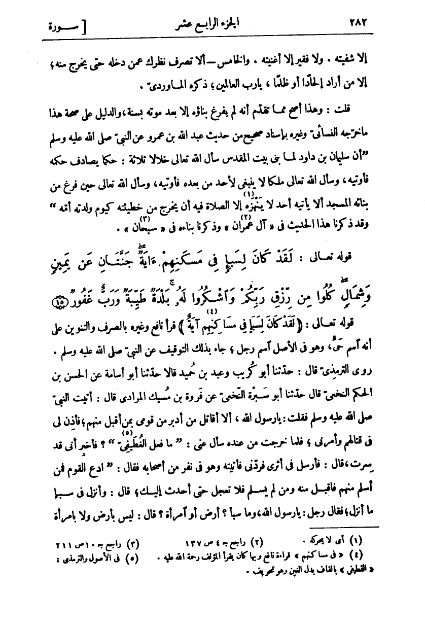 قَوْلُهُ تَعَالَى: (لَقَدْ كانَ لِسَبَإٍ فِي مَسْكَنِهِمْ «٤» آيَةٌ) قَرَأَ نَافِعٌ وَغَيْرُهُ بِالصَّرْفِ وَالتَّنْوِينِ عَلَى أَنَّهُ اسْمُ حَيٍّ، وَهُوَ فِي الْأَصْلِ اسْمُ رَجُلٍ، جَاءَ بِذَلِكَ التَّوْقِيفُ عَنِ النَّبِيِّ صَلَّى اللَّهُ عَلَيْهِ وَسَلَّمَ. رَوَى التِّرْمِذِيُّ قَالَ: حَدَّثَنَا أَبُو كُرَيْبٍ وَعَبْدُ بْنُ حُمَيْدٍ قَالَا حَدَّثَنَا أَبُو أُسَامَةَ عَنِ الْحَسَنِ بْنِ الْحَكَمِ النَّخَعِيُّ قَالَ حَدَّثَنَا أَبُو سَبْرَةَ النَّخَعِيُّ عَنْ فَرْوَةَ بْنِ مُسَيْكٍ الْمُرَادِيَّ قَالَ: أَتَيْتُ النَّبِيَّ صَلَّى اللَّهُ عَلَيْهِ وَسَلَّمَ فَقُلْتُ: يَا رَسُولَ اللَّهِ، أَلَا أُقَاتِلُ مَنْ أَدْبَرَ مِنْ قَوْمِي بِمَنْ أَقْبَلَ مِنْهُمْ، فَأَذِنَ لِي فِي قِتَالِهِمْ وَأَمَّرَنِي، فَلَمَّا خَرَجْتُ مِنْ عِنْدِهِ سَأَلَ عَنِّي: (مَا فَعَلَ الْغُطَيْفِيُّ) «٥»؟ فَأُخْبِرَ أَنِّي قَدْ سِرْتُ، قَالَ: فَأَرْسَلَ فِي أَثَرِي فَرَدَّنِي فَأَتَيْتُهُ وَهُوَ فِي نَفَرٍ مِنْ أَصْحَابِهِ فَقَالَ: (ادْعُ الْقَوْمَ فَمَنْ أَسْلَمَ مِنْهُمْ فَاقْبَلْ مِنْهُ وَمَنْ لَمْ يُسْلِمْ فَلَا تَعْجَلْ حَتَّى أُحْدِثَ إِلَيْكَ، قَالَ: وَأُنْزِلَ فِي سَبَأٍ مَا أُنْزِلَ، فَقَالَ رَجُلٌ: يَا رَسُولَ اللَّهِ، وَمَا سَبَأٌ؟ أَرْضٌ أَوِ امْرَأَةٌ؟ قَالَ: ليس بأرض ولا بامرأة