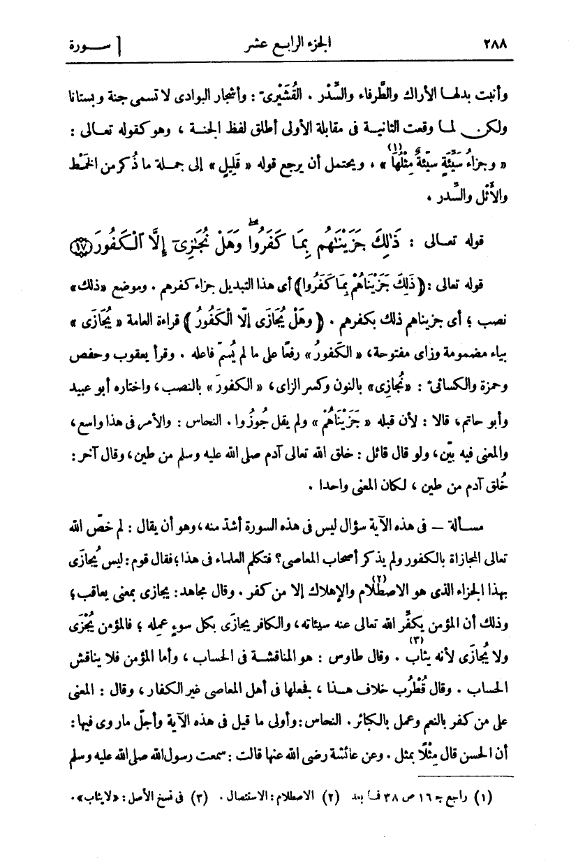 قَوْلُهُ تَعَالَى: (ذلِكَ جَزَيْناهُمْ بِما كَفَرُوا) أَيْ هَذَا التَّبْدِيلُ جَزَاءُ كُفْرِهِمْ. وَمَوْضِعُ" ذلِكَ" نصب، أي جزيناهم ذلك بكفرهم. (وهل يجازى إِلَّا الْكَفُورَ) قِرَاءَةُ الْعَامَّةِ" يُجَازَى" بِيَاءٍ مَضْمُومَةٍ وَزَايٍ مَفْتُوحَةٍ،" الْكَفُورُ" رَفْعًا عَلَى مَا لَمْ يُسَمَّ فَاعِلُهُ. وَقَرَأَ يَعْقُوبُ وَحَفْصٌ وَحَمْزَةُ وَالْكِسَائِيُّ:" نُجازِي" بِالنُّونِ وَكَسْرِ الزَّايِ،" الْكَفُورَ" بِالنَّصْبِ، وَاخْتَارَهُ أَبُو عُبَيْدٍ وَأَبُو حَاتِمٍ، قَالَا: لِأَنَّ قَبْلَهُ" جَزَيْناهُمْ" وَلَمْ يَقُلْ جُوزُوا. النَّحَّاسُ: وَالْأَمْرُ فِي هَذَا وَاسِعٌ، وَالْمَعْنَى فِيهِ بَيِّنٌ، وَلَوْ قَالَ قَائِلٌ: خَلَقَ اللَّهُ تَعَالَى آدَمَ صَلَّى اللَّهُ عَلَيْهِ وَسَلَّمَ مِنْ طِينٍ، وَقَالَ آخَرُ: خُلِقَ آدَمُ مِنْ طِينٍ، لَكَانَ الْمَعْنَى وَاحِدًا. مَسْأَلَةٌ- فِي هَذِهِ الْآيَةِ سُؤَالٌ لَيْسَ فِي هَذِهِ السُّورَةِ أَشَدُّ مِنْهُ، وَهُوَ أَنْ يُقَالَ: لِمَ خَصَّ اللَّهُ تَعَالَى الْمُجَازَاةَ بِالْكَفُورِ وَلَمْ يَذْكُرْ أَصْحَابَ الْمَعَاصِي؟ فَتَكَلَّمَ الْعُلَمَاءُ فِي هَذَا، فَقَالَ قَوْمٌ: لَيْسَ يُجَازَى بِهَذَا الْجَزَاءِ الَّذِي هُوَ الِاصْطِلَامُ «٢» وَالْإِهْلَاكُ إِلَّا مَنْ كَفَرَ. وَقَالَ مُجَاهِدٌ: يُجَازَى بِمَعْنَى يُعَاقَبُ، وَذَلِكَ أَنَّ الْمُؤْمِنَ يُكَفِّرُ اللَّهُ تَعَالَى عَنْهُ سَيِّئَاتَهُ، وَالْكَافِرُ يُجَازَى بِكُلِ سُوءِ عَمَلِهِ، فَالْمُؤْمِنُ يُجْزَى وَلَا يُجَازَى لِأَنَّهُ يُثَابُ «٣». وَقَالَ طَاوُسٌ: هُوَ الْمُنَاقَشَةُ فِي الْحِسَابِ، وَأَمَّا الْمُؤْمِنُ فَلَا يُنَاقَشُ الْحِسَابَ. وَقَالَ قُطْرُبٌ خلاف هذا، فجهلها فِي أَهْلِ الْمَعَاصِي غَيْرِ الْكُفَّارِ، وَقَالَ: الْمَعْنَى عَلَى مَنْ كَفَرَ بِالنِّعَمِ وَعَمِلَ بِالْكَبَائِرِ. النَّحَّاسُ: وَأَوْلَى مَا قِيلَ فِي هَذِهِ الْآيَةِ وَأَجَلُّ مَا رُوِيَ فِيهَا: أَنَّ الْحَسَنَ قَالَ مِثْلًا بِمِثْلٍ. وَعَنْ عَائِشَةَ رَضِيَ اللَّهُ عَنْهَا قَالَتْ: سَمِعْتُ رَسُولَ اللَّهِ صَلَّى اللَّهُ عَلَيْهِ وَسَلَّمَ