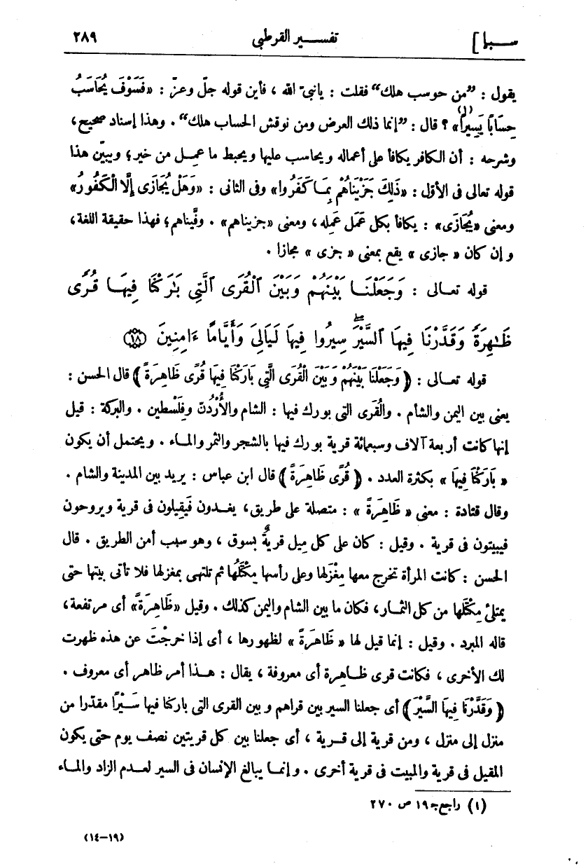 قَوْلُهُ تَعَالَى: (وَجَعَلْنا بَيْنَهُمْ وَبَيْنَ الْقُرَى الَّتِي بارَكْنا فِيها قُرىً ظاهِرَةً) قَالَ الْحَسَنُ: يَعْنِي بَيْنَ الْيَمَنِ وَالشَّامِ. وَالْقُرَى الَّتِي بُورِكَ فِيهَا: الشَّامُ وَالْأُرْدُنُ وَفِلَسْطِينُ. وَالْبَرَكَةُ: قِيلَ إِنَّهَا كَانَتْ أَرْبَعَةَ آلَافٍ وَسَبْعَمِائَةِ قَرْيَةٍ بُورِكَ فِيهَا بِالشَّجَرِ وَالثَّمَرِ وَالْمَاءِ. وَيَحْتَمِلُ أَنْ يَكُونَ" بارَكْنا فِيها" بِكَثْرَةِ الْعَدَدِ. (قُرىً ظاهِرَةً) قَالَ ابْنُ عَبَّاسٍ: يُرِيدُ بَيْنَ الْمَدِينَةِ وَالشَّامِ. وَقَالَ قَتَادَةُ: مَعْنَى" ظاهِرَةً": مُتَّصِلَةٌ عَلَى طَرِيقٍ، يَغْدُونَ فَيَقِيلُونَ فِي قَرْيَةٍ وَيَرُوحُونَ فَيَبِيتُونَ فِي قَرْيَةٍ. وَقِيلَ: كَانَ عَلَى كُلِّ مِيلٍ قَرْيَةٌ بِسُوقٍ، وَهُوَ سَبَبُ أَمْنِ الطَّرِيقِ. قَالَ الْحَسَنُ: كَانَتِ الْمَرْأَةُ تَخْرُجُ مَعَهَا مِغْزَلُهَا وَعَلَى رَأْسِهَا مِكْتَلُهَا ثُمَّ تَلْتَهِي بِمِغْزَلِهَا فَلَا تَأْتِي بَيْتَهَا حَتَّى يَمْتَلِئَ مِكْتَلُهَا مِنْ كُلِّ الثِّمَارِ، فَكَانَ مَا بَيْنَ الشَّامِ وَالْيَمَنِ كَذَلِكَ. وَقِيلَ" ظاهِرَةً" أَيْ مُرْتَفِعَةً، قَالَهُ الْمُبَرِّدُ. وَقِيلَ: إِنَّمَا قِيلَ لَهَا" ظاهِرَةً" لِظُهُورِهَا، أَيْ إِذَا خَرَجَتْ عَنْ هَذِهِ ظَهَرَتْ لَكَ الْأُخْرَى، فَكَانَتْ قُرًى ظَاهِرَةً أَيْ مَعْرُوفَةً، يُقَالُ: هَذَا أَمْرٌ ظَاهِرٌ أَيْ مَعْرُوفٌ. (وَقَدَّرْنا فِيهَا السَّيْرَ) أَيْ جَعَلْنَا السَّيْرَ بَيْنَ قُرَاهُمْ وَبَيْنَ الْقُرَى الَّتِي بَارَكْنَا فِيهَا سَيْرًا مُقَدَّرًا مِنْ مَنْزِلٍ إِلَى مَنْزِلٍ، وَمِنْ قَرْيَةٍ إِلَى قَرْيَةٍ، أَيْ جَعَلْنَا بَيْنَ كُلِّ قَرْيَتَيْنِ نِصْفَ يَوْمٍ حَتَّى يَكُونَ الْمَقِيلُ فِي قَرْيَةٍ وَالْمَبِيتُ فِي قَرْيَةٍ أُخْرَى. وَإِنَّمَا يُبَالِغُ الإنسان في السير لعدم الزاد والماء