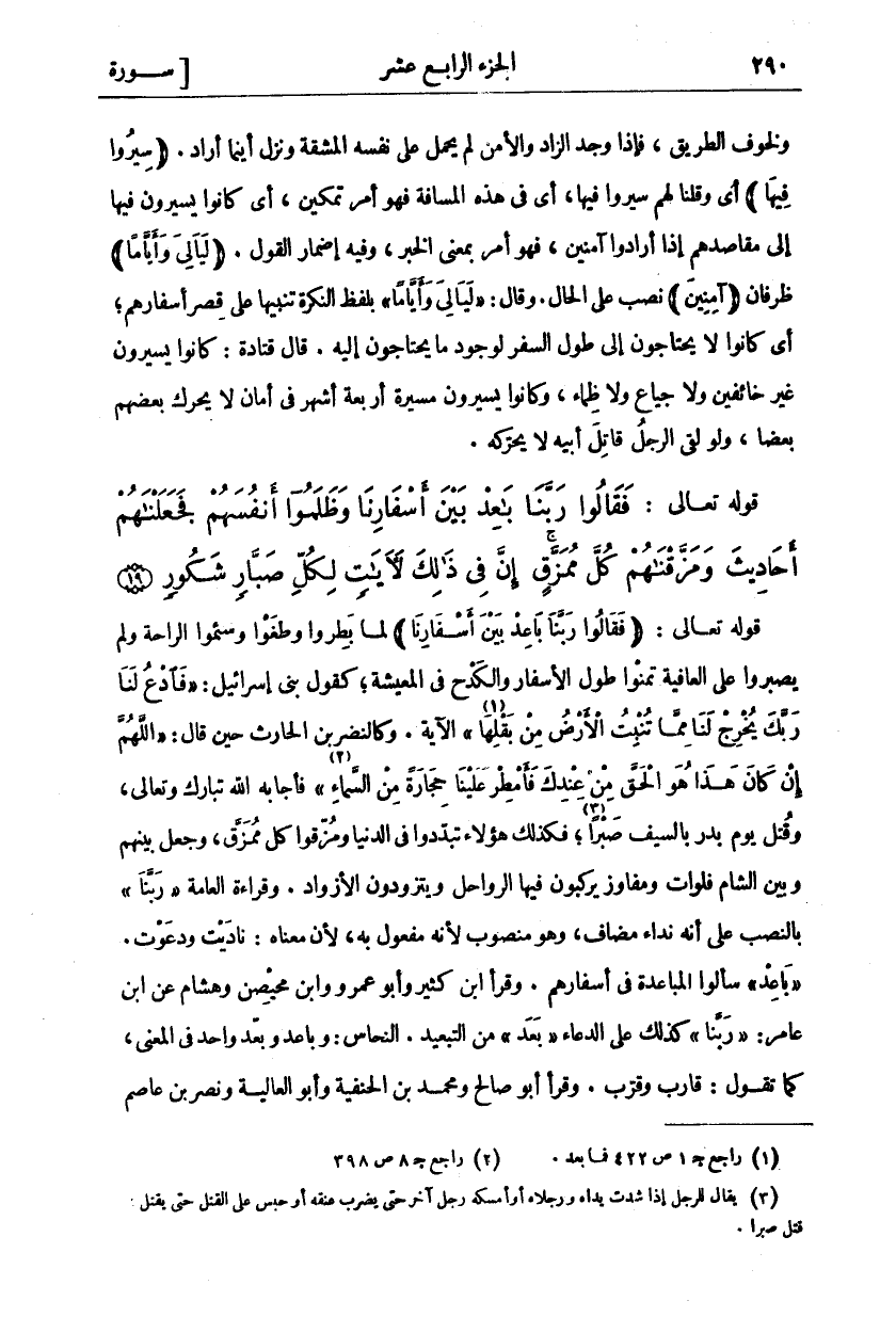 قوله تعالى: (فَقالُوا رَبَّنا باعِدْ بَيْنَ أَسْفارِنا) لَمَّا بَطِرُوا وَطَغَوْا وَسَئِمُوا الرَّاحَةَ وَلَمْ يَصْبِرُوا عَلَى الْعَافِيَةِ تَمَنَّوْا طُولَ الْأَسْفَارِ وَالْكَدْحَ فِي الْمَعِيشَةِ، كَقَوْلِ بَنِي إِسْرَائِيلَ:" فَادْعُ لَنا رَبَّكَ يُخْرِجْ لَنا مِمَّا تُنْبِتُ الْأَرْضُ مِنْ بَقْلِها" «١» [البقرة: ٦١] الْآيَةَ. وَكَالنَّضْرِ بْنِ الْحَارِثِ حِينَ قَالَ:" اللَّهُمَّ إِنْ كانَ هَذَا هُوَ الْحَقَّ مِنْ عِنْدِكَ فَأَمْطِرْ عَلَيْنا حِجارَةً مِنَ السَّماءِ" «٢» [الأنفال: ٣٢] فَأَجَابَهُ اللَّهُ تَبَارَكَ وَتَعَالَى، وَقُتِلَ يَوْمَ بَدْرٍ بِالسَّيْفِ صَبْرًا «٣»، فَكَذَلِكَ هَؤُلَاءِ تَبَدَّدُوا فِي الدُّنْيَا وَمُزِّقُوا كُلَّ مُمَزَّقٍ، وَجُعِلَ بَيْنَهُمْ وَبَيْنَ الشَّامِ فَلَوَاتٌ وَمَفَاوِزُ يَرْكَبُونَ فِيهَا الرَّوَاحِلَ وَيَتَزَوَّدُونَ الْأَزْوَادَ. وَقِرَاءَةُ الْعَامَّةِ" رَبَّنا" بِالنَّصْبِ عَلَى أَنَّهُ نِدَاءٌ مُضَافٌ، وَهُوَ مَنْصُوبٌ لِأَنَّهُ مَفْعُولٌ بِهِ، لِأَنَّ مَعْنَاهُ: نَادَيْتُ وَدَعَوْتُ." باعِدْ" سَأَلُوا الْمُبَاعَدَةَ فِي أَسْفَارِهِمْ. وَقَرَأَ ابْنُ كَثِيرٍ وَأَبُو عَمْرٍو وَابْنُ مُحَيْصِنٍ وَهِشَامٌ عَنِ ابْنِ عَامِرٍ:" رَبَّنا" كَذَلِكَ عَلَى الدُّعَاءِ" بَعِّدْ" مِنَ التَّبْعِيدِ. النَّحَّاسُ: وَبَاعِدْ وَبَعِّدْ وَاحِدٌ فِي الْمَعْنَى، كَمَا تَقُولُ: قَارِبْ وقرب. وقرا أبو صالح ومحمد بن الحنفية وأبو العالية ونصر بن عاصم