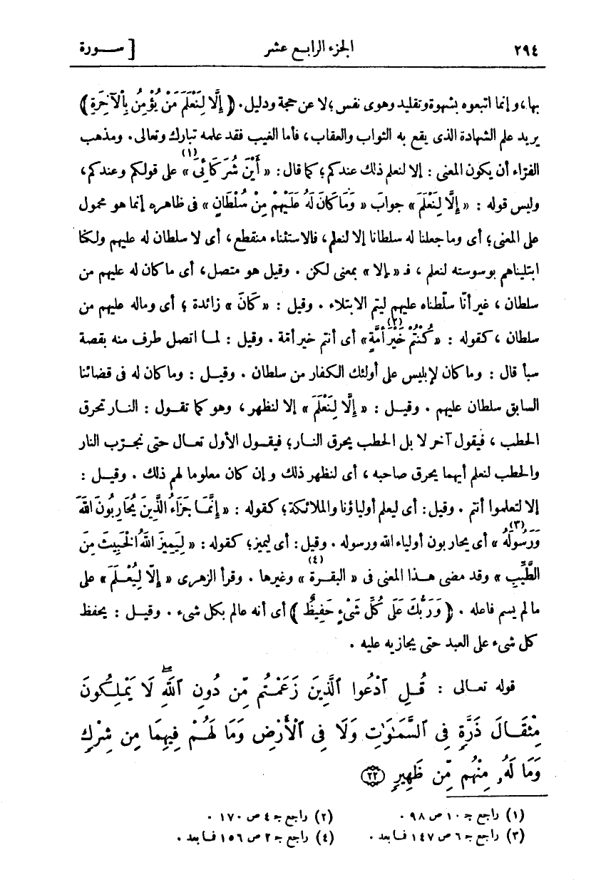 قُلِ ادْعُوا الَّذِينَ زَعَمْتُمْ مِنْ دُونِ اللَّهِ لَا يَمْلِكُونَ مِثْقالَ ذَرَّةٍ فِي السَّماواتِ وَلا فِي الْأَرْضِ وَما لَهُمْ فِيهِما مِنْ شِرْكٍ وَما لَهُ مِنْهُمْ مِنْ ظَهِيرٍ (٢٢)