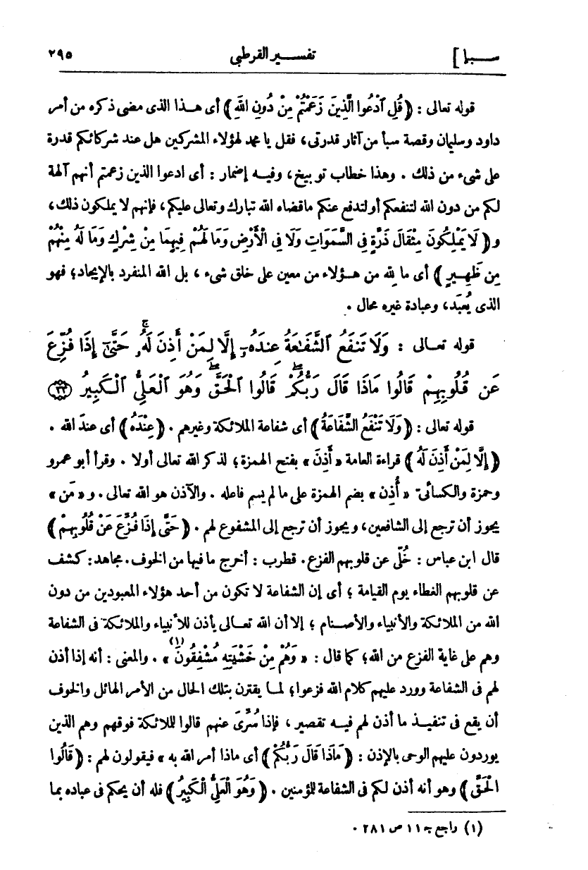 قَوْلُهُ تَعَالَى: (وَلا تَنْفَعُ الشَّفاعَةُ) أَيْ شَفَاعَةُ الْمَلَائِكَةِ وَغَيْرِهِمْ. (عِنْدَهُ) أَيْ عِنْدَ اللَّهِ. (إِلَّا لِمَنْ أَذِنَ لَهُ) قِرَاءَةُ الْعَامَّةِ" أَذِنَ" بِفَتْحِ الْهَمْزَةِ، لِذِكْرِ اللَّهِ تَعَالَى أَوَّلًا. وَقَرَأَ أَبُو عَمْرٍو وَحَمْزَةُ وَالْكِسَائِيُّ" أُذِنَ" بِضَمِّ الْهَمْزَةِ عَلَى مَا لَمْ يُسَمَّ فَاعِلُهُ. وَالْآذِنُ هُوَ اللَّهُ تَعَالَى. وَ" مَنْ يَجُوزُ أَنْ تَرْجِعَ إِلَى الشَّافِعِينَ، وَيَجُوزَ أَنْ تَرْجِعَ إِلَى الْمَشْفُوعِ لَهُمْ. (حَتَّى إِذا فُزِّعَ عَنْ قُلُوبِهِمْ) قَالَ ابْنُ عَبَّاسٍ: خُلِّيَ عَنْ قُلُوبِهِمُ الْفَزَعُ. قُطْرُبٌ: أُخْرِجَ مَا فِيهَا مِنَ الْخَوْفِ. مُجَاهِدٌ: كُشِفَ عَنْ قُلُوبِهِمُ الْغِطَاءُ يَوْمَ الْقِيَامَةِ، أَيْ أَنَّ الشَّفَاعَةَ لَا تَكُونُ مِنْ أَحَدِ هَؤُلَاءِ الْمَعْبُودِينَ مِنْ دُونِ اللَّهِ مِنَ الْمَلَائِكَةِ وَالْأَنْبِيَاءِ وَالْأَصْنَامِ، إِلَّا أَنَّ اللَّهَ تَعَالَى يَأْذَنُ لِلْأَنْبِيَاءِ وَالْمَلَائِكَةِ فِي الشَّفَاعَةِ وَهُمْ عَلَى غَايَةِ الْفَزَعِ مِنَ اللَّهِ، كَمَا قَالَ:" وَهُمْ مِنْ خَشْيَتِهِ مُشْفِقُونَ" «١» [الأنبياء: ٢٨] وَالْمَعْنَى: أَنَّهُ إِذَا أُذِنَ لَهُمْ فِي الشَّفَاعَةِ وَوَرَدَ عَلَيْهِمْ كَلَامُ اللَّهِ فَزِعُوا، لِمَا يَقْتَرِنُ بِتِلْكَ الْحَالِ مِنَ الْأَمْرِ الْهَائِلِ وَالْخَوْفِ أَنْ يَقَعَ فِي تَنْفِيذِ مَا أُذِنَ لَهُمْ فِيهِ تَقْصِيرٌ، فَإِذَا سُرِّيَ عَنْهُمْ قَالُوا لِلْمَلَائِكَةِ فَوْقَهُمْ وَهُمُ الَّذِينَ يُورِدُونَ عَلَيْهِمُ الْوَحْيَ بِالْإِذْنِ: (مَاذَا قالَ رَبُّكُمْ) أَيْ مَاذَا أَمَرَ اللَّهُ بِهِ، فيقولون لهم: (قالُوا الْحَقَّ) هو أَنَّهُ أَذِنَ لَكُمْ فِي الشَّفَاعَةِ لِلْمُؤْمِنِينَ. (وَهُوَ الْعَلِيُّ الْكَبِيرُ) فَلَهُ أَنْ يَحْكُمَ فِي عِبَادِهِ بما