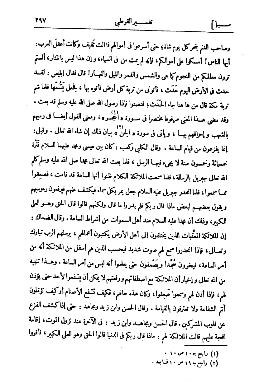وَصَاحِبُ الْغَنَمِ يَنْحَرُ كُلَّ يَوْمٍ شَاةً، حَتَّى أَسْرَعُوا فِي أَمْوَالِهِمْ فَقَالَتْ ثَقِيفُ وَكَانَتْ أَعْقَلَ الْعَرَبِ: أَيُّهَا النَّاسُ! أَمْسِكُوا عَلَى أَمْوَالِكُمْ، فَإِنَّهُ لَمْ يَمُتْ مَنْ فِي السَّمَاءِ، وَإِنَّ هَذَا لَيْسَ بِانْتِثَارٍ، أَلَسْتُمْ تَرَوْنَ مَعَالِمَكُمْ مِنَ النُّجُومِ كَمَا هِيَ وَالشَّمْسَ وَالْقَمَرَ وَاللَّيْلَ وَالنَّهَارَ! قَالَ فَقَالَ إِبْلِيسُ: لَقَدْ حَدَثَ فِي الْأَرْضِ الْيَوْمَ حَدَثٌ، فَأْتُونِي مِنْ تُرْبَةِ كُلِّ أَرْضٍ فَأَتَوْهُ بِهَا، فَجَعَلَ يَشُمُّهَا فَلَمَّا شَمَّ تُرْبَةَ مَكَّةَ قَالَ مِنْ هَاهُنَا جَاءَ الْحَدَثُ، فَنَصَتُوا فَإِذَا رَسُولُ اللَّهِ صَلَّى اللَّهُ عَلَيْهِ وَسَلَّمَ قَدْ بُعِثَ. وَقَدْ مَضَى هَذَا الْمَعْنَى مَرْفُوعًا مُخْتَصَرًا فِي سُورَةِ" الْحِجْرِ" «١»، وَمَعْنَى الْقَوْلِ أَيْضًا فِي رَمْيِهِمْ بِالشُّهُبِ وَإِحْرَاقِهِمْ بِهَا، وَيَأْتِي فِي سُورَةِ" الْجِنِّ" «٢» بَيَانُ ذَلِكَ إِنْ شَاءَ اللَّهُ تَعَالَى. وَقِيلَ: إِنَّمَا يُفَزَّعُونَ مِنْ قِيَامِ السَّاعَةِ. وَقَالَ الْكَلْبِيُّ وَكَعْبُ: كَانَ بَيْنَ عِيسَى وَمُحَمَّدٍ عَلَيْهِمَا السلام فترة خمسمائة وخمسون سنة لا يجئ فِيهَا الرُّسُلُ، فَلَمَّا بَعَثَ اللَّهُ تَعَالَى مُحَمَّدًا صَلَّى اللَّهُ عَلَيْهِ وَسَلَّمَ كَلَّمَ اللَّهُ تَعَالَى جِبْرِيلَ بِالرِّسَالَةِ، فَلَمَّا سَمِعَتِ الْمَلَائِكَةُ الْكَلَامَ ظَنُّوا أَنَّهَا السَّاعَةُ قَدْ قَامَتْ، فَصَعِقُوا مِمَّا سَمِعُوا، فَلَمَّا انْحَدَرَ جِبْرِيلُ عَلَيْهِ السَّلَامُ جَعَلَ يَمُرُّ بكل سماء فيكشف عنهم فيرفعون رؤوسهم وَيَقُولُ بَعْضُهُمْ لِبَعْضٍ مَاذَا قَالَ رَبُّكُمْ فَلَمْ يَدْرُوا مَا قَالَ وَلَكِنَّهُمْ قَالُوا قَالَ الْحَقَّ وَهُوَ الْعَلِيُّ الْكَبِيرُ، وَذَلِكَ أَنَّ مُحَمَّدًا عَلَيْهِ السَّلَامُ عِنْدَ أَهْلِ السَّمَاوَاتِ مِنْ أَشْرَاطِ السَّاعَةِ. وَقَالَ الضَّحَّاكُ: إِنَّ الْمَلَائِكَةَ الْمُعَقِّبَاتِ الَّذِينَ يَخْتَلِفُونَ إِلَى أَهْلِ الْأَرْضِ يَكْتُبُونَ أَعْمَالَهُمْ، يُرْسِلُهُمُ الرَّبُّ تَبَارَكَ وَتَعَالَى، فَإِذَا انْحَدَرُوا سُمِعَ لَهُمْ صَوْتٌ شَدِيدٌ فَيَحْسَبُ الَّذِينَ هُمْ أَسْفَلَ مِنَ الْمَلَائِكَةِ أَنَّهُ مِنْ أَمْرِ السَّاعَةِ، فَيَخِرُّونَ سُجَّدًا وَيَصْعَقُونَ حَتَّى يَعْلَمُوا أَنَّهُ لَيْسَ مِنْ أَمْرِ السَّاعَةِ. وَهَذَا تَنْبِيهٌ مِنَ اللَّهِ تَعَالَى وَإِخْبَارٌ أَنَّ الْمَلَائِكَةَ مَعَ اصْطِفَائِهِمْ وَرِفْعَتِهِمْ لَا يُمْكِنُ أَنْ يَشْفَعُوا لِأَحَدٍ حَتَّى يُؤْذَنَ لَهُمْ، فَإِذَا أُذِنَ لَهُمْ وَسَمِعُوا صَعِقُوا، وَكَانَ هَذِهِ حَالَهُمْ، فَكَيْفَ تَشْفَعُ الْأَصْنَامُ أَوْ كَيْفَ تُؤَمِّلُونَ أَنْتُمُ الشَّفَاعَةَ وَلَا تَعْتَرِفُونَ بِالْقِيَامَةِ. وَقَالَ الْحَسَنُ وَابْنُ زَيْدٍ وَمُجَاهِدٌ: حَتَّى إِذَا كُشِفَ الْفَزَعُ عَنْ قُلُوبِ الْمُشْرِكِينَ. قَالَ الْحَسَنُ وَمُجَاهِدٌ وَابْنُ زَيْدٍ: فِي الْآخِرَةِ عِنْدَ نُزُولِ الْمَوْتِ، إِقَامَةً لِلْحُجَّةِ عَلَيْهِمْ قَالَتِ الْمَلَائِكَةُ لَهُمْ: مَاذَا قَالَ رَبُّكُمْ فِي الدُّنْيَا قَالُوا الْحَقَّ وَهُوَ الْعَلِيُّ الْكَبِيرُ، فَأَقَرُّوا