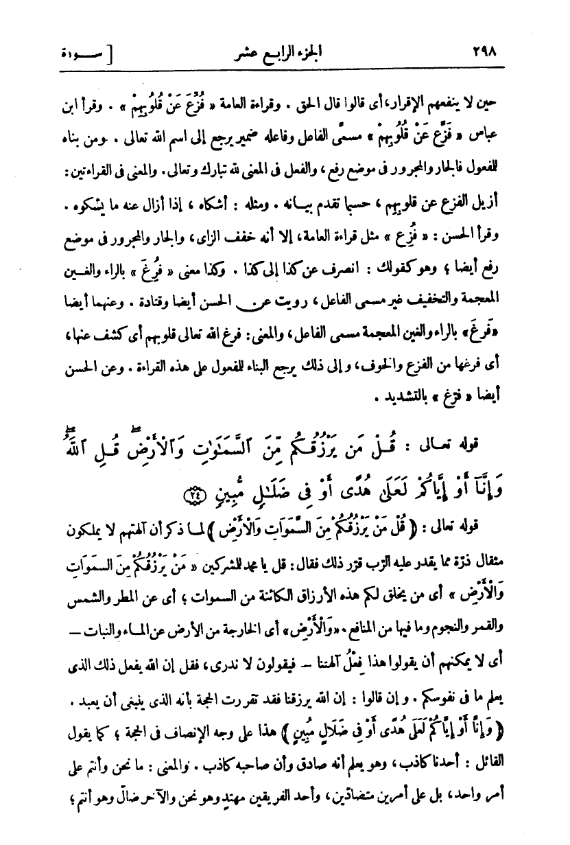 حِينَ لَا يَنْفَعُهُمُ الْإِقْرَارُ، أَيْ قَالُوا قَالَ الْحَقَّ. وَقِرَاءَةُ الْعَامَّةِ" فُزِّعَ عَنْ قُلُوبِهِمْ". وَقَرَأَ ابْنُ عَبَّاسٍ" فُزِّعَ عَنْ قُلُوبِهِمْ" مُسَمَّى الْفَاعِلِ وَفَاعِلُهُ ضَمِيرٌ يَرْجِعُ إِلَى اسْمِ اللَّهِ تَعَالَى. وَمَنْ بَنَاهُ لِلْمَفْعُولِ فَالْجَارُّ وَالْمَجْرُورُ فِي مَوْضِعِ رَفْعٍ، وَالْفِعْلُ فِي الْمَعْنَى لِلَّهِ تَبَارَكَ وَتَعَالَى، وَالْمَعْنَى فِي الْقِرَاءَتَيْنِ: أُزِيلَ الْفَزَعُ عَنْ قُلُوبِهِمْ، حَسْبَمَا تَقَدَّمَ بَيَانُهُ. وَمِثْلُهُ: أَشْكَاهُ، إِذَا أَزَالَ عَنْهُ مَا يَشْكُوهُ. وَقَرَأَ الْحَسَنُ:" فُزِعَ" مِثْلَ قِرَاءَةِ الْعَامَّةِ، إِلَّا أَنَّهُ خَفَّفَ الزَّايَ، وَالْجَارُّ وَالْمَجْرُورُ فِي مَوْضِعِ رَفْعٍ أَيْضًا، وَهُوَ كَقَوْلِكَ: انْصَرَفَ عَنْ كَذَا إِلَى كَذَا. وَكَذَا مَعْنَى" فُرِغَ" بِالرَّاءِ وَالْغَيْنِ الْمُعْجَمَةِ وَالتَّخْفِيفِ، غَيْرَ مُسَمَّى الْفَاعِلِ، رُوِيَتْ عَنِ الْحَسَنِ أَيْضًا وَقَتَادَةَ. وَعَنْهُمَا أَيْضًا" فَرَغَ" بِالرَّاءِ وَالْغَيْنِ الْمُعْجَمَةِ مُسَمَّى الْفَاعِلِ، وَالْمَعْنَى: فَرَغَ اللَّهُ تَعَالَى قُلُوبَهُمْ أَيْ كَشَفَ عَنْهَا، أَيْ فَرَغَهَا مِنَ الْفَزَعِ وَالْخَوْفِ، وَإِلَى ذَلِكَ يَرْجِعُ الْبِنَاءُ لِلْمَفْعُولِ عَلَى هَذِهِ الْقِرَاءَةِ. وعن الحسن أيضا" فرغ" بالتشديد.