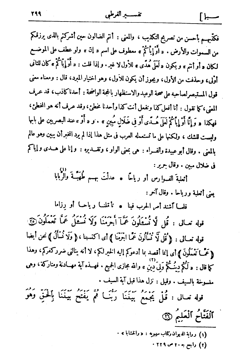 فَكَذَّبَهُمْ بِأَحْسَنَ مِنْ تَصْرِيحِ التَّكْذِيبِ، وَالْمَعْنَى: أَنْتُمُ الضَّالُّونَ حِينَ أَشْرَكْتُمْ بِالَّذِي يَرْزُقُكُمْ مِنَ السَّمَاوَاتِ وَالْأَرْضِ." أَوْ إِيَّاكُمْ" مَعْطُوفٌ عَلَى اسْمِ" إِنَّ" وَلَوْ عُطِفَ عَلَى الْمَوْضِعِ لَكَانَ" أَوْ أَنْتُمْ" وَيَكُونُ" لَعَلى هُدىً" لِلْأَوَّلِ لَا غَيْرَ. وَإِذَا قُلْتَ:" أَوْ إِيَّاكُمْ" كَانَ لِلثَّانِي أَوْلَى، وَحُذِفَتْ مِنَ الْأَوَّلِ، وَيَجُوزُ أَنْ يَكُونَ لِلْأَوَّلِ، وَهُوَ اخْتِيَارُ الْمُبَرِّدِ، قَالَ: وَمَعْنَاهُ مَعْنَى قَوْلِ الْمُسْتَبْصِرِ لِصَاحِبِهِ عَلَى صِحَّةِ الْوَعِيدِ وَالِاسْتِظْهَارِ بِالْحُجَّةِ الْوَاضِحَةِ: أَحَدُنَا كَاذِبٌ، قَدْ عُرِفَ الْمَعْنَى، كَمَا تَقُولُ: أَنَا أَفْعَلُ كَذَا وَتَفْعَلُ أَنْتَ كَذَا وَأَحَدُنَا مُخْطِئٌ، وَقَدْ عَرَفَ أَنَّهُ هُوَ الْمُخْطِئُ، فَهَكَذَا" وَإِنَّا أَوْ إِيَّاكُمْ لَعَلى هُدىً أَوْ فِي ضَلالٍ مُبِينٍ". وَ" أَوْ" عِنْدَ الْبَصْرِيِّينَ عَلَى بابها وليست للشك، ولكنها على ما تستعمله الْعَرَبُ فِي مِثْلِ هَذَا إِذَا لَمْ يُرِدِ الْمُخْبِرُ أَنْ يُبَيِّنَ وَهُوَ عَالِمٌ بِالْمَعْنَى. وَقَالَ أَبُو عُبَيْدَةَ وَالْفَرَّاءُ: هِيَ بِمَعْنَى الْوَاوِ، وَتَقْدِيرُهُ: وَإِنَّا عَلَى هُدًى وَإِيَّاكُمْ لَفِي ضَلَالٍ مُبِينٍ. وَقَالَ جَرِيرٌ: