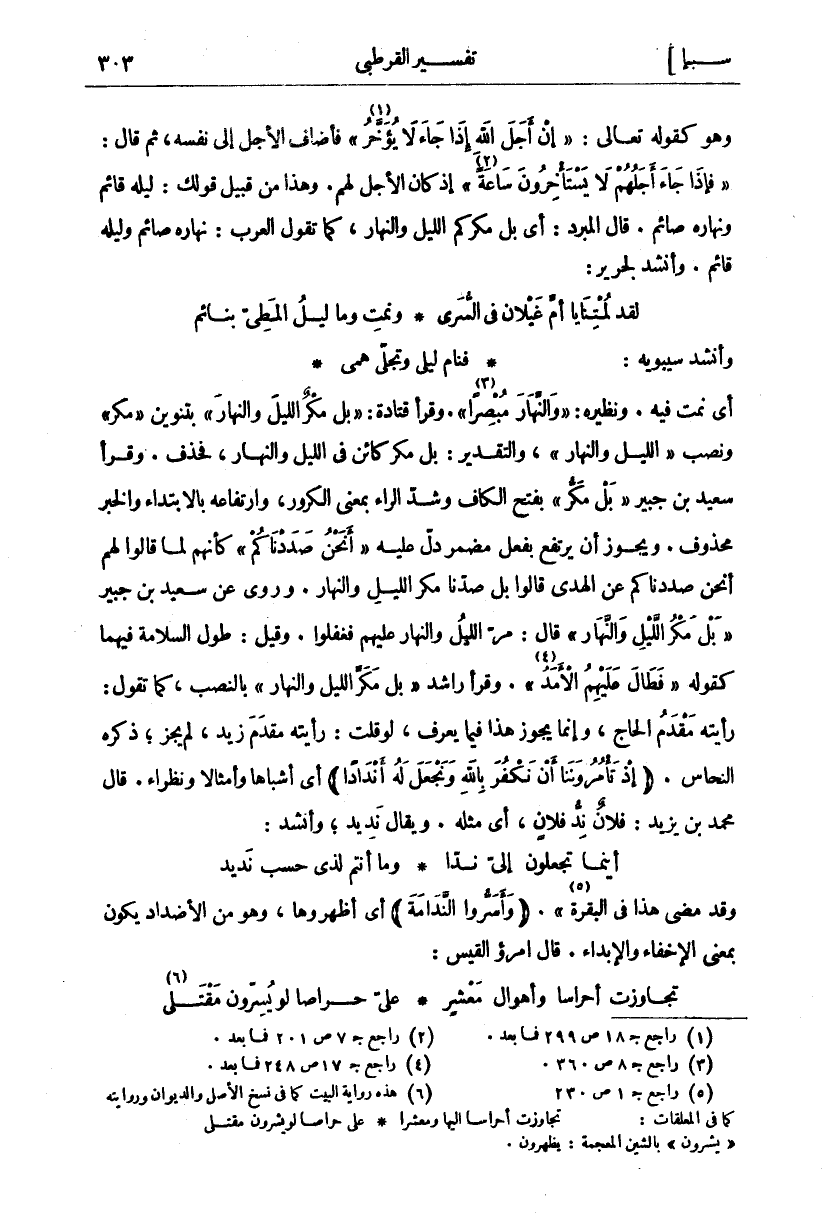 أَيْ نِمْتُ فِيهِ. ونظيره:" وَالنَّهارَ مُبْصِراً" «٣» [يونس: ٦٧]. وَقَرَأَ قَتَادَةُ:" بَلْ مَكْرٌ اللَّيْلَ وَالنَّهَارَ" بِتَنْوِينٍ" مَكْرٌ" وَنَصْبِ" اللَّيْلَ وَالنَّهَارَ"، وَالتَّقْدِيرُ: بَلْ مَكْرٌ كَائِنٌ فِي اللَّيْلِ وَالنَّهَارِ، فَحُذِفَ. وَقَرَأَ سَعِيدُ بْنُ جُبَيْرٍ" بَلْ مَكَرُّ" بِفَتْحِ الْكَافِ وَشَدِّ الرَّاءِ بِمَعْنَى الْكُرُورِ، وَارْتِفَاعُهُ بِالِابْتِدَاءِ وَالْخَبَرُ مَحْذُوفٌ. وَيَجُوزُ أَنْ يَرْتَفِعَ بِفِعْلٍ مُضْمَرٍ دَلَّ عَلَيْهِ" أَنَحْنُ صَدَدْناكُمْ" كَأَنَّهُمْ لَمَّا قَالُوا لَهُمْ أَنَحْنُ صَدَدْنَاكُمْ عَنِ الْهُدَى قَالُوا بَلْ صَدَّنَا مَكْرُ اللَّيْلِ وَالنَّهَارِ. وَرُوِيَ عَنْ سَعِيدِ بْنِ جُبَيْرٍ" بَلْ مَكْرُ اللَّيْلِ وَالنَّهارِ" قَالَ: مَرَّ اللَّيْلُ وَالنَّهَارُ عَلَيْهِمْ فَغَفَلُوا. وَقِيلَ: طُولُ السَّلَامَةِ فِيهِمَا كقوله" فَطالَ عَلَيْهِمُ الْأَمَدُ" «٤» [الحديد: ١٦]. وَقَرَأَ رَاشِدٌ" بَلْ مَكْرُ اللَّيْلِ وَالنَّهارِ" بِالنَّصْبِ، كَمَا تَقُولُ: رَأَيْتُهُ مَقْدَمَ الْحَاجِّ، وَإِنَّمَا يَجُوزُ هَذَا فِيمَا يُعَرَّفُ، لَوْ قُلْتَ: رَأَيْتُهُ مَقْدَمَ زَيْدٍ، لَمْ يَجُزْ، ذَكَرَهُ النَّحَّاسُ. (إِذْ تَأْمُرُونَنا أَنْ نَكْفُرَ بِاللَّهِ وَنَجْعَلَ لَهُ أَنْداداً) أَيْ أَشْبَاهًا وَأَمْثَالًا وَنُظَرَاءَ. قَالَ مُحَمَّدُ بْنُ يَزِيدَ: فُلَانٌ نِدُّ فُلَانٍ، أَيْ مِثْلُهُ. وَيُقَالُ نَدِيدٌ، وَأَنْشَدَ: