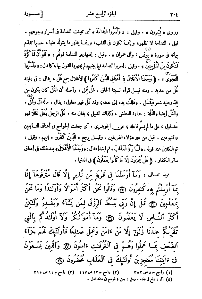 وروي" يشرون". وقيل: (وَأَسَرُّوا النَّدامَةَ) أَيْ تَبَيَّنَتِ النَّدَامَةُ فِي أَسْرَارِ وُجُوهِهِمْ. قِيلَ: النَّدَامَةُ لَا تَظْهَرُ، وَإِنَّمَا تَكُونُ فِي الْقَلْبِ، وَإِنَّمَا يَظْهَرُ مَا يَتَوَلَّدُ عَنْهَا، حَسْبَمَا تَقَدَّمَ بَيَانُهُ فِي سُورَةِ" يُونُسَ «١»، وَآلِ عِمْرَانَ". وَقِيلَ: إِظْهَارُهُمُ النَّدَامَةَ قَوْلُهُمْ:" فَلَوْ أَنَّ لَنا كَرَّةً فَنَكُونَ مِنَ الْمُؤْمِنِينَ" «٢» [الشعراء: ١٠٢]. وَقِيلَ: أَسَرُّوا النَّدَامَةَ فِيمَا بَيْنَهُمْ وَلَمْ يَجْهَرُوا القول بها، كما قال:" وَأَسَرُّوا النَّجْوَى" «٣» [الأنبياء: ٣]. (وَجَعَلْنَا الْأَغْلالَ فِي أَعْناقِ الَّذِينَ كَفَرُوا) الْأَغْلَالُ جَمْعُ غُلٍّ، يُقَالُ: فِي رَقَبَتِهِ غُلٌّ مِنْ حَدِيدٍ. وَمِنْهُ قِيلَ لِلْمَرْأَةِ السَّيِّئَةِ الْخُلُقَ: غُلٌّ قَمِلٌ، وَأَصْلُهُ أَنَّ الْغُلَّ كَانَ يَكُونُ مِنْ قِدٍّ وَعَلَيْهِ شَعْرٌ فَيَقْمَلُ. وَغَلَلْتُ يَدَهُ إِلَى عنقه، وقد غل فهو مغلول، يقال: ماله أُلَّ وَغُلَّ «٤». وَالْغُلُّ أَيْضًا وَالْغُلَّةُ: حَرَارَةُ الْعَطَشِ، وَكَذَلِكَ الْغَلِيلُ، يُقَالُ مِنْهُ: غُلَّ الرَّجُلُ يُغَلُّ غَلَلًا فَهُوَ مَغْلُولٌ، عَلَى مَا لَمْ يُسَمَّ فَاعِلُهُ، عَنِ الْجَوْهَرِيِّ. أَيْ جَعَلْتُ الْجَوَامِعَ فِي أَعْنَاقِ التَّابِعِينَ وَالْمَتْبُوعِينَ. قِيلَ مِنْ غَيْرِ هَؤُلَاءِ الْفَرِيقَيْنِ. وَقِيلَ يَرْجِعُ" الَّذِينَ كَفَرُوا" إِلَيْهِمْ. وَقِيلَ: تم الكلال عِنْدَ قَوْلِهِ:" لَمَّا رَأَوُا الْعَذابَ" ثُمَّ ابْتَدَأَ فَقَالَ:" وَجَعَلْنَا الْأَغْلالَ" بَعْدَ ذَلِكَ فِي أَعْنَاقِ سَائِرِ الْكُفَّارِ. (هَلْ يُجْزَوْنَ إِلَّا مَا كانُوا يَعْمَلُونَ) في الدنيا.