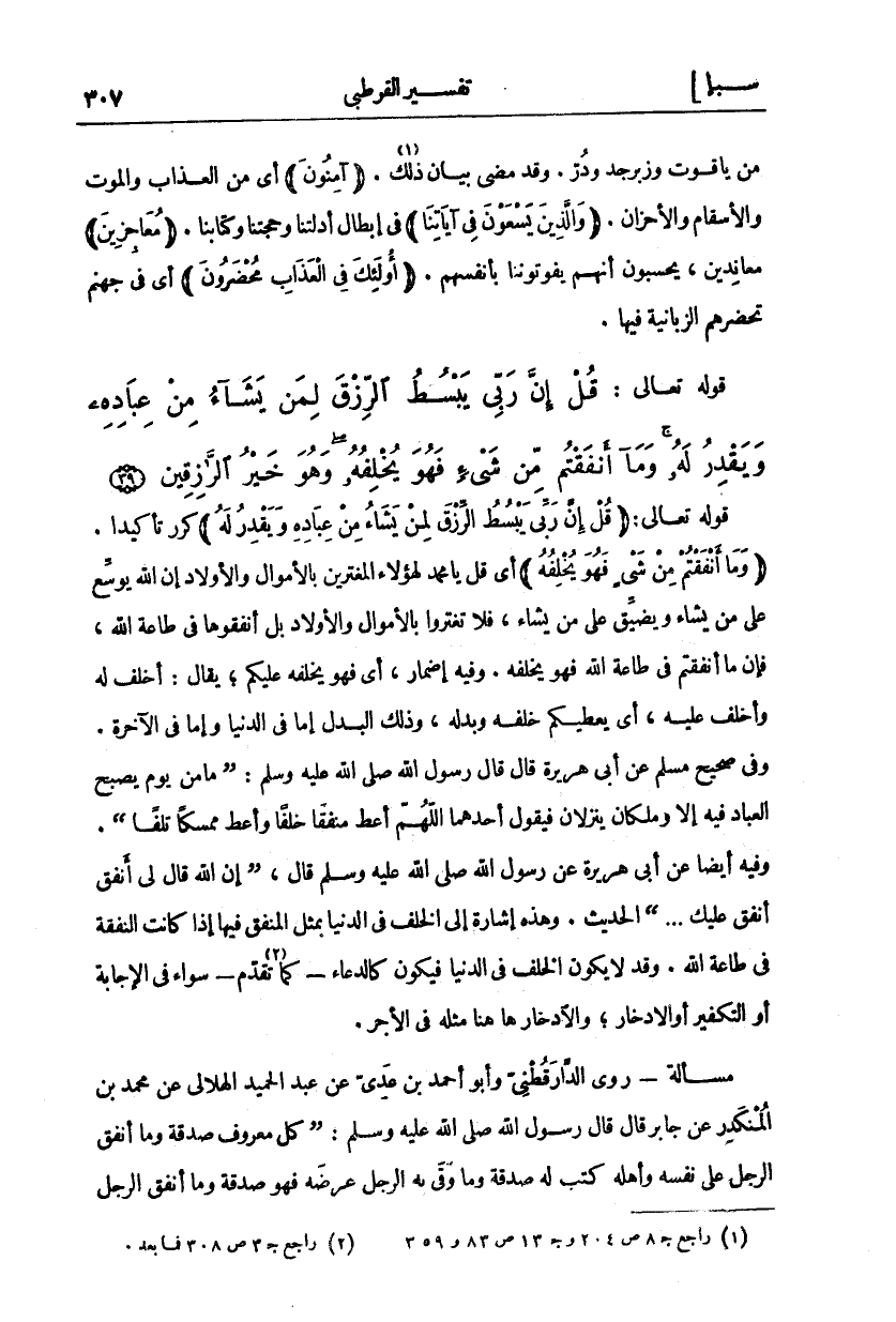 قَوْلُهُ تَعَالَى: (قُلْ إِنَّ رَبِّي يَبْسُطُ الرِّزْقَ لِمَنْ يَشاءُ مِنْ عِبادِهِ وَيَقْدِرُ لَهُ) كَرَّرَ تَأْكِيدًا. (وَما أَنْفَقْتُمْ مِنْ شَيْءٍ فَهُوَ يُخْلِفُهُ) أَيْ قُلْ يَا مُحَمَّدُ لِهَؤُلَاءِ الْمُغْتَرِّينَ بِالْأَمْوَالِ وَالْأَوْلَادِ إِنَّ اللَّهَ يُوَسِّعُ عَلَى مَنْ يَشَاءُ وَيُضَيِّقُ عَلَى مَنْ يَشَاءُ، فَلَا تَغْتَرُّوا بِالْأَمْوَالِ وَالْأَوْلَادِ بَلْ أَنْفِقُوهَا فِي طَاعَةِ اللَّهِ، فَإِنَّ مَا أَنْفَقْتُمْ فِي طَاعَةِ اللَّهِ فَهُوَ يُخْلِفُهُ. وَفِيهِ إِضْمَارٌ، أَيْ فَهُوَ يُخْلِفُهُ عَلَيْكُمْ، يُقَالُ: أَخْلَفَ لَهُ وَأَخْلَفَ عَلَيْهِ، أَيْ يُعْطِيكُمْ خَلَفَهُ وَبَدَلَهُ، وَذَلِكَ الْبَدَلُ إِمَّا فِي الدُّنْيَا وَإِمَّا فِي الْآخِرَةِ. وَفِي صَحِيحِ مُسْلِمٍ عَنْ أَبِي هُرَيْرَةَ قَالَ قَالَ رَسُولُ اللَّهِ صَلَّى اللَّهُ عَلَيْهِ وَسَلَّمَ: (مَا مِنْ يَوْمٍ يُصْبِحُ الْعِبَادُ فِيهِ إِلَّا وَمَلَكَانِ يَنْزِلَانِ فَيَقُولُ أَحَدُهُمَا اللَّهُمَّ أَعْطِ مُنْفِقًا خَلَفًا وَأَعْطِ مُمْسِكًا تَلَفًا (. وَفِيهِ أَيْضًا عَنْ أَبِي هُرَيْرَةَ عَنْ رَسُولِ اللَّهِ صَلَّى اللَّهُ عَلَيْهِ وَسَلَّمَ قَالَ،) إِنَّ اللَّهَ قَالَ لِي أَنْفِقْ أُنْفِقْ عَلَيْكَ ... (الْحَدِيثَ. وَهَذِهِ إِشَارَةٌ إِلَى الْخَلَفِ فِي الدُّنْيَا بِمِثْلِ الْمُنْفَقِ فِيهَا إِذَا كَانَتِ النَّفَقَةُ فِي طَاعَةِ اللَّهِ. وَقَدْ لَا يَكُونُ الْخَلَفُ فِي الدُّنْيَا فَيَكُونُ كَالدُّعَاءِ- كَمَا «٢» تَقَدَّمَ- سَوَاءٌ فِي الْإِجَابَةِ أَوِ التَّكْفِيرِ أو الادخار، والادخار ها هنا مِثْلُهُ فِي الْأَجْرِ. مَسْأَلَةٌ- رَوَى الدَّارَقُطْنِيُّ وَأَبُو أَحْمَدَ بْنُ عَدِيٍّ عَنْ عَبْدِ الْحَمِيدِ الْهِلَالِيِّ عَنْ مُحَمَّدِ بْنِ الْمُنْكَدِرِ عَنْ جَابِرٍ قَالَ قَالَ رَسُولُ اللَّهِ صَلَّى اللَّهُ عَلَيْهِ وَسَلَّمَ: (كُلُّ مَعْرُوفٍ صَدَقَةٌ وَمَا أَنْفَقَ الرَّجُلُ عَلَى نَفْسِهِ وَأَهْلِهِ كُتِبَ لَهُ صَدَقَةٌ وَمَا وَقَى بِهِ الرَّجُلُ عِرْضَهُ فَهُوَ صَدَقَةٌ وَمَا أَنْفَقَ الرجل