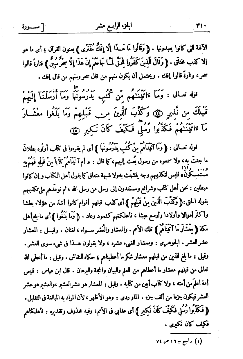 وَما آتَيْناهُمْ مِنْ كُتُبٍ يَدْرُسُونَها وَما أَرْسَلْنا إِلَيْهِمْ قَبْلَكَ مِنْ نَذِيرٍ (٤٤) وَكَذَّبَ الَّذِينَ مِنْ قَبْلِهِمْ وَما بَلَغُوا مِعْشارَ مَا آتَيْناهُمْ فَكَذَّبُوا رُسُلِي فَكَيْفَ كانَ نَكِيرِ (٤٥)
