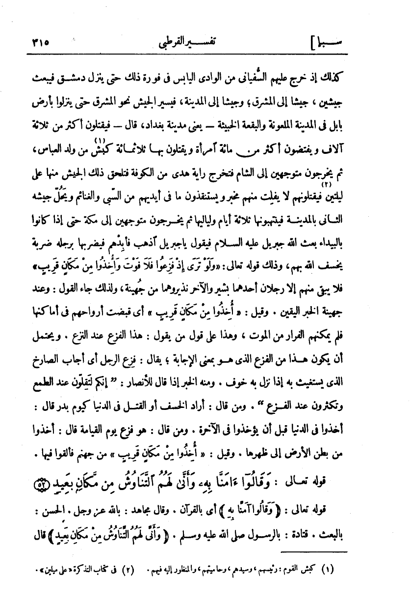كَذَلِكَ إِذْ خَرَجَ عَلَيْهِمُ السُّفْيَانِيُّ مِنَ الْوَادِي الْيَابِسِ فِي فَوْرَةِ ذَلِكَ حَتَّى يَنْزِلَ دِمَشْقَ فَيَبْعَثُ جَيْشَيْنِ جَيْشًا إِلَى الْمَشْرِقِ، وَجَيْشًا إِلَى الْمَدِينَةِ، فَيَسِيرُ الْجَيْشُ نَحْوَ الْمَشْرِقِ حَتَّى يَنْزِلُوا بِأَرْضِ بَابِلَ فِي الْمَدِينَةِ الْمَلْعُونَةِ وَالْبُقْعَةِ الْخَبِيثَةِ يَعْنِي مَدِينَةَ بَغْدَادَ، قَالَ- فَيَقْتُلُونَ أَكْثَرَ مِنْ ثَلَاثَةِ آلَافٍ وَيَفْتَضُّونَ أَكْثَرَ مِنْ مِائَةِ امْرَأَةٍ وَيَقْتُلُونَ بِهَا ثَلَاثَمِائَةِ كَبْشٍ «١» مِنْ وَلَدِ الْعَبَّاسِ، ثُمَّ يَخْرُجُونَ مُتَوَجِّهِينَ إِلَى الشَّامِ فَتَخْرُجُ رَايَةُ هُدًى مِنَ الْكُوفَةِ فَتَلْحَقُ ذَلِكَ الْجَيْشَ مِنْهَا عَلَى لَيْلَتَيْنِ «٢» فَيَقْتُلُونَهُمْ لَا يُفْلِتُ مِنْهُمْ مُخْبِرٌ وَيَسْتَنْقِذُونَ مَا فِي أَيْدِيهِمْ مِنَ السَّبْيِ وَالْغَنَائِمِ وَيَحُلُّ جَيْشُهُ الثَّانِي بِالْمَدِينَةِ فَيَنْتَهِبُونَهَا ثَلَاثَةَ أَيَّامٍ وَلَيَالِيهَا ثُمَّ يَخْرُجُونَ مُتَوَجِّهِينَ إِلَى مَكَّةَ حَتَّى إِذَا كَانُوا بِالْبَيْدَاءِ بَعَثَ اللَّهُ جِبْرِيلَ عَلَيْهِ السَّلَامُ فَيَقُولُ يَا جِبْرِيلُ اذْهَبْ فَأَبِدْهُمْ فَيَضْرِبُهَا بِرِجْلِهِ ضَرْبَةً يَخْسِفُ اللَّهُ بِهِمْ، وَذَلِكَ قَوْلُهُ تَعَالَى:" وَلَوْ تَرى إِذْ فَزِعُوا فَلا فَوْتَ وَأُخِذُوا مِنْ مَكانٍ قَرِيبٍ" فَلَا يَبْقَى مِنْهُمْ إِلَّا رَجُلَانِ أَحَدُهُمَا بَشِيرٌ وَالْآخَرُ نَذِيرٌ وَهُمَا مِنْ جُهَيْنَةَ، وَلِذَلِكَ جَاءَ الْقَوْلُ: وَعِنْدَ جُهَيْنَةَ الْخَبَرُ الْيَقِينُ وَقِيلَ:" أُخِذُوا مِنْ مَكانٍ قَرِيبٍ" أَيْ قُبِضَتْ أَرْوَاحُهُمْ فِي أَمَاكِنِهَا فَلَمْ يُمْكِنْهُمُ الْفِرَارُ مِنَ الْمَوْتِ، وَهَذَا عَلَى قَوْلِ مَنْ يَقُولُ: هَذَا الْفَزَعُ عِنْدَ النَّزْعِ. وَيَحْتَمِلُ أَنْ يَكُونَ هَذَا مِنَ الْفَزَعِ الَّذِي هُوَ بِمَعْنَى الْإِجَابَةِ، يُقَالُ: فَزِعَ الرَّجُلُ أَيْ أَجَابَ الصَّارِخَ الَّذِي يَسْتَغِيثُ بِهِ إِذَا نَزَلَ بِهِ خَوْفٌ. وَمِنْهُ الْخَبَرُ إِذْ قَالَ لِلْأَنْصَارِ: (إِنَّكُمْ لَتَقِلُّونَ عِنْدَ الطَّمَعِ وَتَكْثُرُونَ عِنْدَ الْفَزَعِ). وَمَنْ قَالَ: أَرَادَ الْخَسْفَ أَوِ الْقَتْلَ فِي الدُّنْيَا كَيَوْمِ بَدْرٍ قَالَ: أُخِذُوا فِي الدُّنْيَا قَبْلَ أَنْ يُؤْخَذُوا فِي الْآخِرَةِ. وَمَنْ قَالَ: هُوَ فَزَعُ يَوْمِ الْقِيَامَةِ قَالَ: أُخِذُوا مِنْ بَطْنِ الْأَرْضِ إِلَى ظَهْرِهَا. وَقِيلَ:" أُخِذُوا مِنْ مَكانٍ قَرِيبٍ" من جهنم فألقوا فيها.
