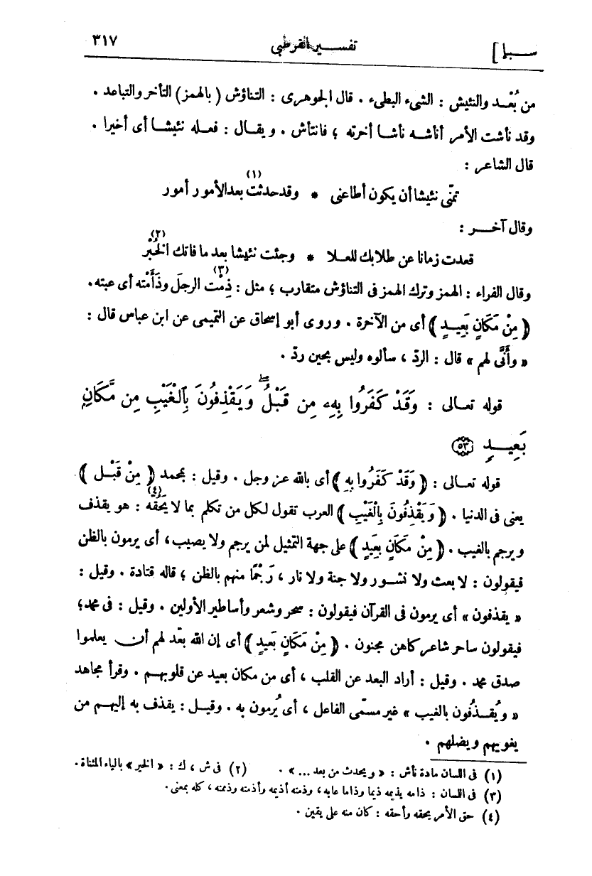 قَوْلُهُ تَعَالَى: (وَقَدْ كَفَرُوا بِهِ) أَيْ بِاللَّهِ عَزَّ وَجَلَّ وَقِيلَ: بِمُحَمَّدٍ (مِنْ قَبْلُ) يَعْنِي فِي الدُّنْيَا. (وَيَقْذِفُونَ بِالْغَيْبِ) الْعَرَبُ تَقُولُ لِكُلِ مَنْ تَكَلَّمَ بِمَا لَا يَحُقُّهُ «٤»: هُوَ يَقْذِفُ وَيَرْجُمُ بِالْغَيْبِ." مِنْ مَكانٍ بَعِيدٍ" عَلَى جِهَةِ التَّمْثِيلِ لِمَنْ يَرْجُمُ وَلَا يُصِيبُ، أَيْ يَرْمُونَ بِالظَّنِّ فَيَقُولُونَ: لَا بَعْثَ وَلَا نُشُورَ وَلَا جَنَّةَ وَلَا نَارَ، رَجْمًا منهم بالظن، قال قَتَادَةُ. وَقِيلَ:" يَقْذِفُونَ" أَيْ يَرْمُونَ فِي الْقُرْآنِ فَيَقُولُونَ: سِحْرٌ وَشِعْرٌ وَأَسَاطِيرُ الْأَوَّلِينَ. وَقِيلَ: فِي مُحَمَّدٍ، فَيَقُولُونَ سَاحِرٌ شَاعِرٌ كَاهِنٌ مَجْنُونٌ." مِنْ مَكانٍ بَعِيدٍ" أَيْ أَنَّ اللَّهَ بَعَّدَ لَهُمْ أَنْ يَعْلَمُوا صِدْقَ مُحَمَّدٍ. وَقِيلَ: أَرَادَ الْبُعْدَ عَنِ الْقَلْبِ، أَيْ مِنْ مَكَانٍ بَعِيدٍ عَنْ قُلُوبِهِمْ. وَقَرَأَ مُجَاهِدٌ" وَيُقْذَفُونَ بِالْغَيْبِ" غَيْرَ مُسَمَّى الْفَاعِلِ، أَيْ يُرْمَوْنَ بِهِ. وَقِيلَ: يَقْذِفُ بِهِ إليهم من يغويهم ويضلهم.